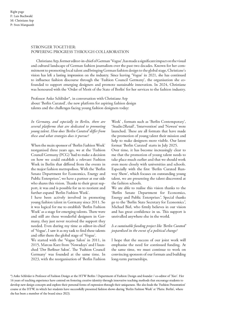 In its inaugural issue, XIER presents 16 promising fashion designers from various German fashion schools, curated for ‘Berlin Curated’ by the illustrious Christiane Arp, the former editor-in-chief of Vogue, along with Sonja Hodzode and Josepha Rodríguez. These talented individuals not only have their designs featured in the magazine but were also showcased on the ‘Berlin Curated Runway Show’ during Berlin Fashion Week on July 2, 2025.