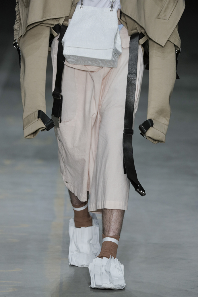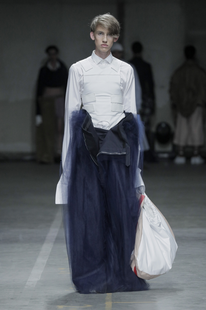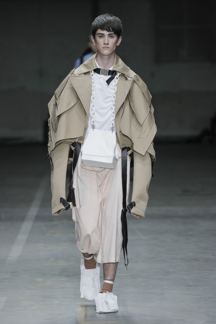 FC: I am telling the story of an individual who cares for one’s own son, I wanted to create garments that would meet the needs of a newborn baby. On his shoulders he has a baby backpack and wears everyday use fabrics such as denim, jersey, wool and gabardine cotton. The trench, the bomber and the pickot explode in large volumes wrapping the slim forms dressed in double pants. By creating a contrasting game, denim bermuda is superimposed on the classic white, gray and blue check, and the khaki chino on gray jersey mélange pants. By focusing on the convenience of clothing, smoking is finished with Velcro closures, while the warm English knit vest is combined with waterproof nylon trousers, typical of the sailor. Recalling at birth, jersey bodies are used symbolically as the first garments worn by newborns. The meshes are cut for convenience at the nipple height and inserted the breast pump.