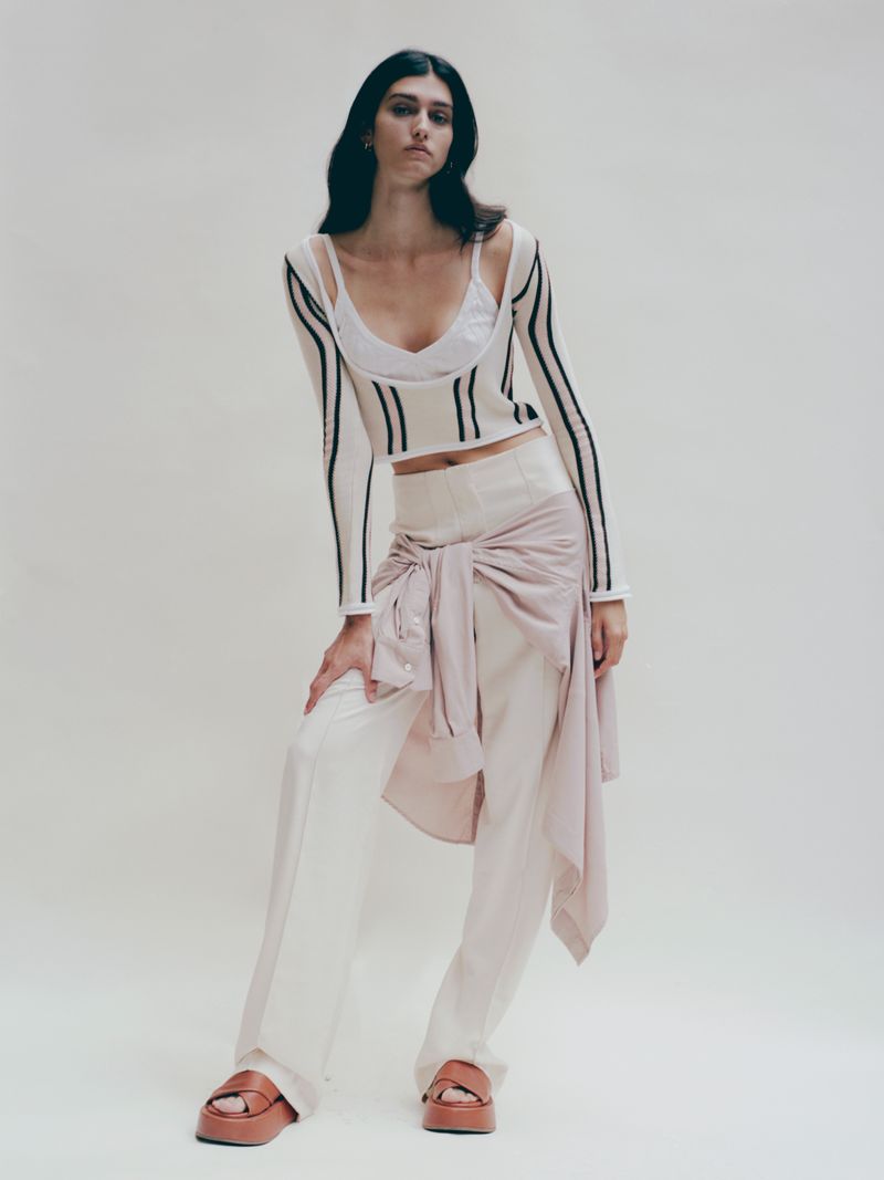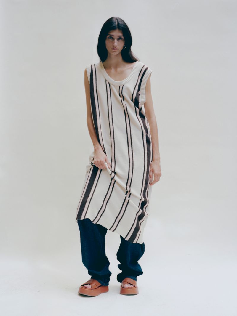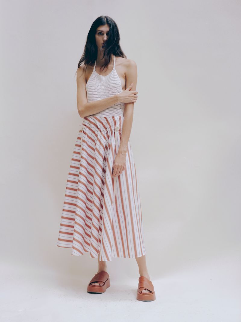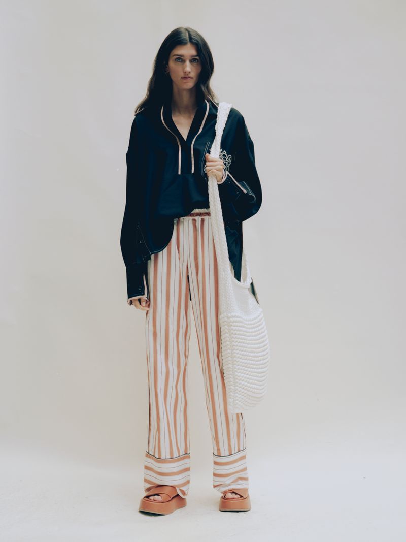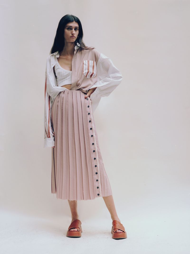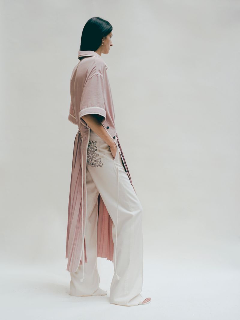 Through the realization of this capsule collection Federico Cina relives his childhood: striped bed sheets, folded curtains, colored tiles. The use of pastel colors together with familiar patterns make these creations more romantic and nostalgic. At the same time, they become lighter thanks to the many creases and openings on the side allowing a new interpretation.