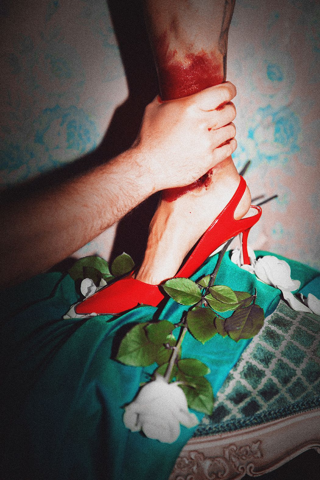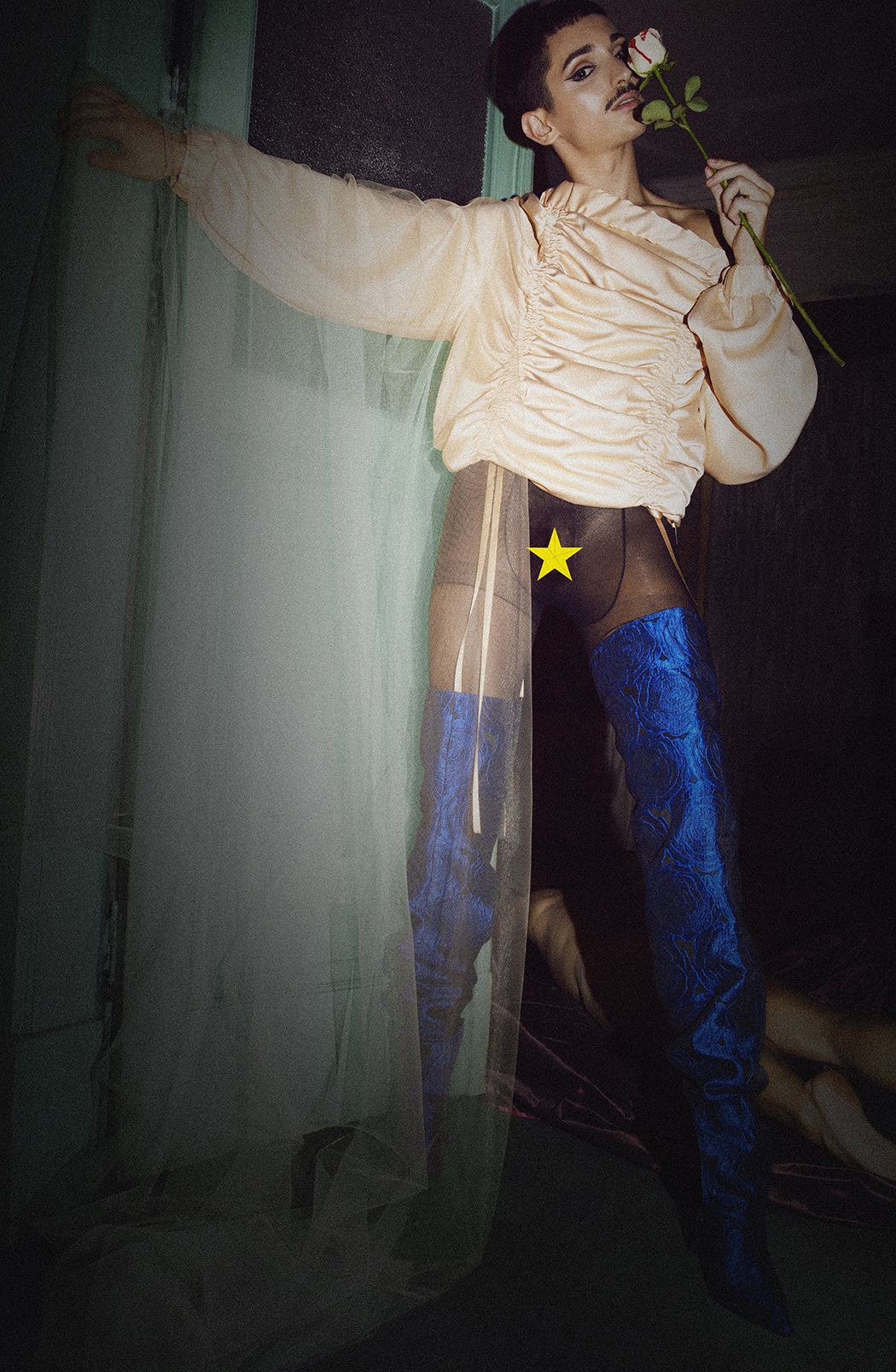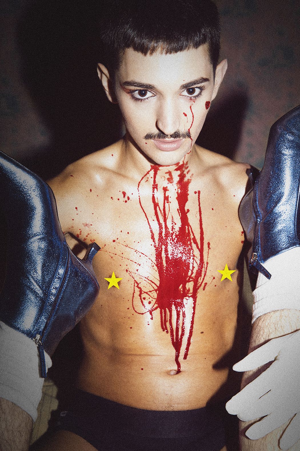 A KALTBLUT exclusive. Photography by Tiago Aguiart. Model is Fábio Valente. Styling and Creative Direction by Diogo Pinto. Grooming by Bruno Bessa Cruz. Make up by Cat Pinto. “In this story, I tried to explore the cliché plot of a newly married couple on their honeymoon with the murder twist, but making it queer and applying the parallels between a young and femme boy and an older and “masculine” counterpart. This created a platform that allowed me to use the story as a critic of the binary way to act and dress that society forces upon people and as critic to the toxic masculinity in the gay community, starting with the name, femme4femme, as a response to the ‘masc4masc’ culture. Aesthetic-wise, I was inspired by the horror movie ‘Psycho’, Rihanna’s ‘BBHMM’ music video, Palomo Spain collections and queer culture and fashion. ” says Diogo Pinto.
