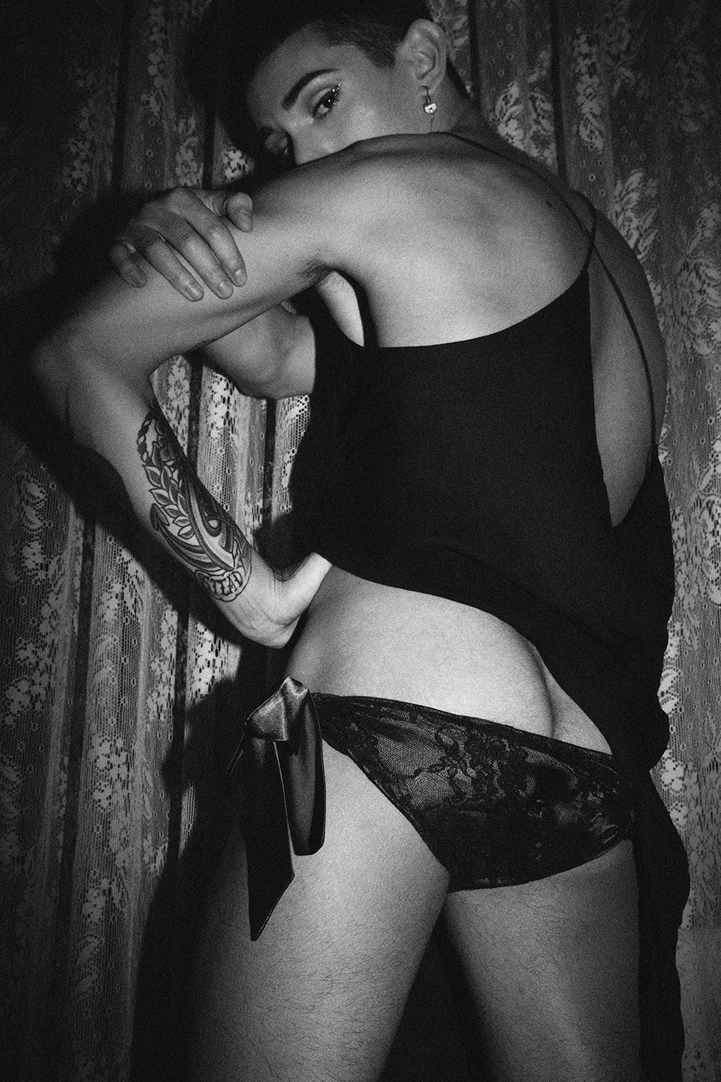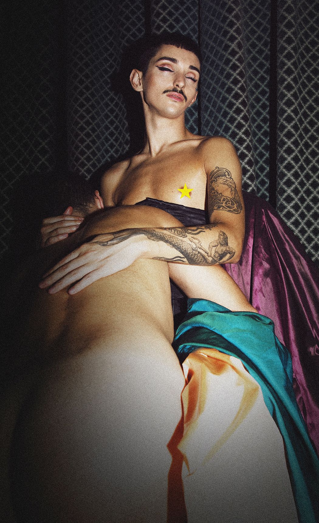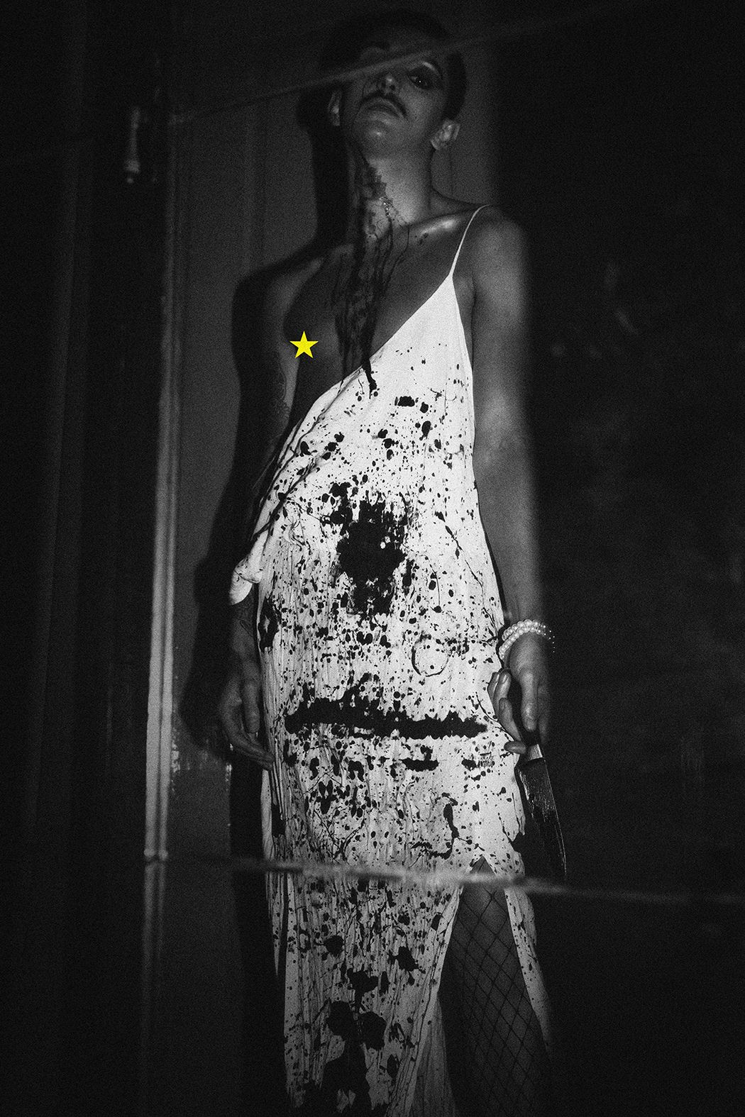 A KALTBLUT exclusive. Photography by Tiago Aguiart. Model is Fábio Valente. Styling and Creative Direction by Diogo Pinto. Grooming by Bruno Bessa Cruz. Make up by Cat Pinto. “In this story, I tried to explore the cliché plot of a newly married couple on their honeymoon with the murder twist, but making it queer and applying the parallels between a young and femme boy and an older and “masculine” counterpart. This created a platform that allowed me to use the story as a critic of the binary way to act and dress that society forces upon people and as critic to the toxic masculinity in the gay community, starting with the name, femme4femme, as a response to the ‘masc4masc’ culture. Aesthetic-wise, I was inspired by the horror movie ‘Psycho’, Rihanna’s ‘BBHMM’ music video, Palomo Spain collections and queer culture and fashion. ” says Diogo Pinto.