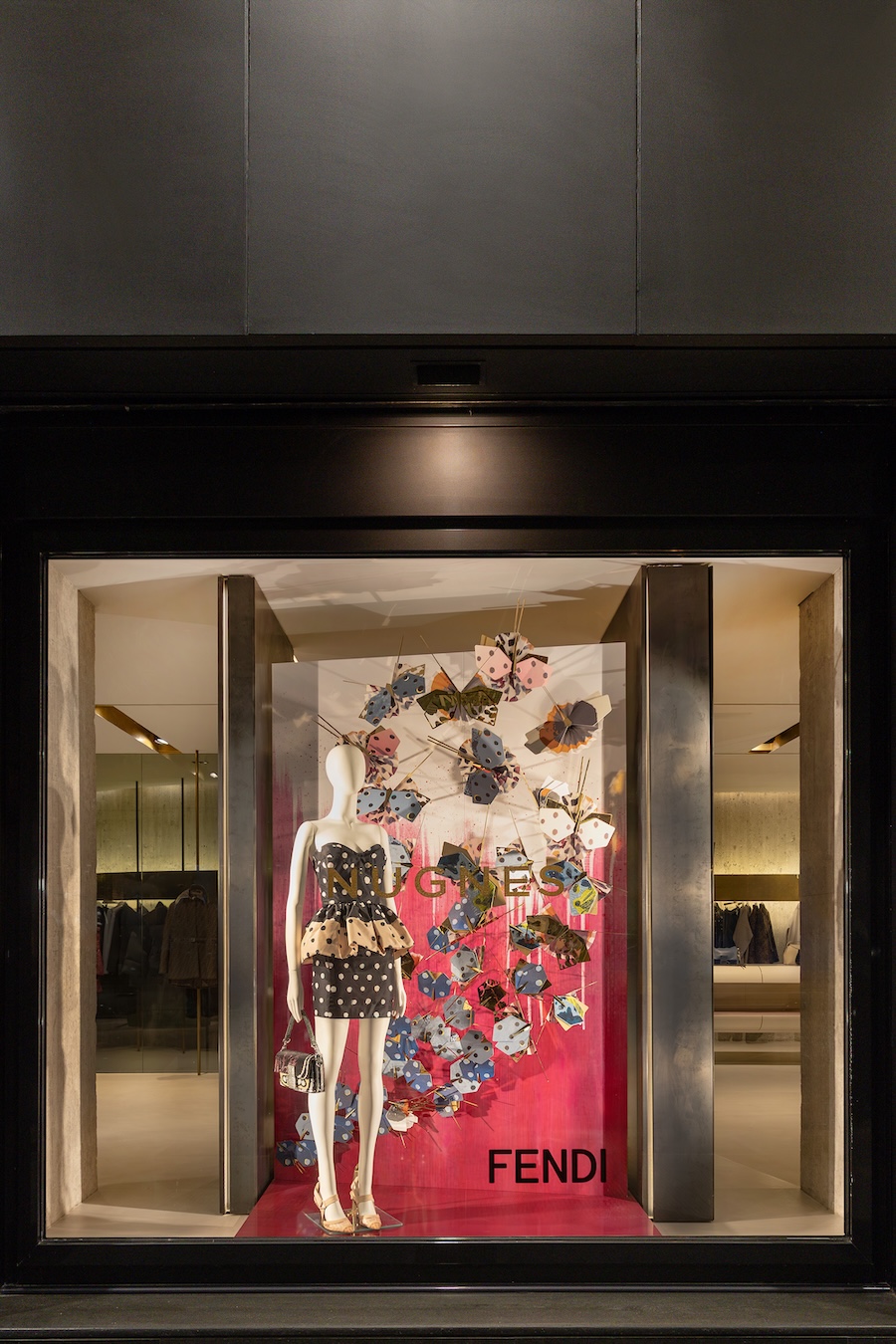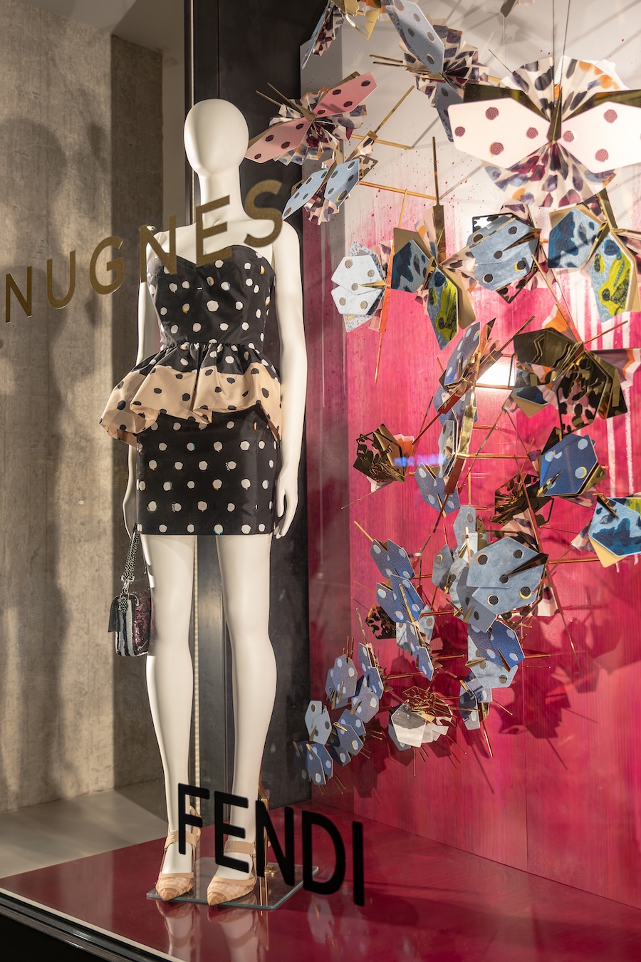 A striking window display featured a mannequin in a black-and-beige polka-dot strapless dress, surrounded by colourful umbrellas, embodying the “social butterflies” theme of the SS 2026 collection. The visual display, a combination of disco-inspired hues such as turquoise, mandarin, and powder pink, highlighted the balance between elegance and playful 1980s inspiration.
