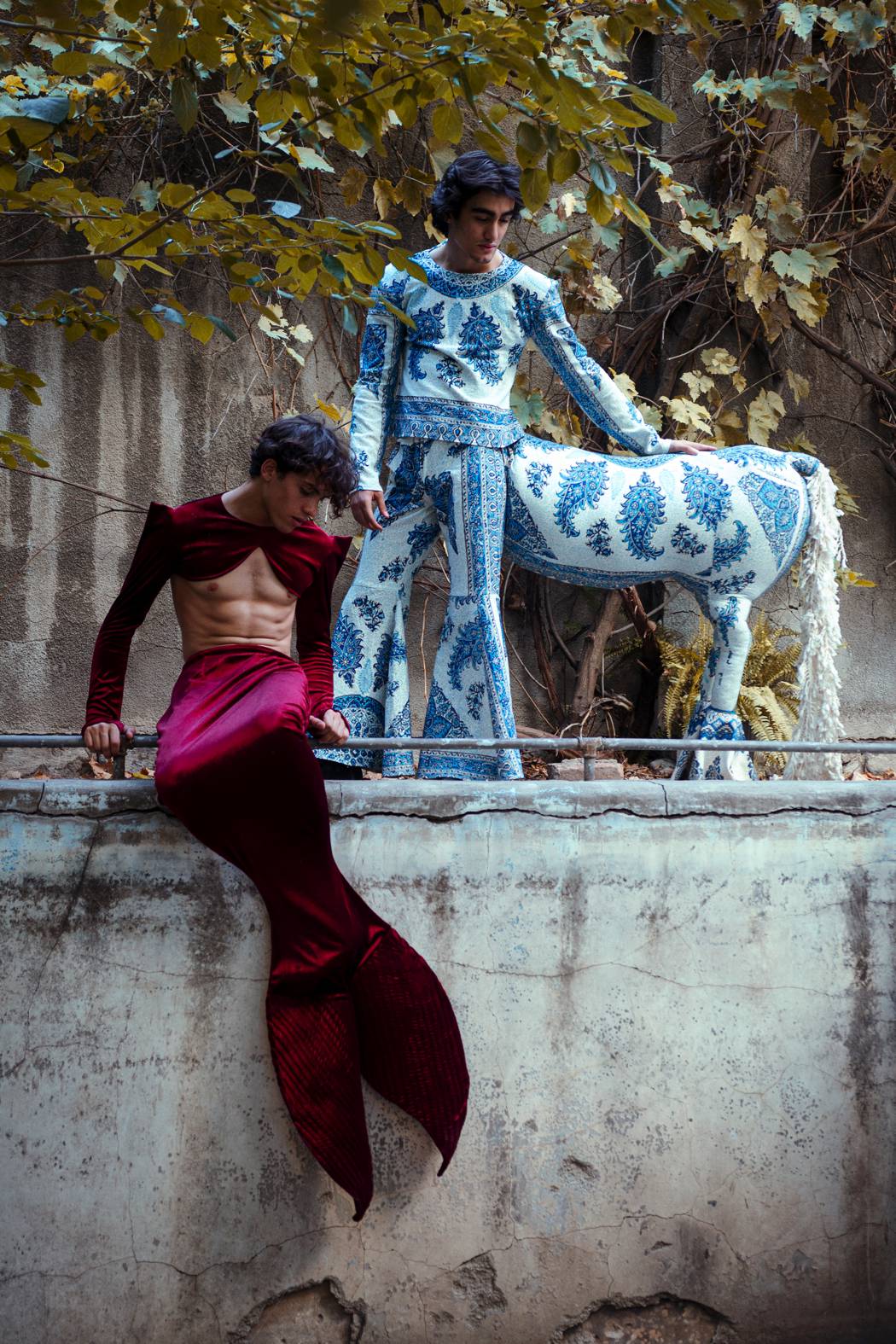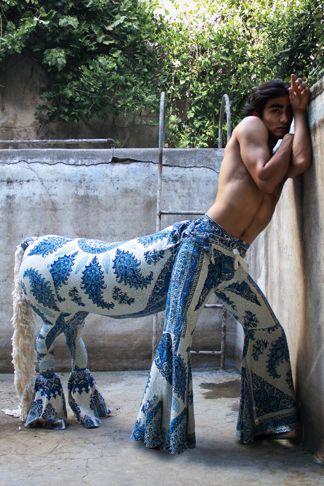 Traditionally Iranian culture has been patriarchal with the father or the husband at the head of the family and household. ... The patriarchal system involves the control of both wives and children by the husband or the father and in their absence by other male relatives For this reason, everything except the definition of masculinity desired by a patriarchal society is isolated, I used fabrics that had different uses, each of which was a sign of patriarchy, and showed the stereotypical masculinity in society in a different way. And by using Mythical creature like Centaur and Mermaid, I wanted to point out that gender definitions is completely imaginary and only cause resentment and hatred to spread among humans.