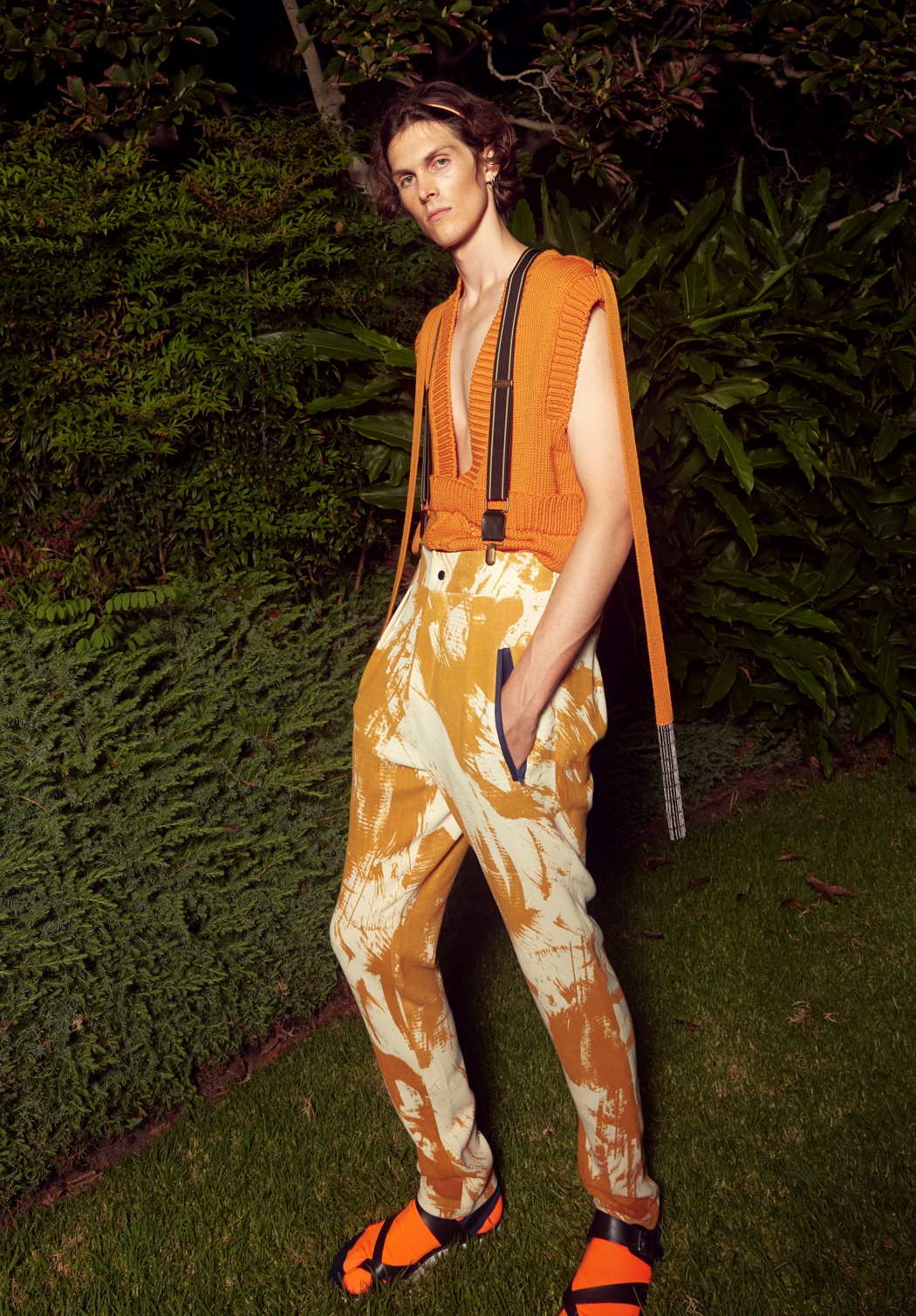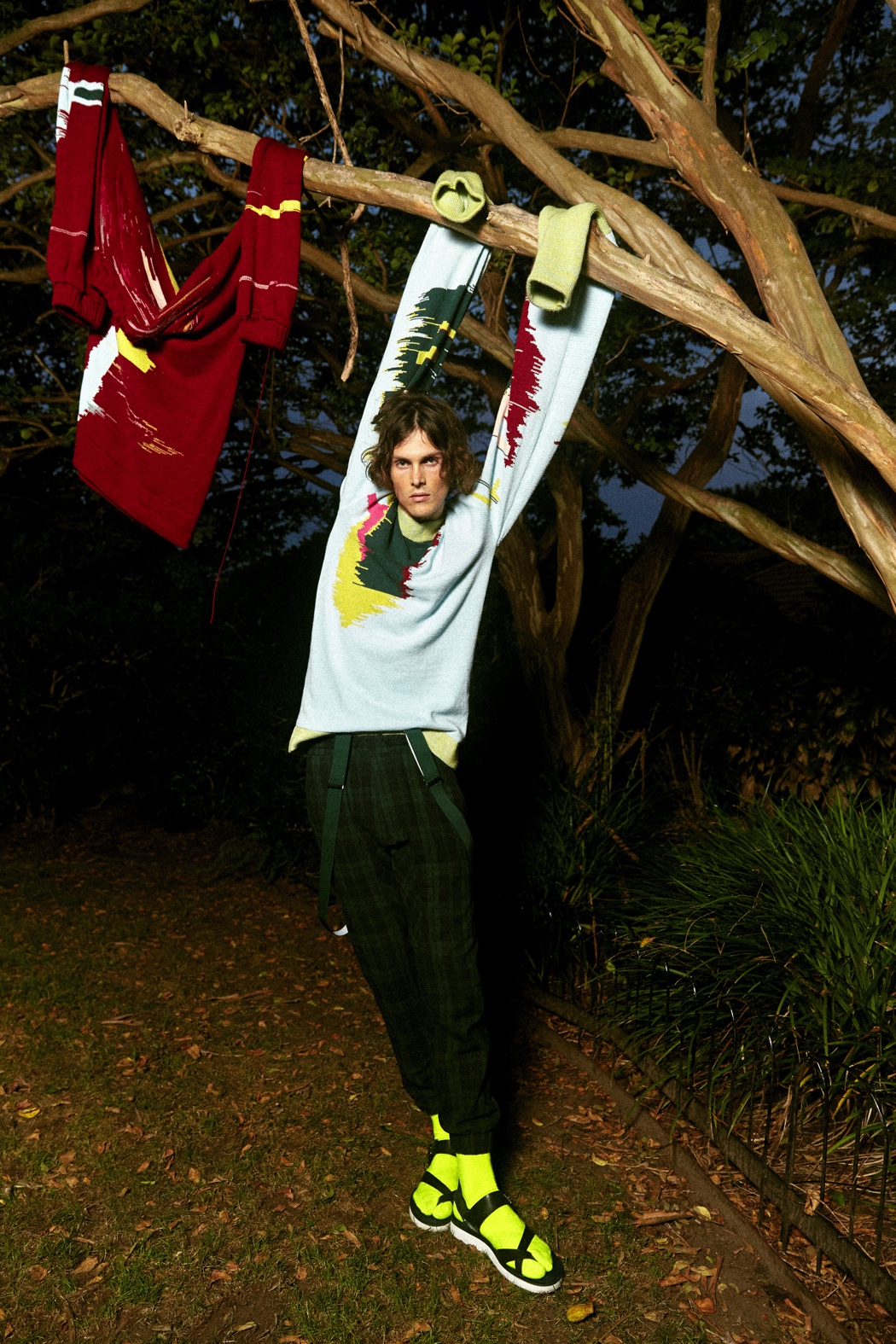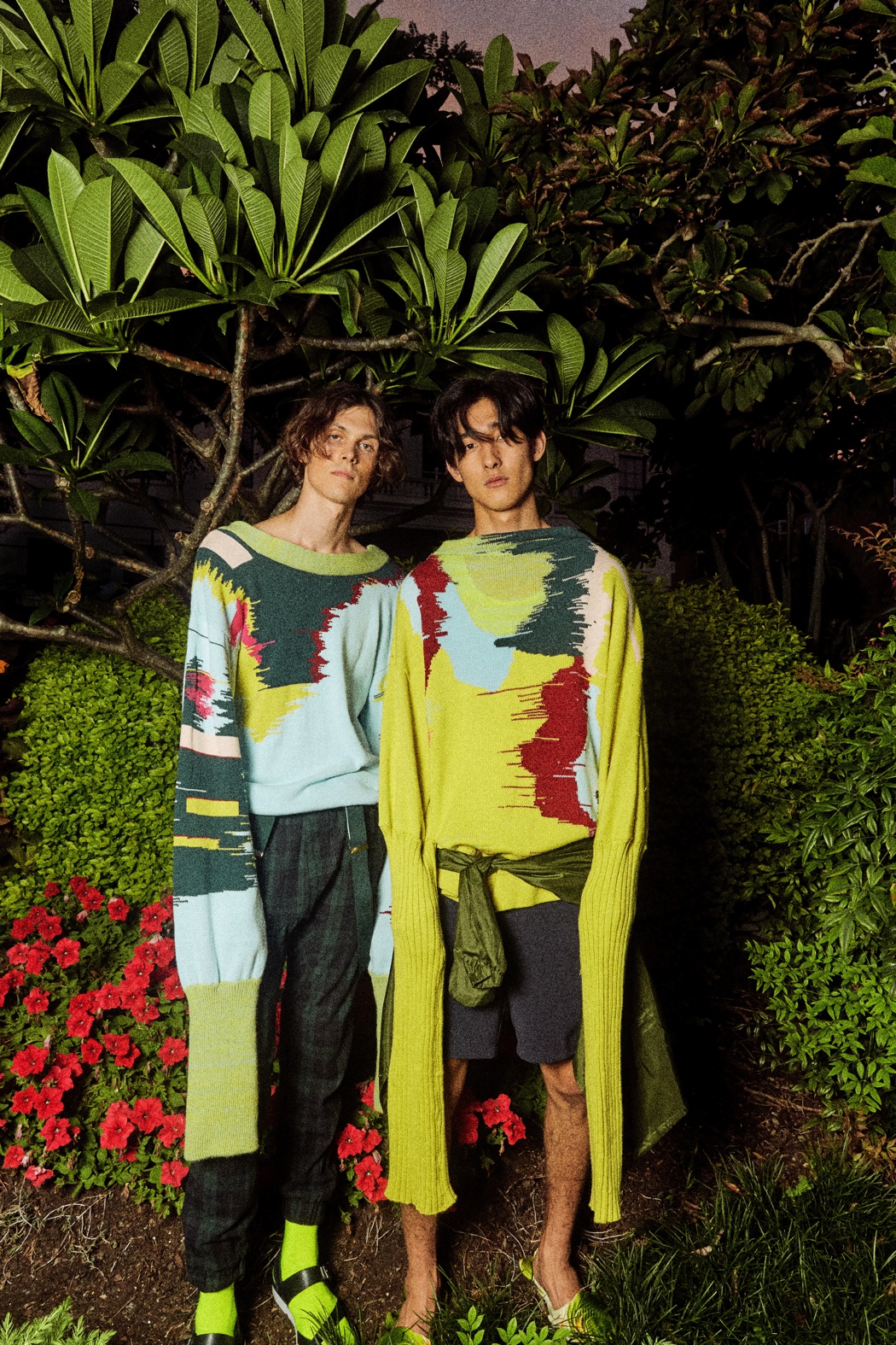 John wears: es knitwear jumper, PJ Drake pant, The Strand Hatters braces, Aquila sandals. Kevin wears: es knitwear jumper, Aydin Was Here shorts, Champion jacket. John wears: Chris Ran Lin vest, Aydin Was Here pant, The Strand Hatters braces, Aquila sandals