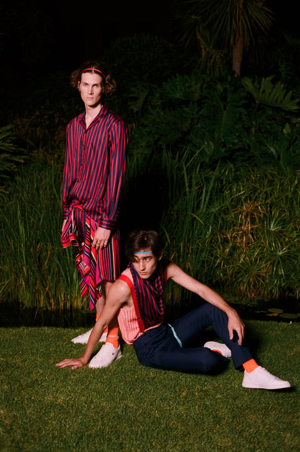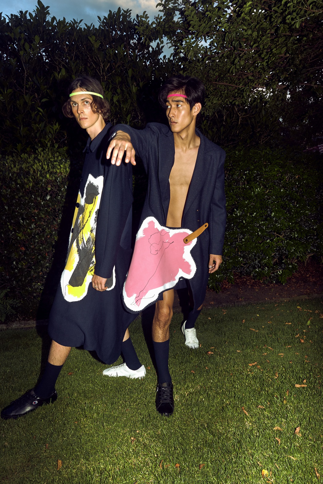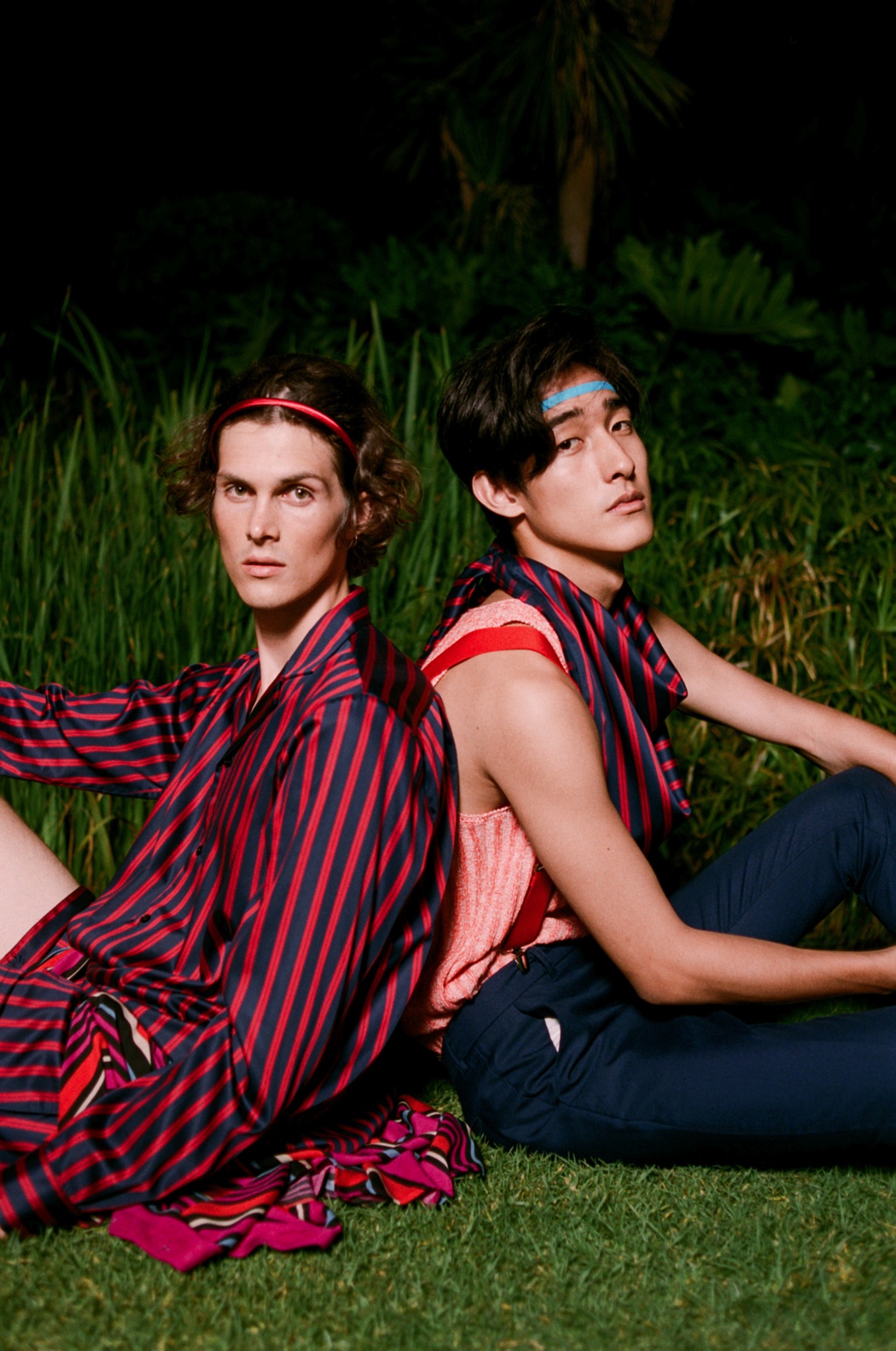 John wears: Chris Ran Lin tops & shorts, Champion sneakers. Kevin wears: Chris Ran Lin top, scarf, tassle & pant, The Strand Hatters braces, Champion sneaker.s