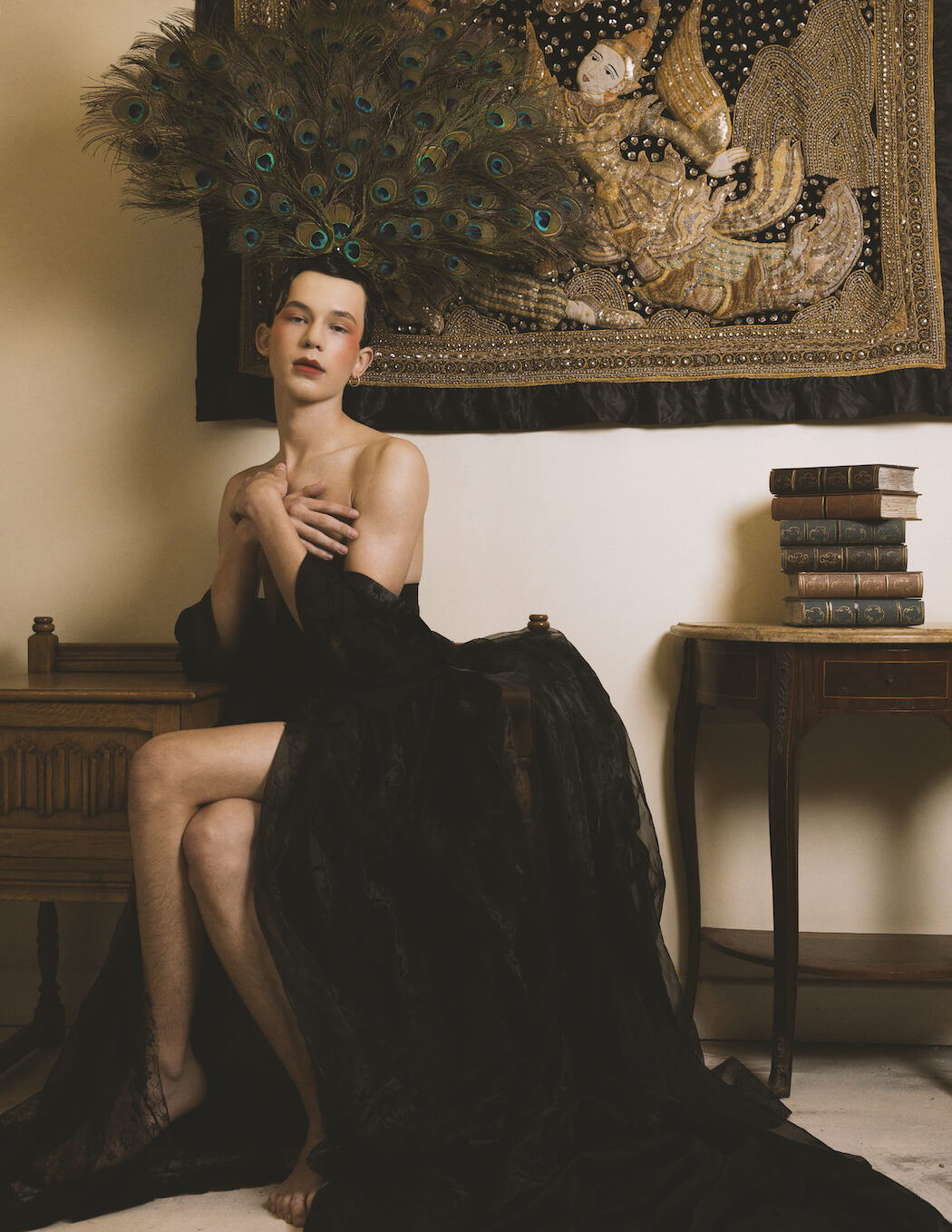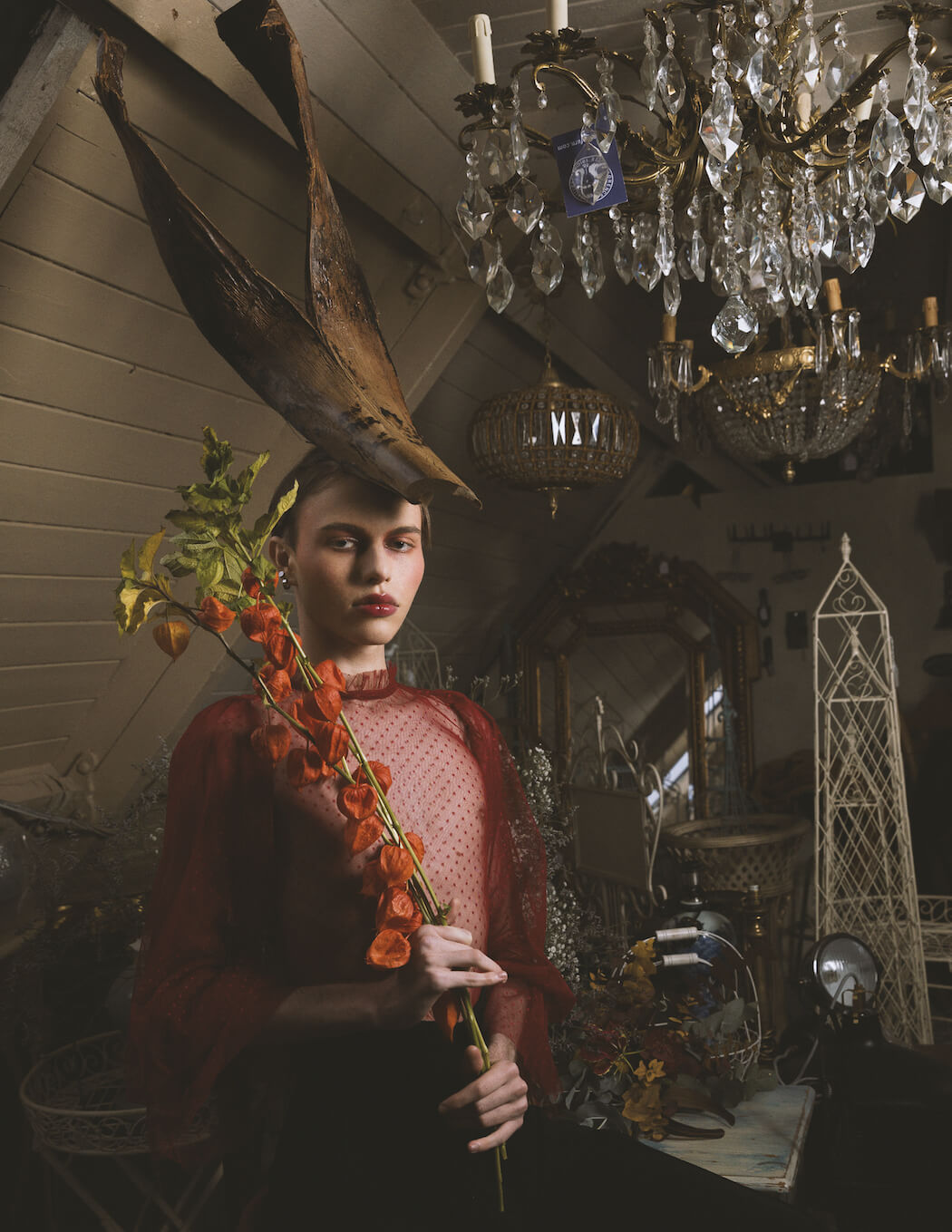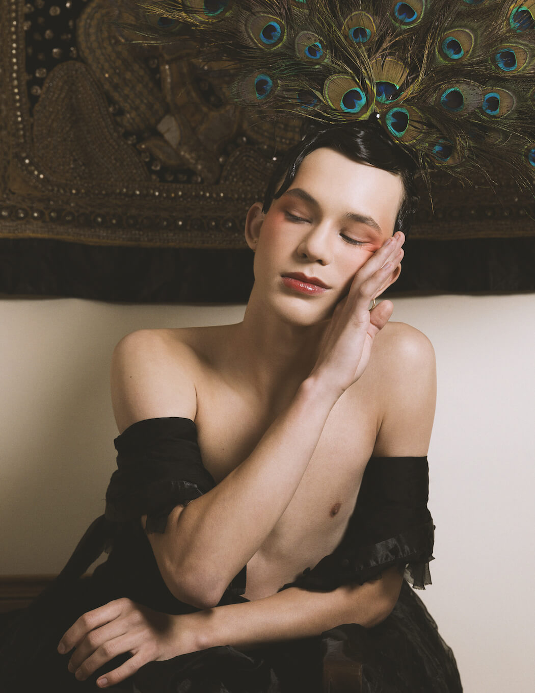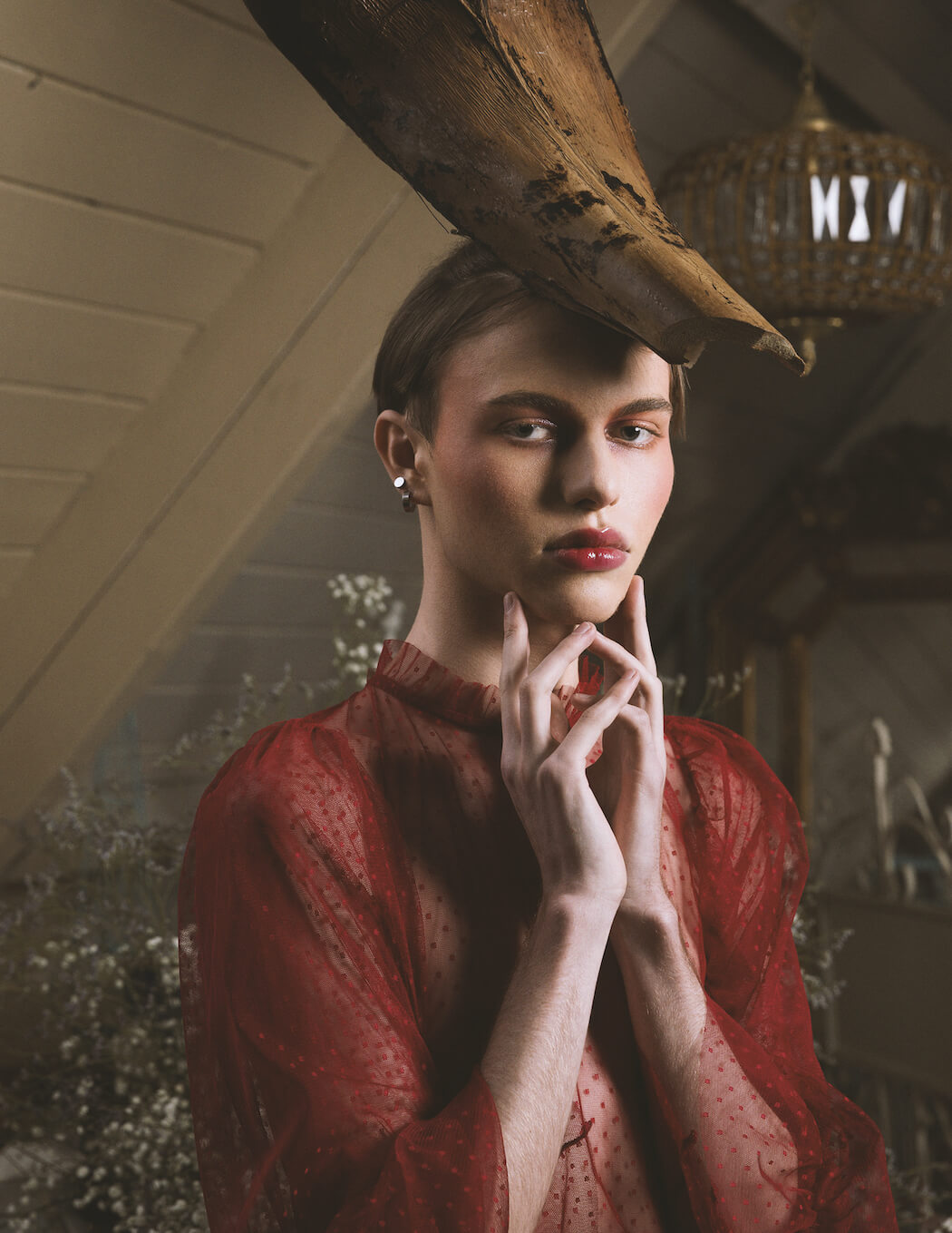 Choosing to style my models in vintage feminine outfits combined with delicate make up I wanted to give them freedom of fully expressing themselves and being able to shift their energy between masculine and feminine. It was really important to me to be able to capture in these pictures not only a physical but also an emotional shift. The location choice of antique store to frame my story allows me to show the imperceptible harmony between the contrast of new, fresh and young, and old, sophisticated and soulful.”