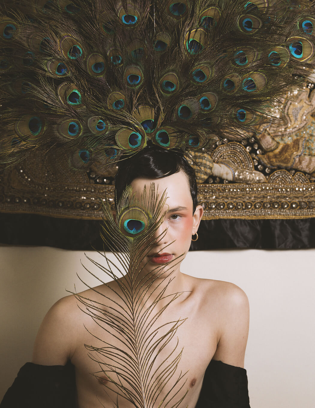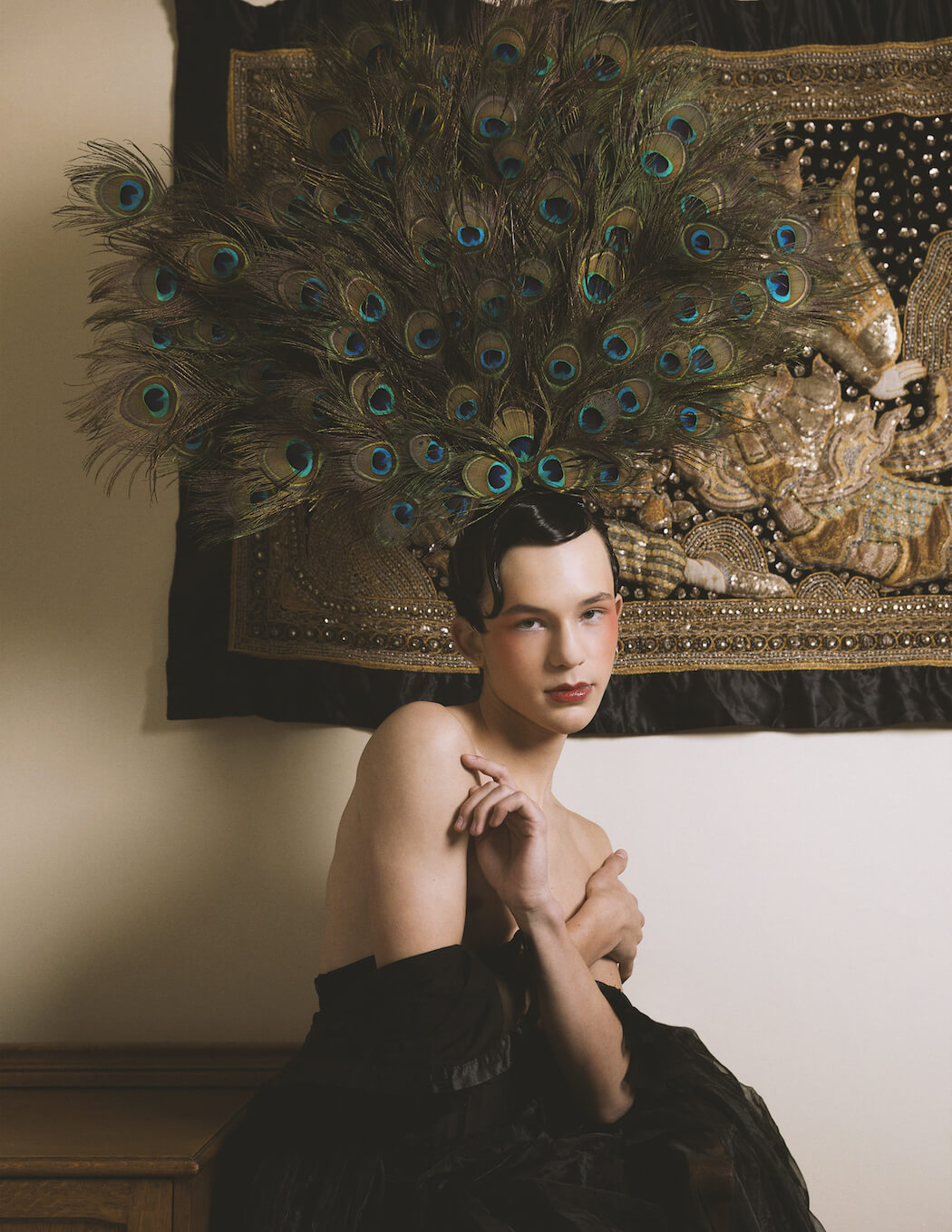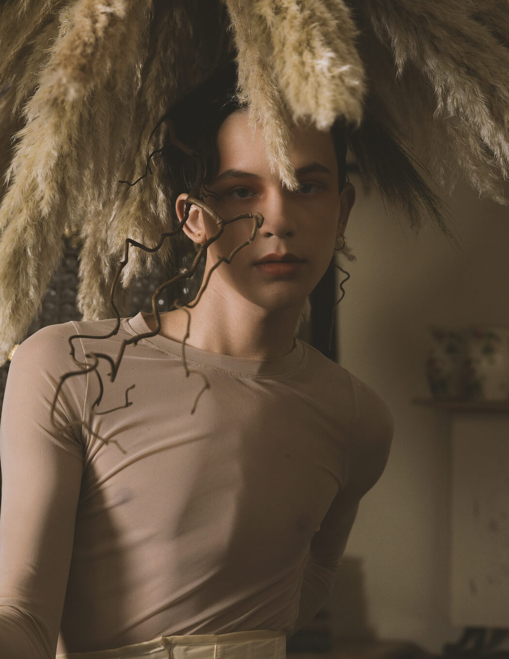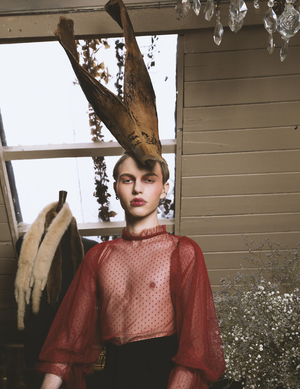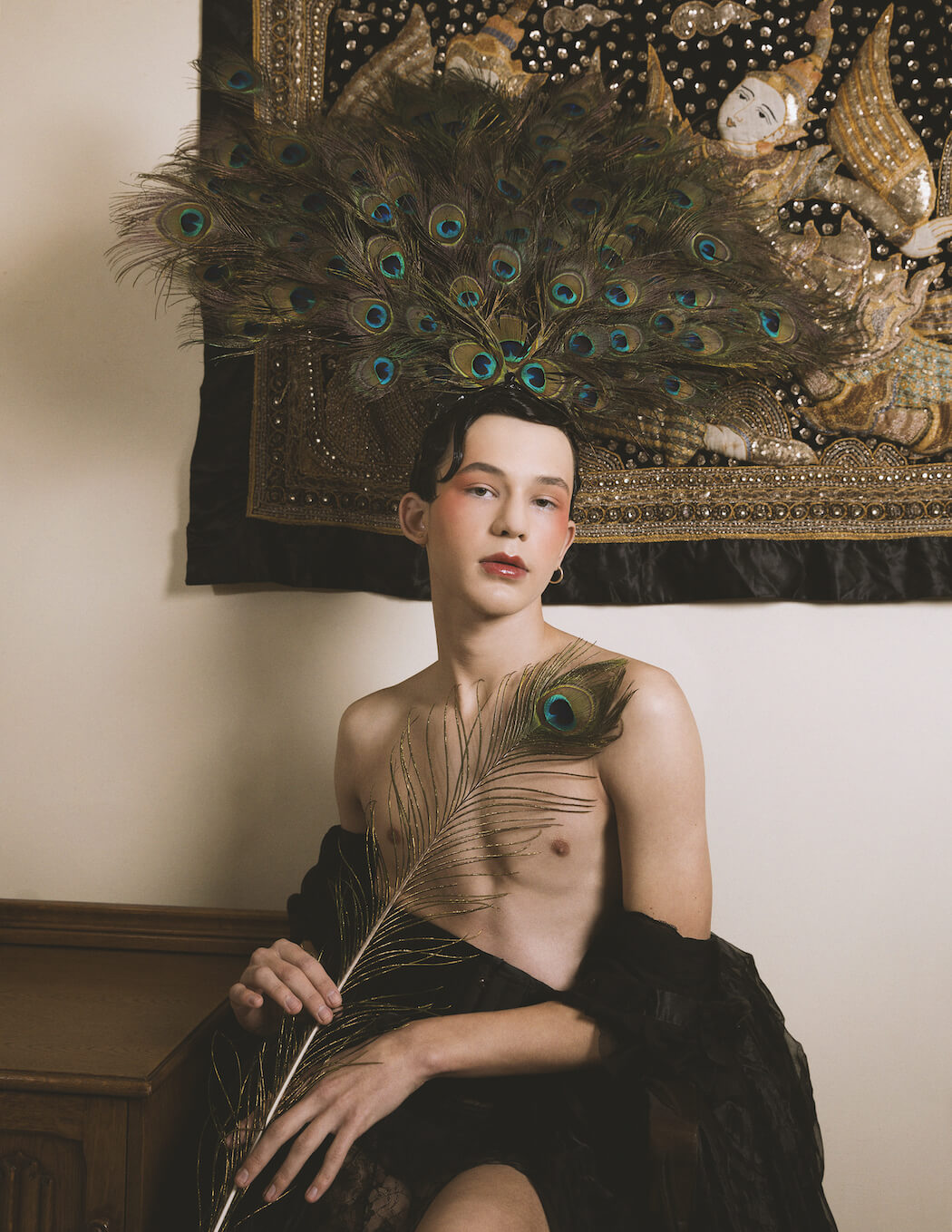 Choosing to style my models in vintage feminine outfits combined with delicate make up I wanted to give them freedom of fully expressing themselves and being able to shift their energy between masculine and feminine. It was really important to me to be able to capture in these pictures not only a physical but also an emotional shift. The location choice of antique store to frame my story allows me to show the imperceptible harmony between the contrast of new, fresh and young, and old, sophisticated and soulful.”