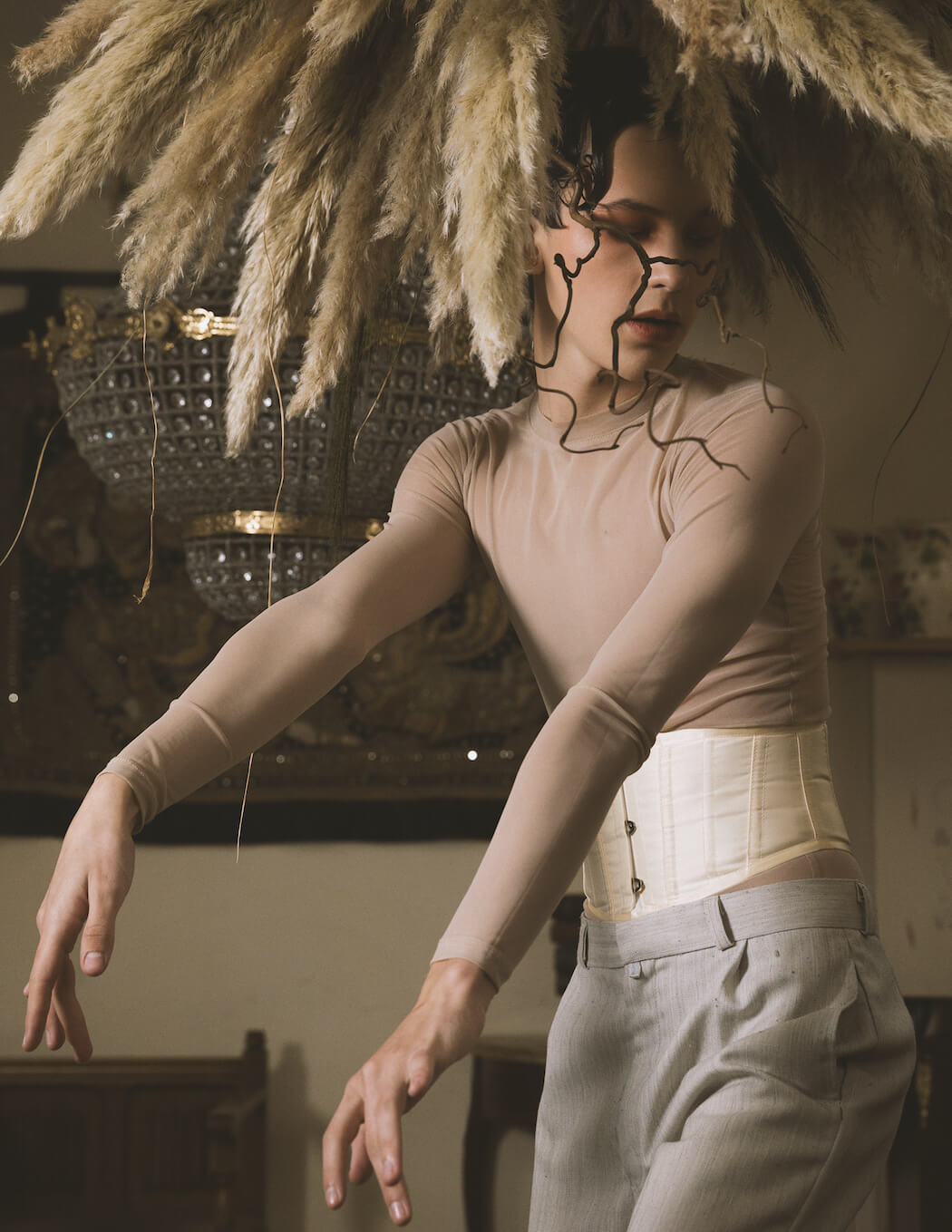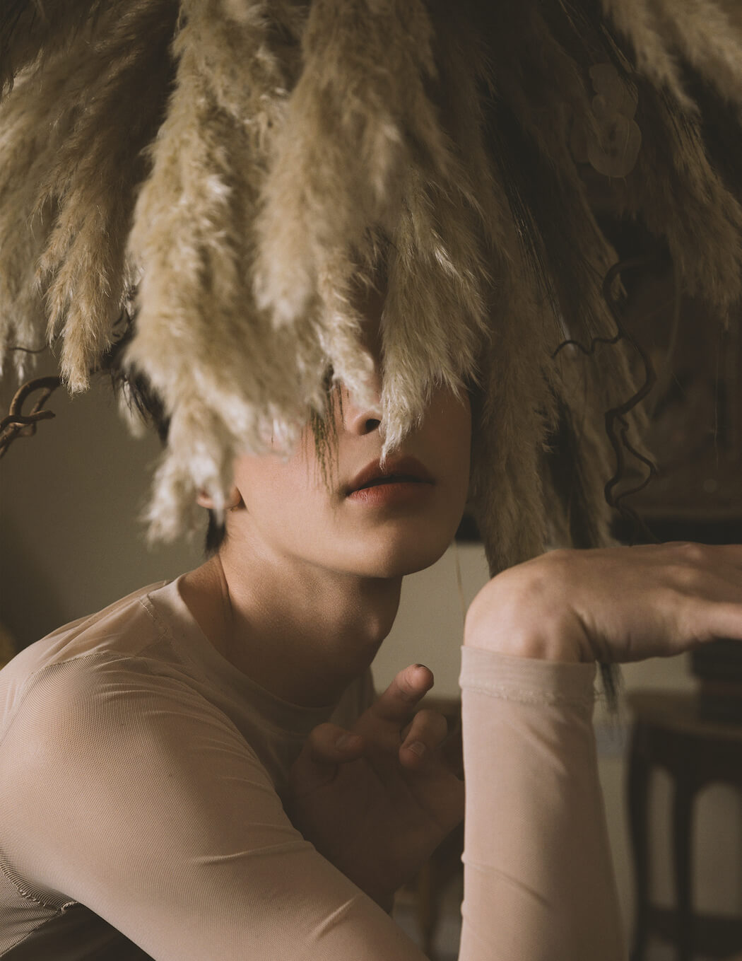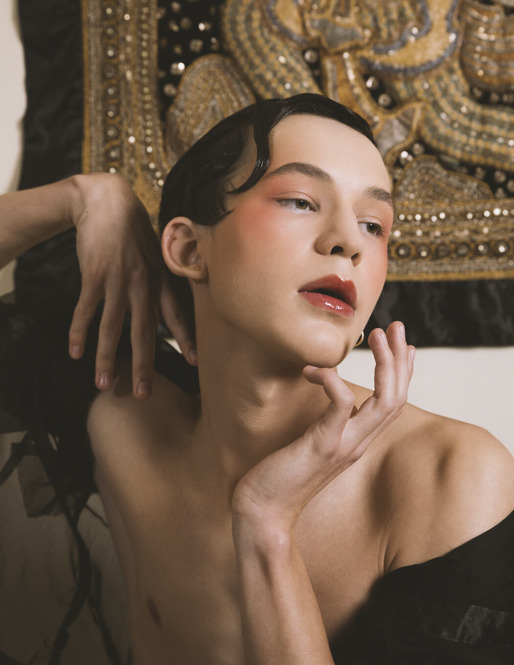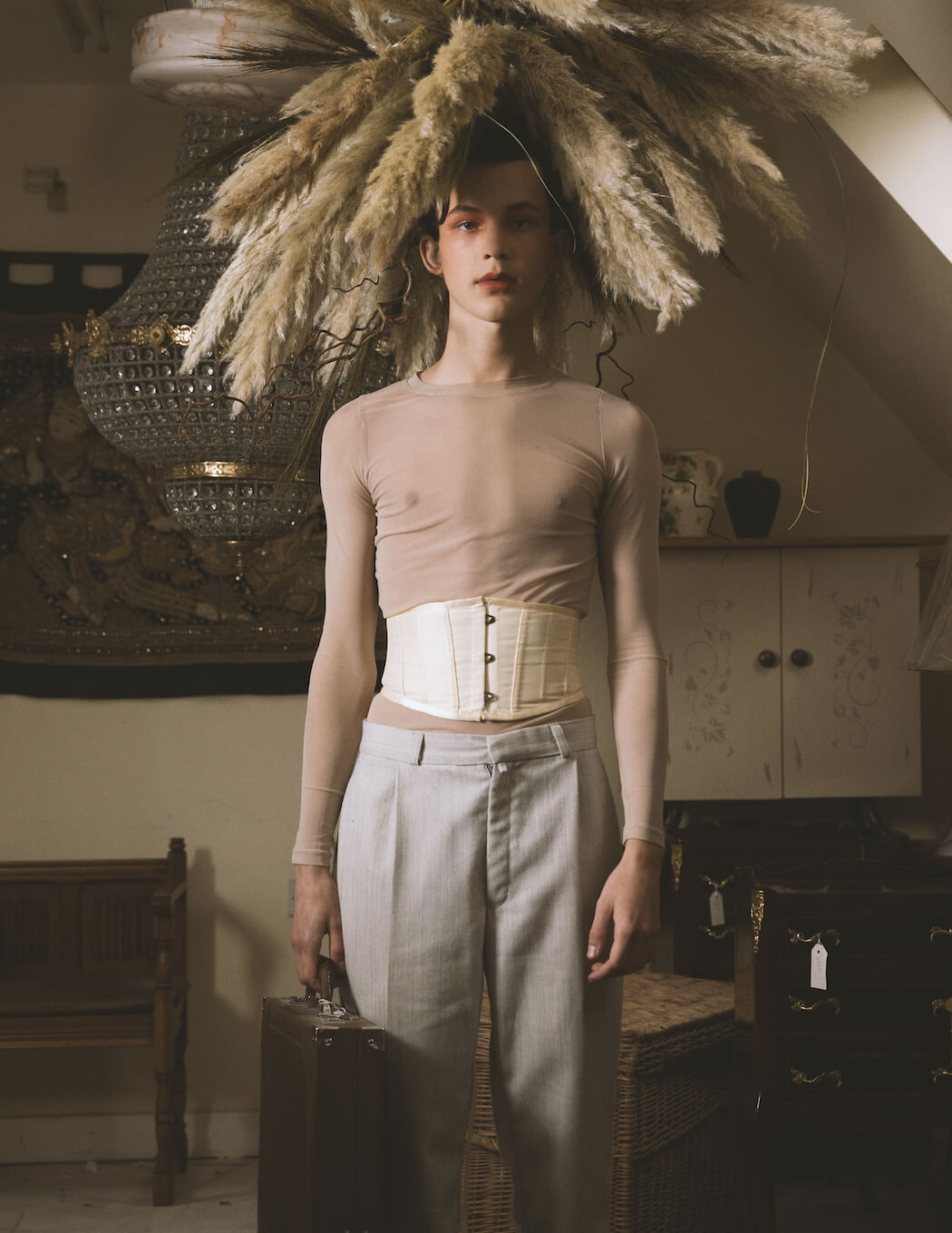 Choosing to style my models in vintage feminine outfits combined with delicate make up I wanted to give them freedom of fully expressing themselves and being able to shift their energy between masculine and feminine. It was really important to me to be able to capture in these pictures not only a physical but also an emotional shift. The location choice of antique store to frame my story allows me to show the imperceptible harmony between the contrast of new, fresh and young, and old, sophisticated and soulful.”