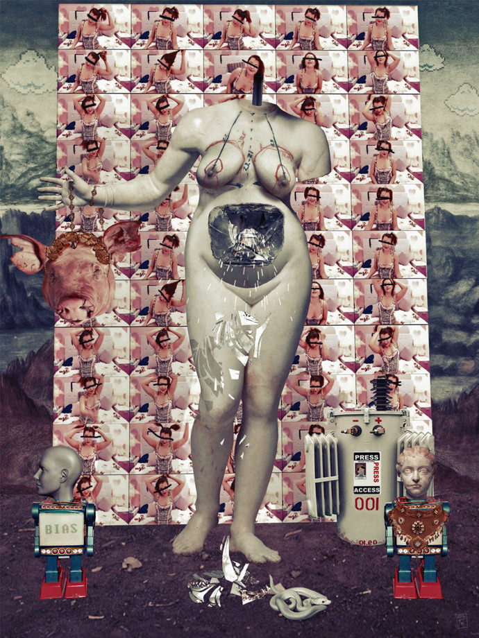 His works can be labeled as Objective-Simulacrum (substituting signs for “the real itself”), this while directing a vector to Truth as his muse. Often visited themes are the interaction of divergent ideologies and worlds: Institutional/high with outsider/low art, ultra luxury and fashion with gross poverty, media obsession with deep introspection, wickedness with innocence, beauty with ugliness. Aesthetically, he finds himself in the same school as Bacon and McQueen through how they evoked awe through the unsettling; but he also echo’s Klimt, Grosz, Etro and P. Dumas of Hermès fame, with how he jams visual data into every point/pixel per inch. As for process, his pieces are often intertextual, implementing collage, painting, illustration and digital form. Though in a global sense he has remained rather private until now, he is also an Author, Poet, Musician, Fashion influencer and burgeoning Public Intellectual. He holds a degree in Critical theory and Public Relations.