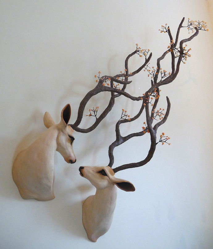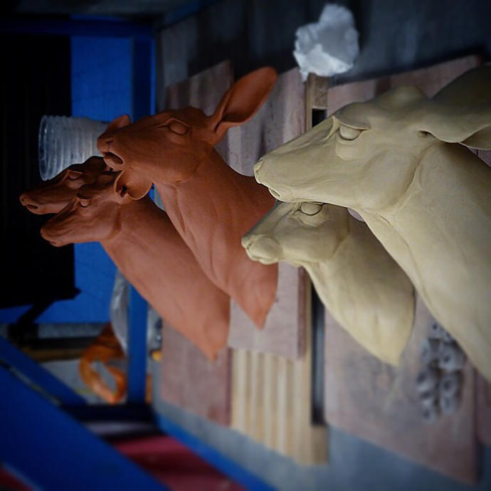 Natasha: From my initial concept and sketches I research certain elements to help develop these aspects. I make small test pieces of certain elements of design too. I always try think ahead with planning and design in hope to preempt any possible problems. The clay work is done first, sculpted on an armature or backing board if needed. Then hollowed, reassembled, cleaned up and fired. Antler armatures, fibreglass, resin, wood or whatever other material processes are normally done after. The finishing process, such as assembling, sculpt fixings, and touch ups, happen along the way. I often work between two different sculptures at a time.