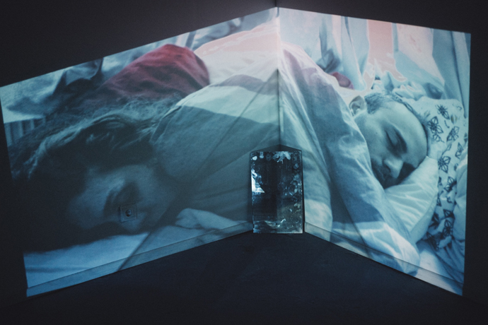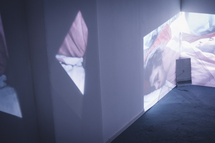 Stephanie Ballantine: For the Love is exhibition Zack and I made an installation in the downstairs part of the gallery- which was dark, no windows and small. We projected a split screen with both of us sleeping and I created a sound piece which is a mix of different advice self – help guides on relationships. It was a kind of home with the big Other looking over us… entering our dreams and manipulating our consciousnesses… the relationship needs fixing! Don’t think about the inequalities and wars we need to protest!…some how the cyber media voice world comes into the home comforting us, and drugging us.…