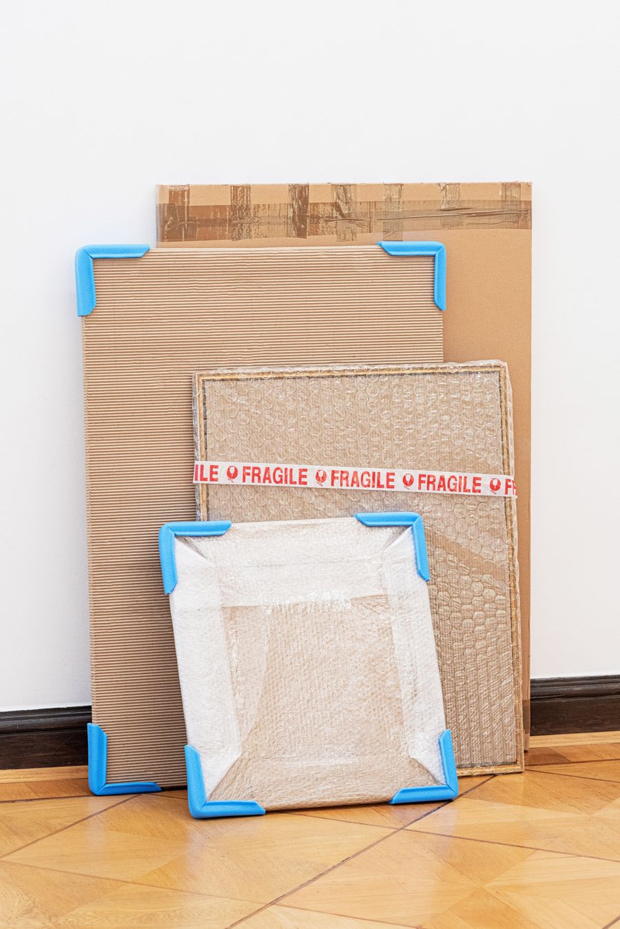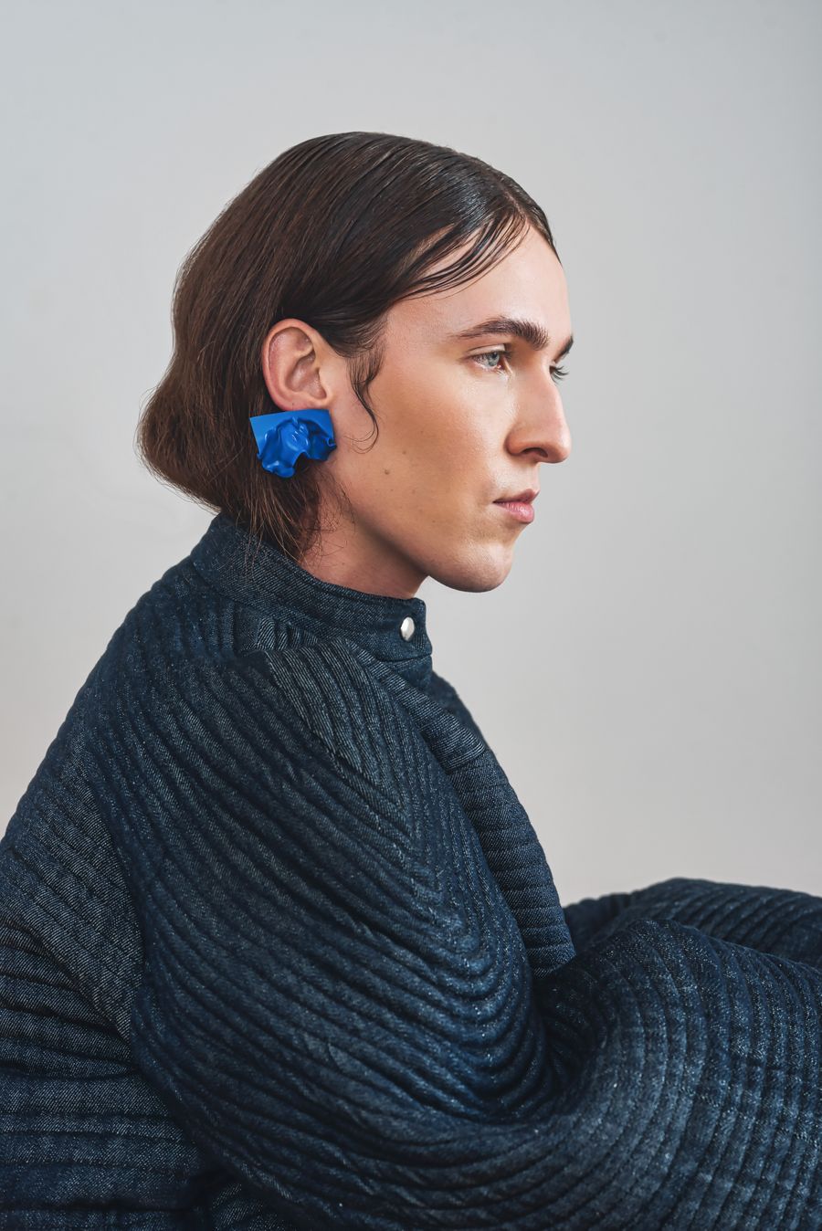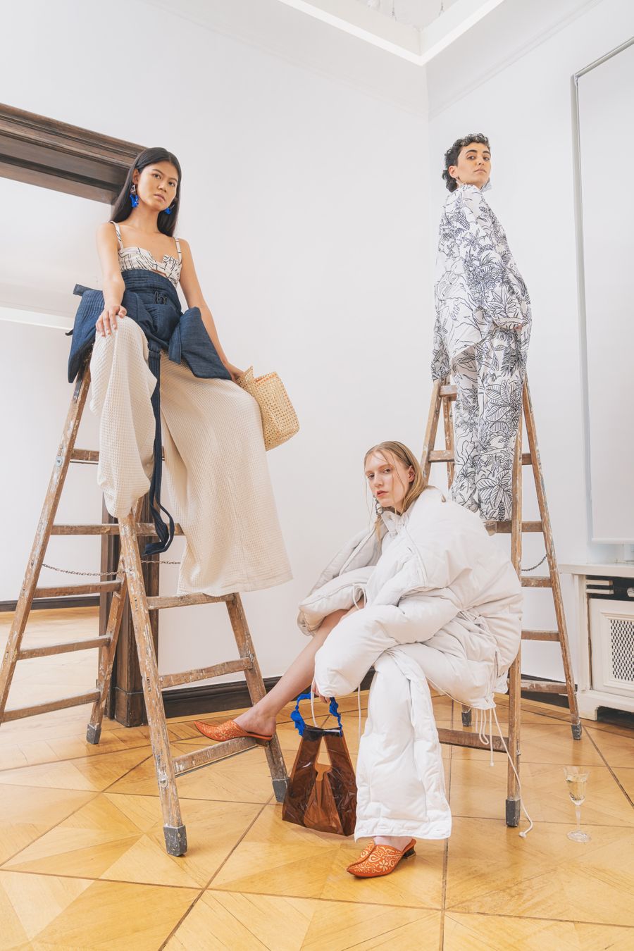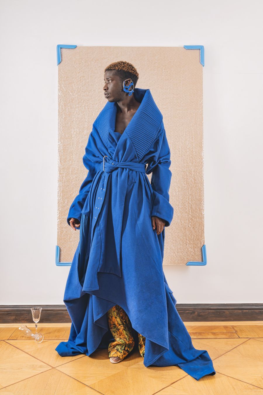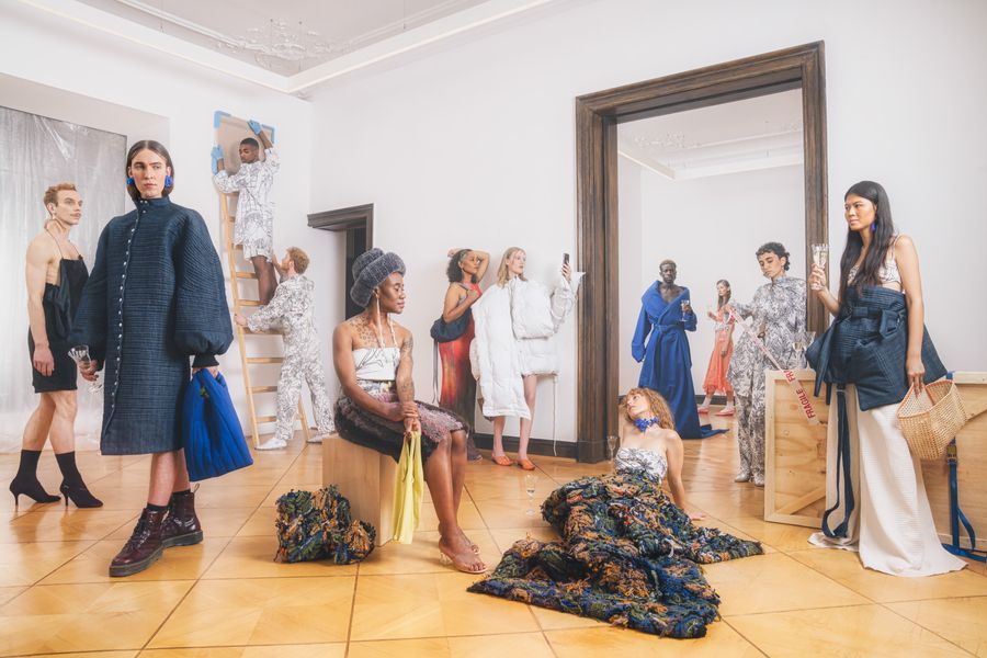 Silly.Berlin is a team of three creatives focusing on photography and film between fashion and advertising. The Vende Berlin collection is based on interior objects such as carpets or furniture covers, both in terms of its material properties and production technology. The photo series ‘Fragile’ shows a game with the differentiation between fashion design for commercial use and artistic expression. It is processed in humorous narrative diagrams. Thematically, a bizarre making-of story of an art exhibition is staged – positioned between the exhibition structure and the vernissage. A KALTBLUT exclusive.