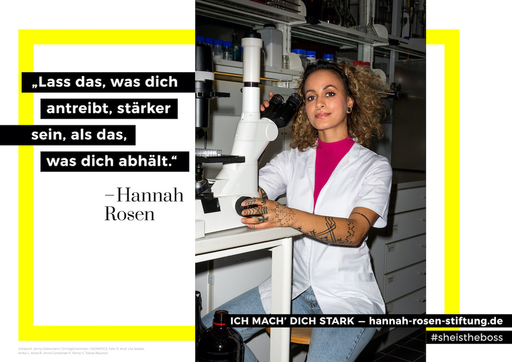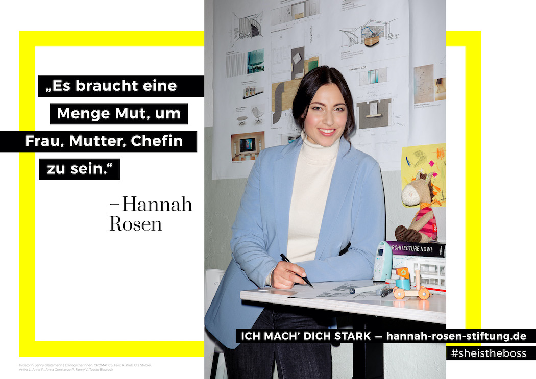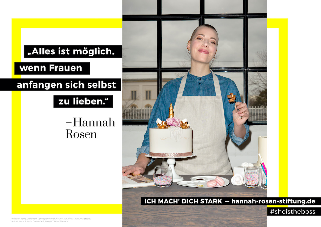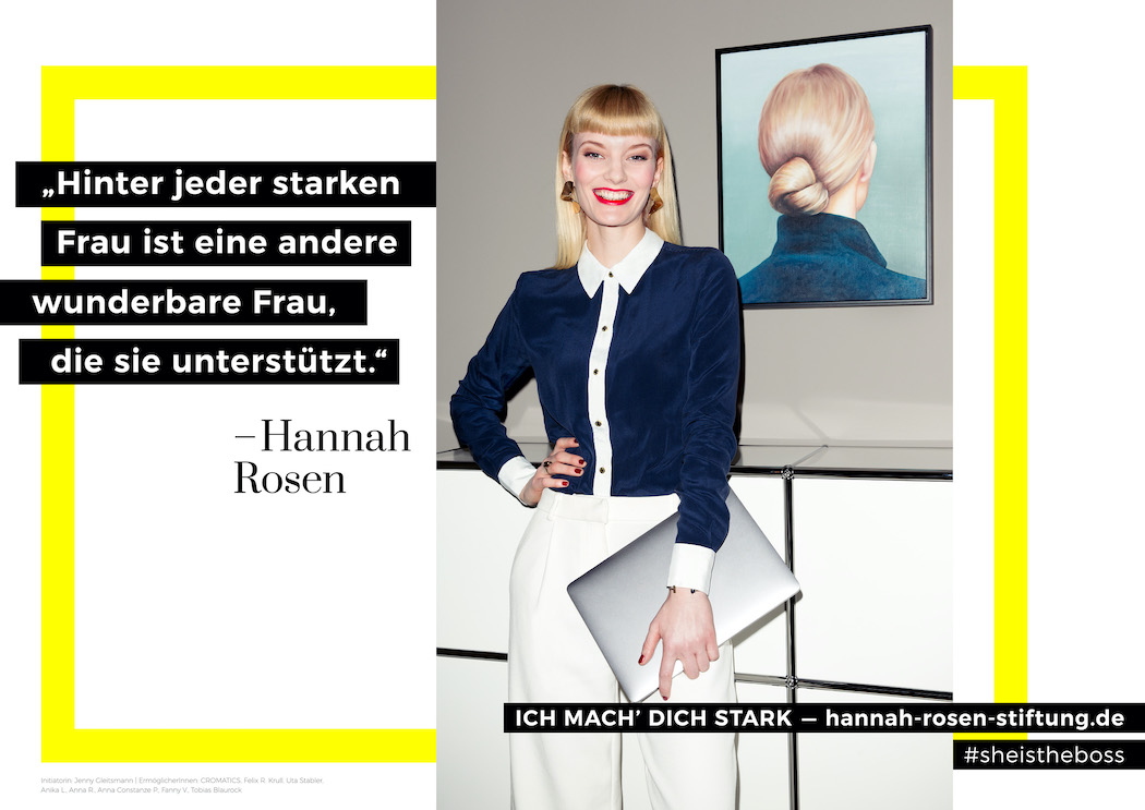 In Berlin und Dresden werden 77 Großflächen plakatiert, gleich fünf Motive zeigen unterschiedliche, starke Frauen und thematisieren gegenseitige Unterstützung. Parallel gründet Jenny Gleitsmann die „Hannah Rosen Stiftung“ – diese steht für eine Idee, ein Konzept und eine Vorstellung von einer Welt, in der Frauen alles sein können, was sie wollen. „Ich möchte die Köpfe von Frauen frei machen und ihnen Mut geben, sich von hergebrachten Rollenbildern zu lösen, ihre Stärken zu definieren, aktiv zu werden und sich zu unterstützen – um dann wirklich ihrer Berufung nachgehen zu können. Dafür gehe ich auch ungewöhnliche Wege.“, so Jenny Gleitsmann.