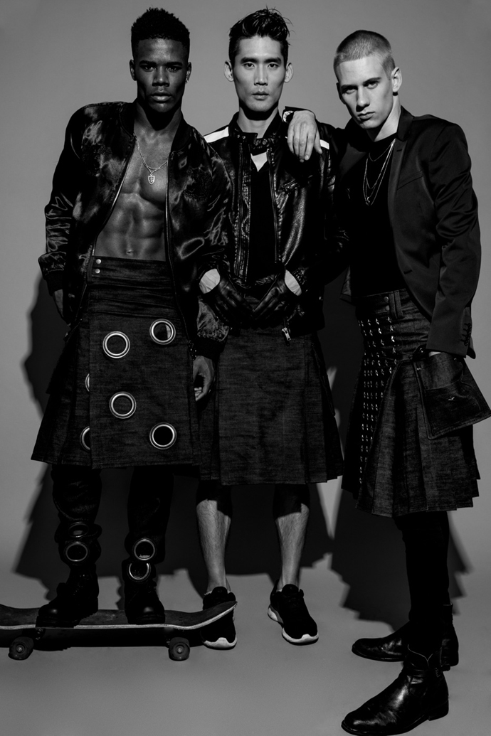 Model center: shirt by Thom Browne Necklace by Chrome Hearts kilt by FreeMen by Mickey