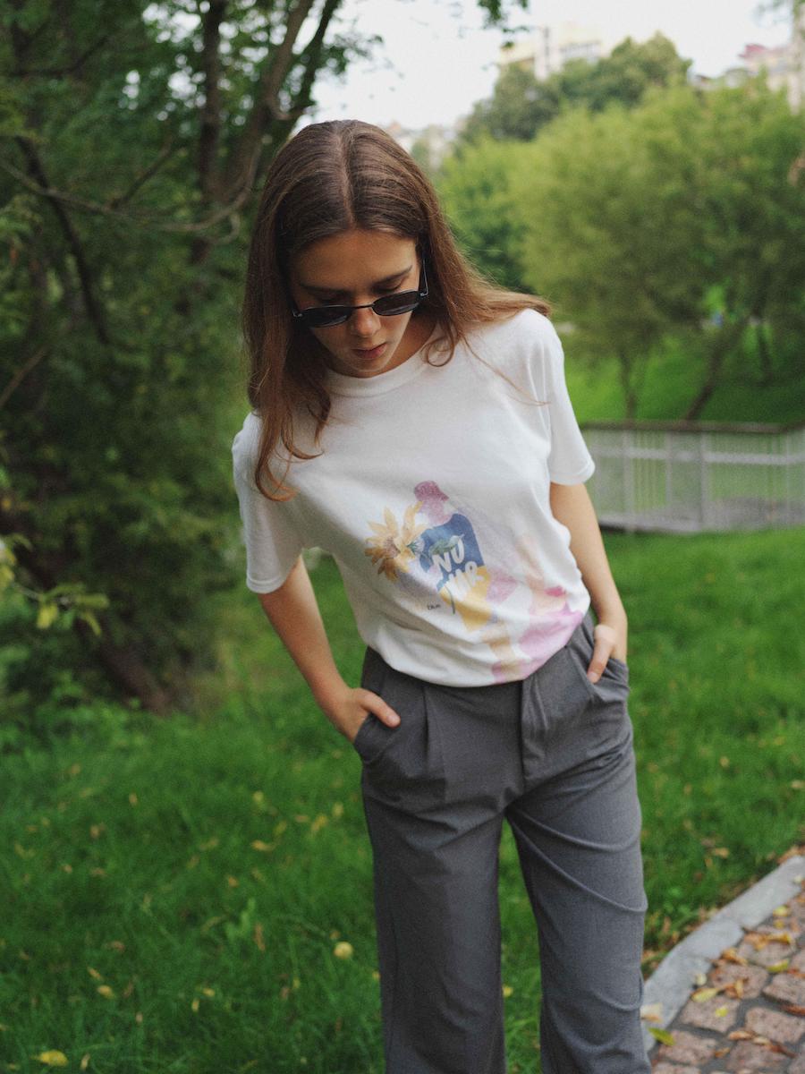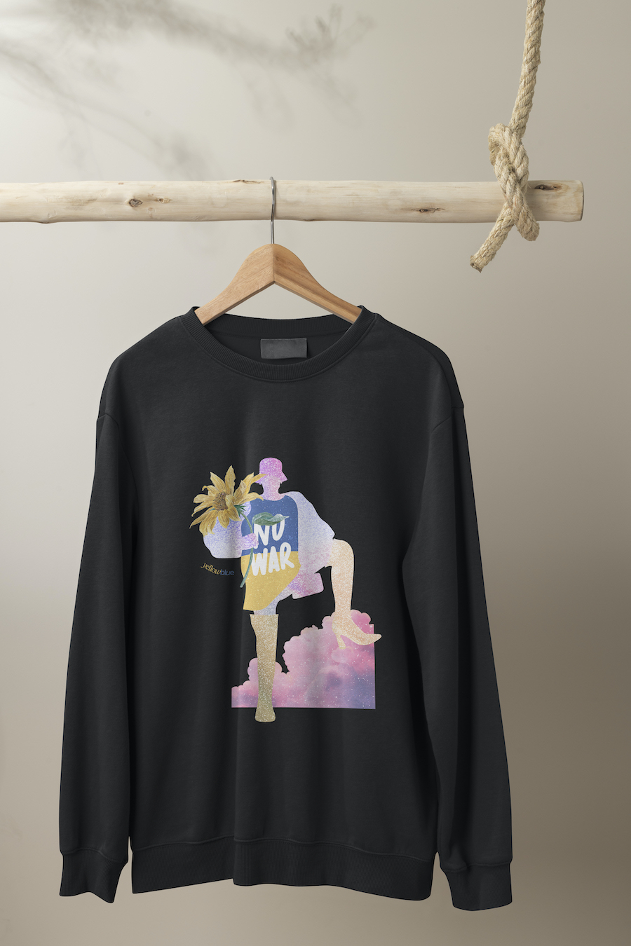 This collaboration is a synergy of good causes and creative heads, a bold decision to do something cool together to help Ukraine even more. The print itself is a recognizable silhouette of Frank in an A-line dress and over-the-knee boots accompanied by some loud symbols of Ukrainian resistance: a huge flag, a sunflower and a signature Kalush hat. A generous portion of glitter and sparkles in the textures and on the background is there too: otherwise, it wouldn’t be Frank. The print is available on oversized T-shirts, as well as sweatshirts, all models are unisex.
