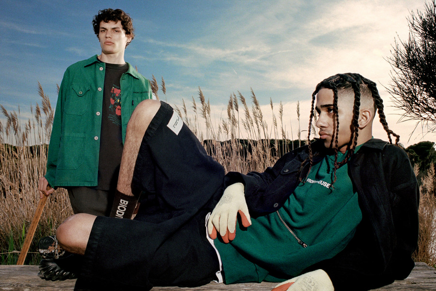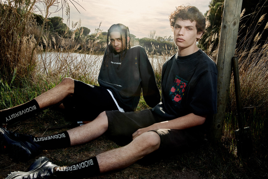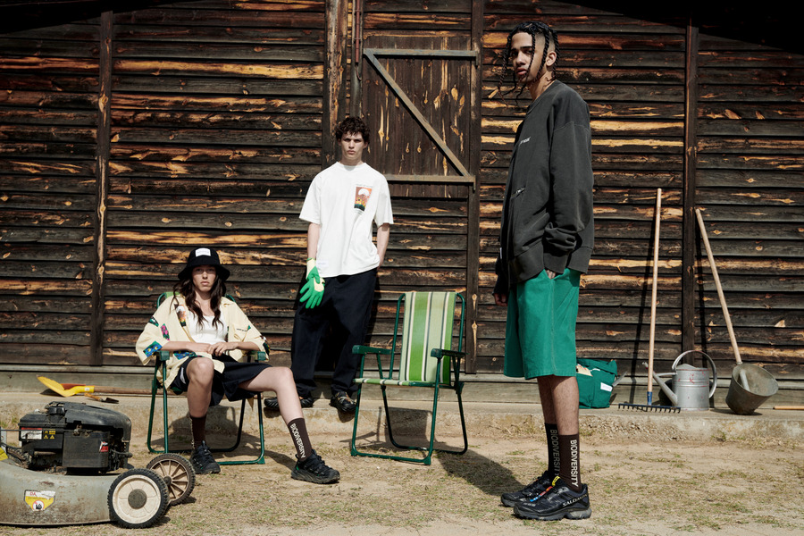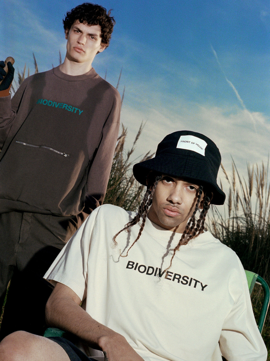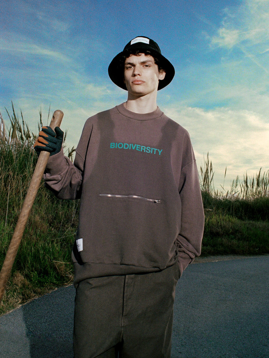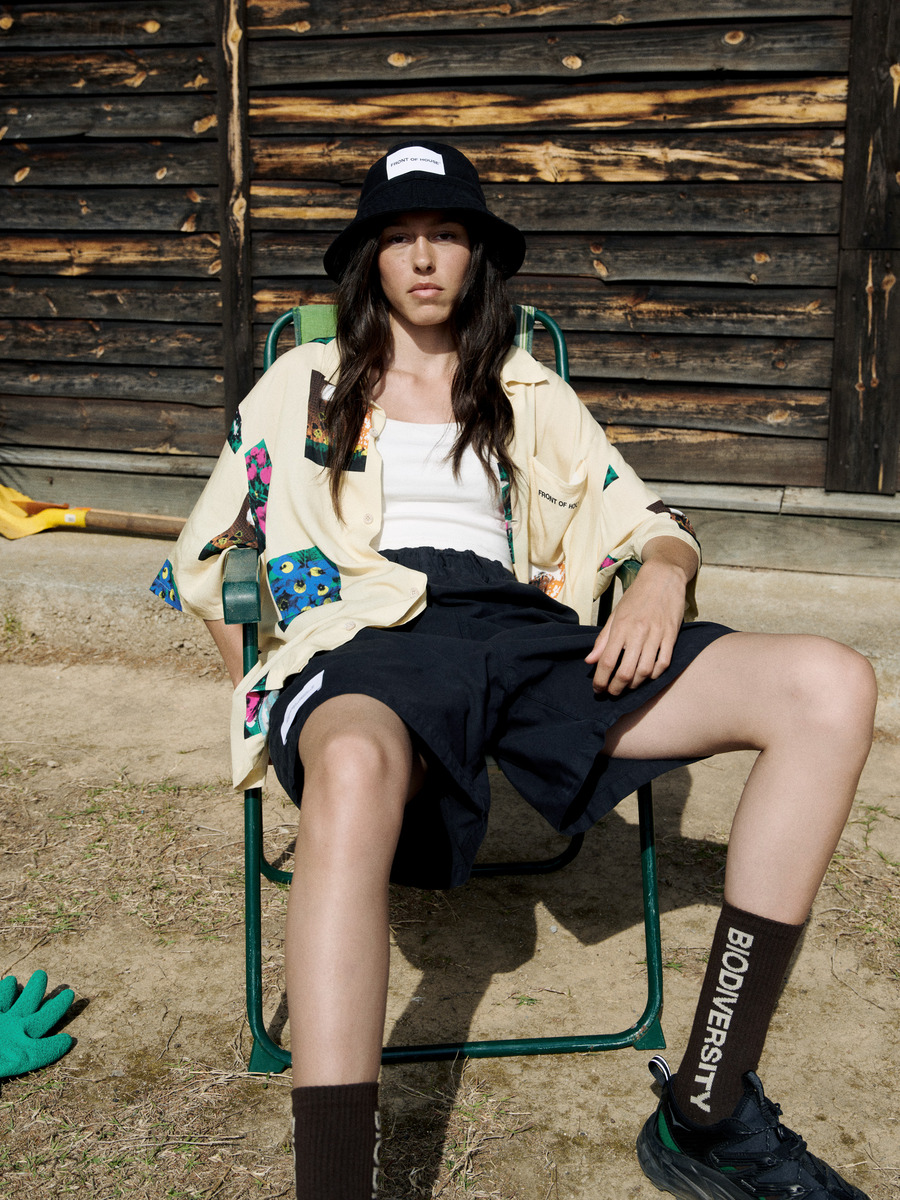 BIODIVERSITY offers a curated selection of 27 pieces, of garments and accessories alike, that have been designed, made and dyed locally. Its materials and fabrics include organic cotton and fresh twill that perfectly reflect the arrival of spring. An urban-friendly collection that features oversized garments with utility details such as pouches, zippers, and pockets for tools. The pop-style aesthetic graphics depict a metaphor between the diversity of the audience at a music festival and the variety of flower species.