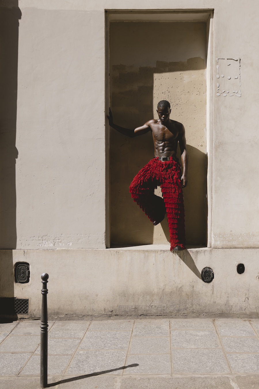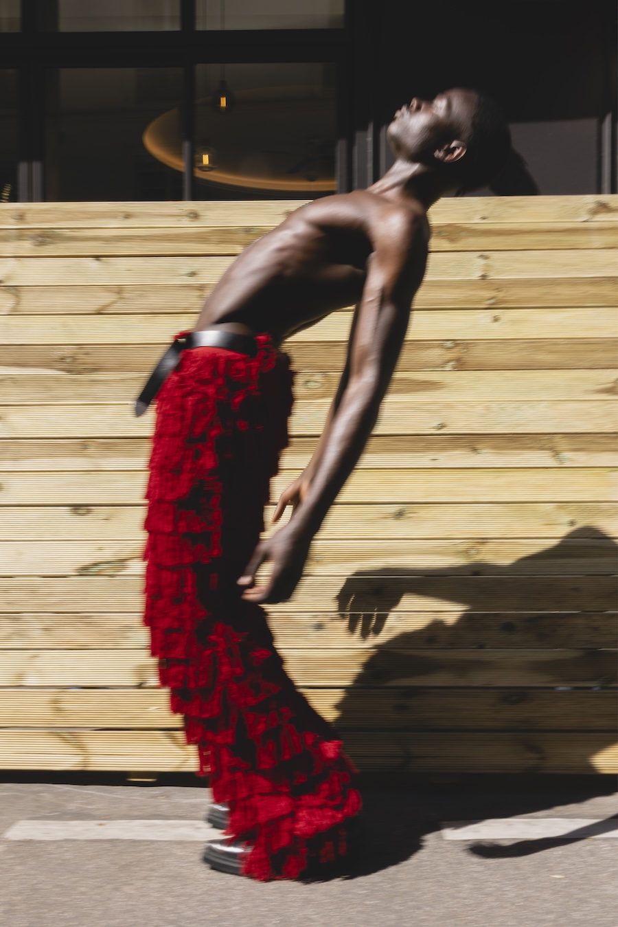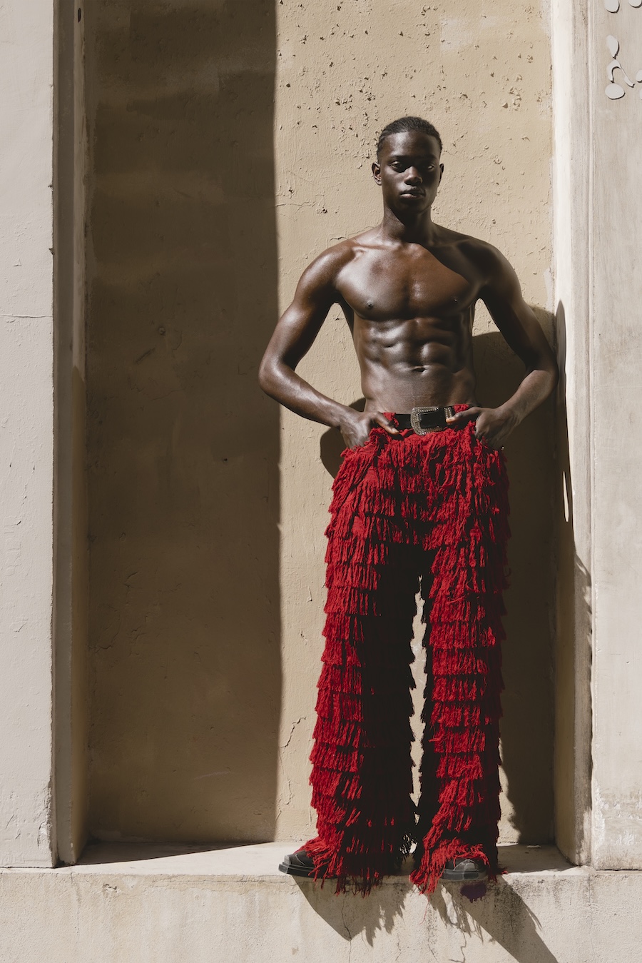 A KALTBLUT exclusive. Photography by Andrea Echeverría. The model is Moussa Ndiaye, signed at Dream Model Agency. Styling by Stephen Barrington STUDIOCRTL. Creative direction and production by N’chira. Fashion brands are Claudel, Yugen, Zara, Benjamin Robin, Asos, and Lumea Tribe.