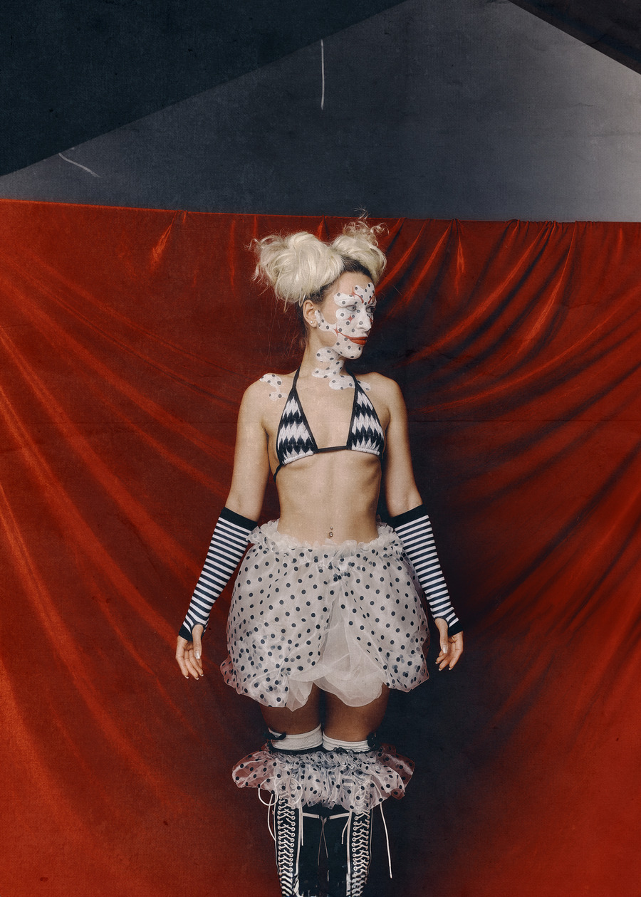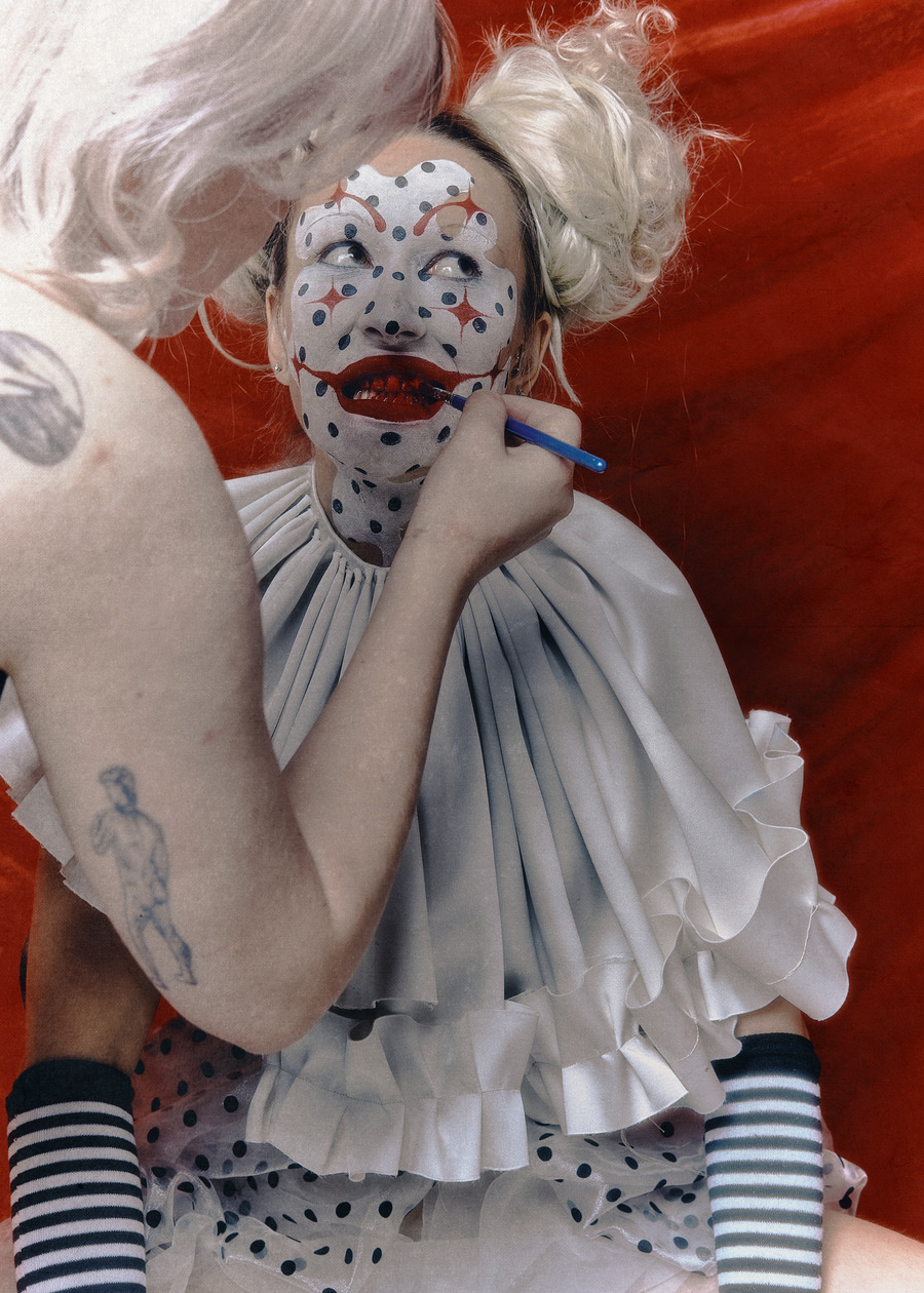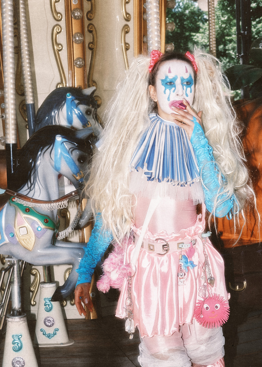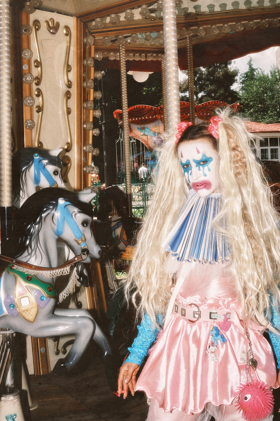 “Funhouse” delves into the multifaceted world of clowning, capturing its joyful exuberance, underlying melancholy, and eerie undertones. This editorial juxtaposes the vibrant and the sombre, the whimsical and the unsettling, through a series of fashion looks inspired by the iconic vintage imagery of clowns. The scene enhances the surreal and nostalgic atmosphere, blending elements of decay and wonder.
