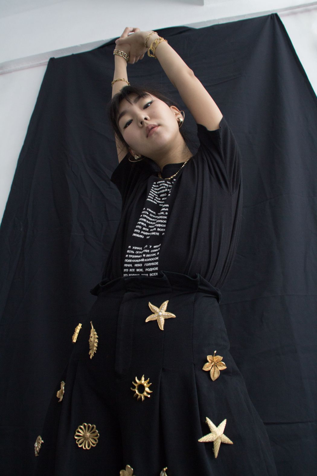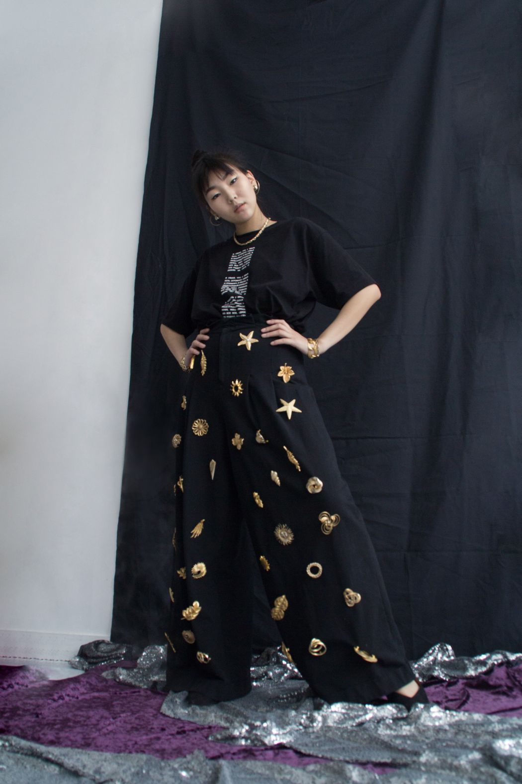 T-shirt – Volchok clothing, Pants – Zimmerman, Brooches – Schuchki vintage, Bracelets – Schuchki vintage, Chain – Schuchki vintage, Earrings – Schuchki vintage