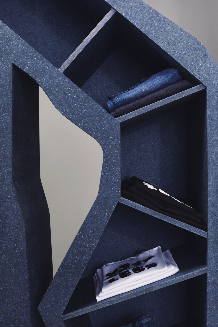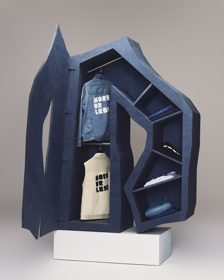The result is a triptych of cabinets which are both playful and functional. As well as being made from denim, and resembling a pair of jeans, the furniture can also be used to store pairs of jeans (and other denim items). All three cabinets are made of textile board material created from recycled G-Star jeans, specially developed by Danish textile innovators Really / Kvadrat. The jeans were collected from G-Star stores across Europe via the ‘Return your Denim’ program which allows customers to return their old jeans for recycling. During the exhibition, visitors can also bring their worn garments to screenprint with the signature message More or Less.