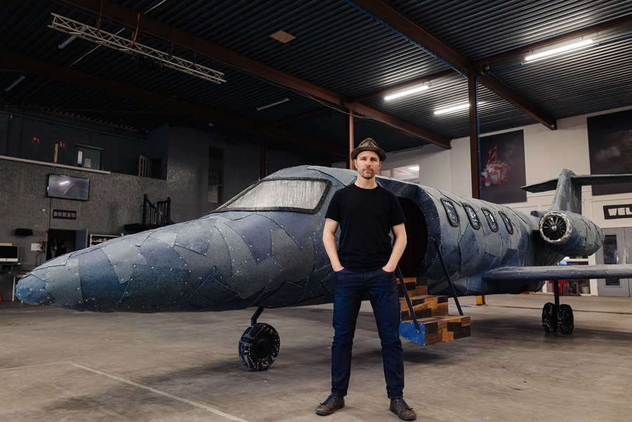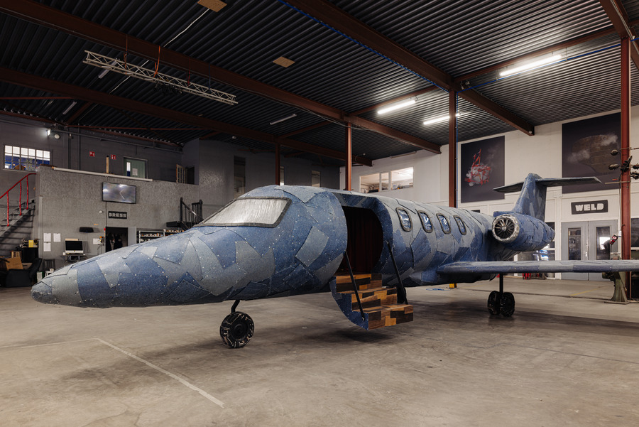 While designing the initial idea of the cabinets earlier this year, a second design concept arose in Baas mind: an imposing fifteen-meter jet that, like the cabinets, was built using waste denim – and which is likely to provoke reactions. Not only for its massive scale but for the bold statement it makes about the duality of sustainability issues.
