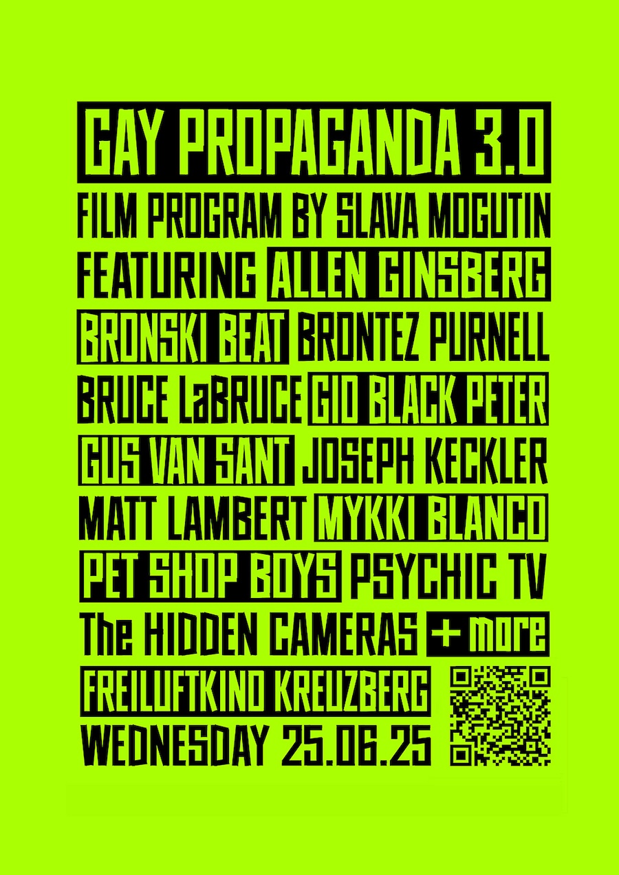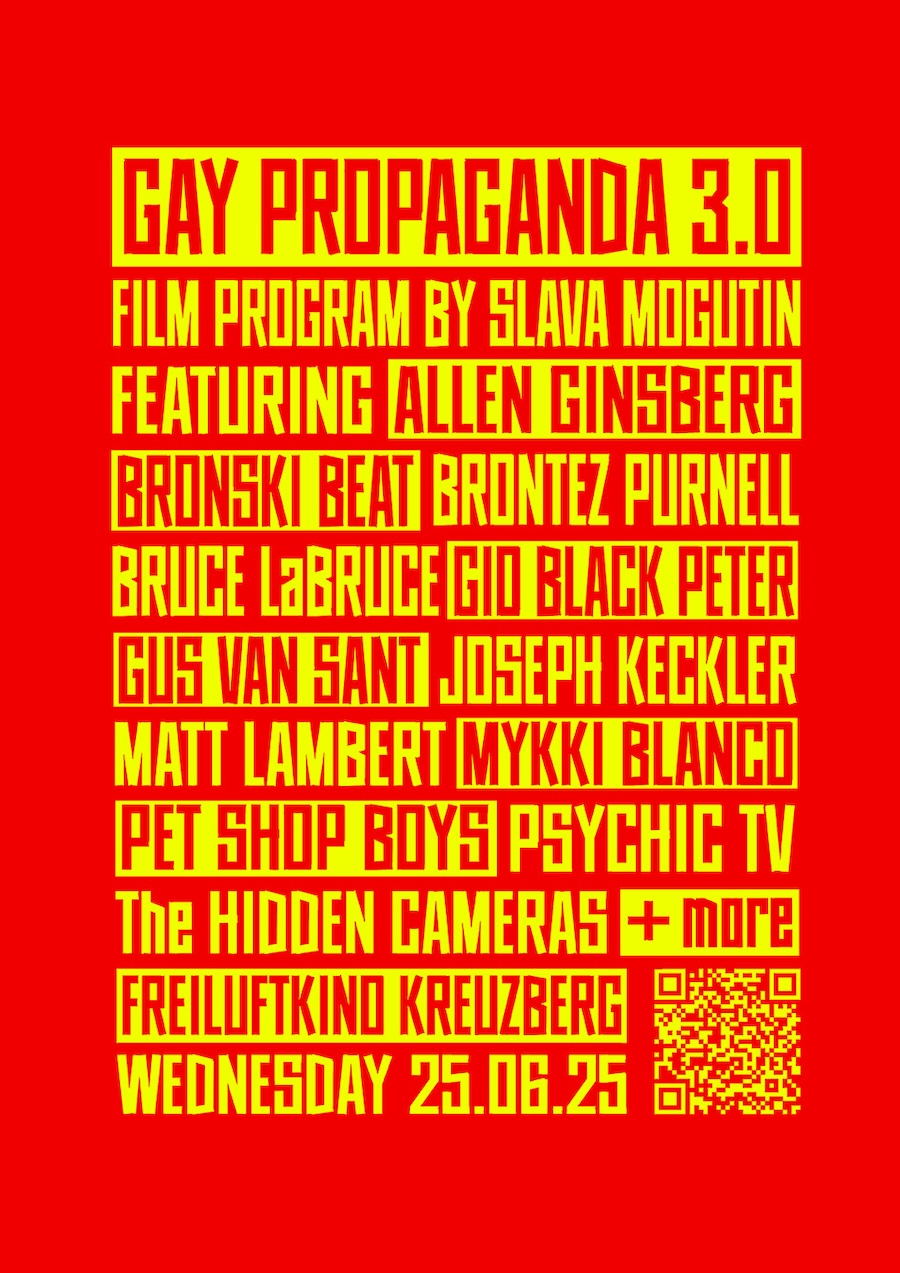 #SaveTheDate Berlin! GAY PROPAGANDA 3.0! A Film program curated by Slava Mogutin. Presented by Slava Mogutin and Matt Lambert + surprise guests. Wednesday, June 25, 21:45 (90 min) at Freiluftkino Kreuzberg (Zugang über Adalbertstraße, Mariannenplatz, Bethaniendamm 2, 10997 Berlin)