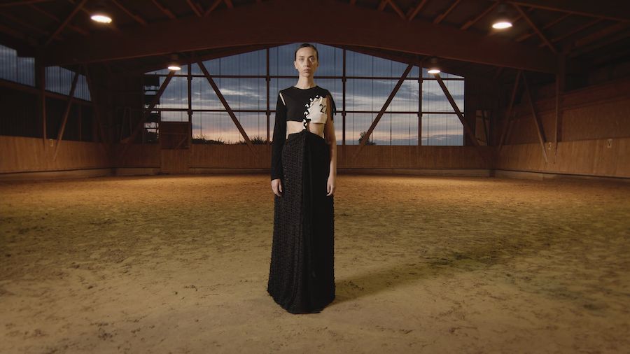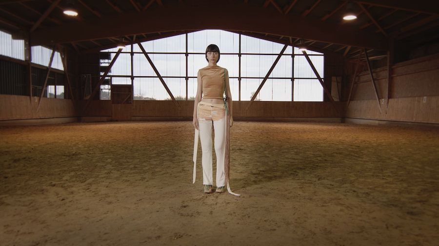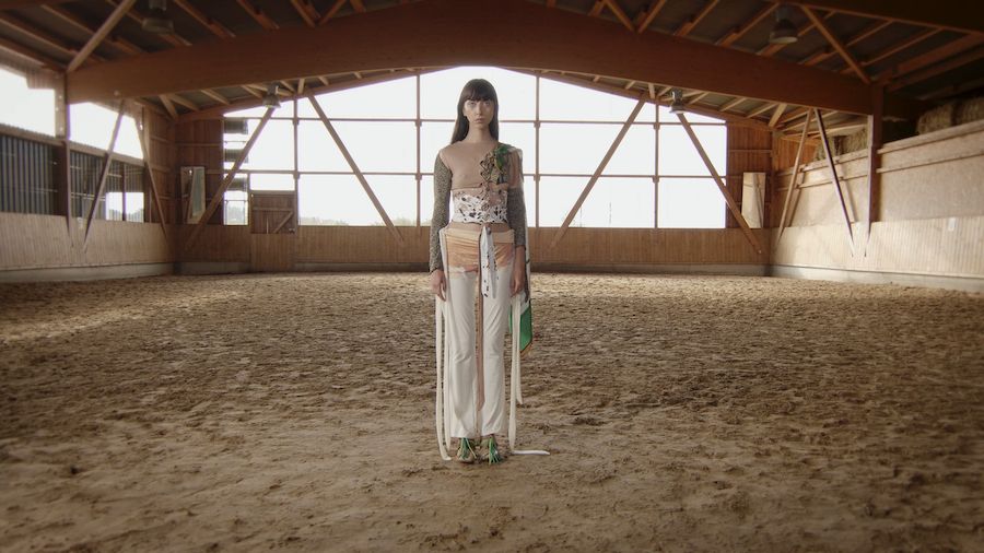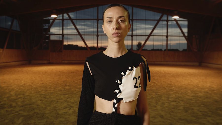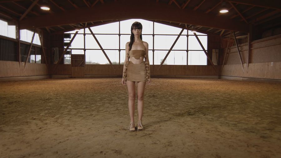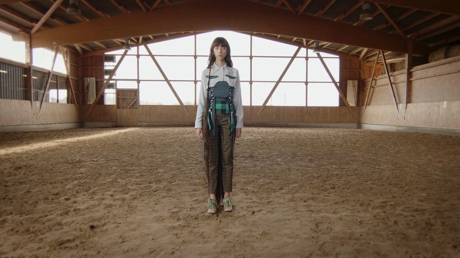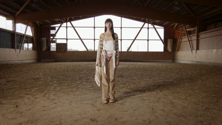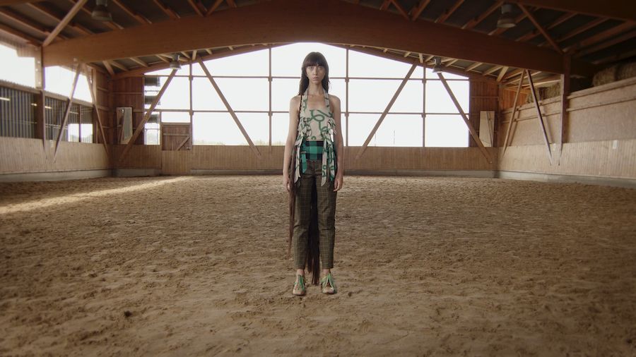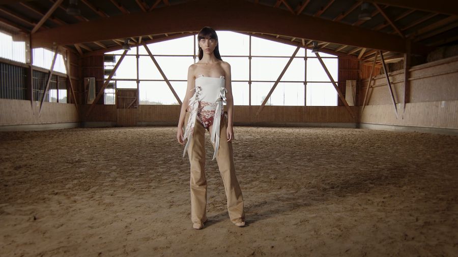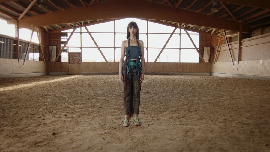 THE GB2022-CLUB ARTICULATES SETS OF ELEMENTS – COMBINED TOGETHER THROUGH BRAIDING TECHNIQUES. THEY PAY TRIBUTE TO THIS SPECIAL TIME OF GROOMING SPENT WITH THE HORSE BEFORE RIDING. TINY GENTLE GESTURES AND CARING DAILY RITUALS ARE HERE AT THE CENTER OF THE CREATIVE PROCESS. ATTACHED OR DETACHED, BRAIDED OR NOT, THE PIECES OSCILLATE BETWEEN RODEO FRINGES AND TIGHT EQUESTRIAN GEAR, AMAZON ONE BREAST TOP AND JOCKEY JACKET, PONY MOTTLED COAT AND STRETCHY VELVET. EACH DESIGN IS NAMED FROM A TYPICAL HORSE NAME INVITING YOU TO CARE FOR AND INTERACT WITH.