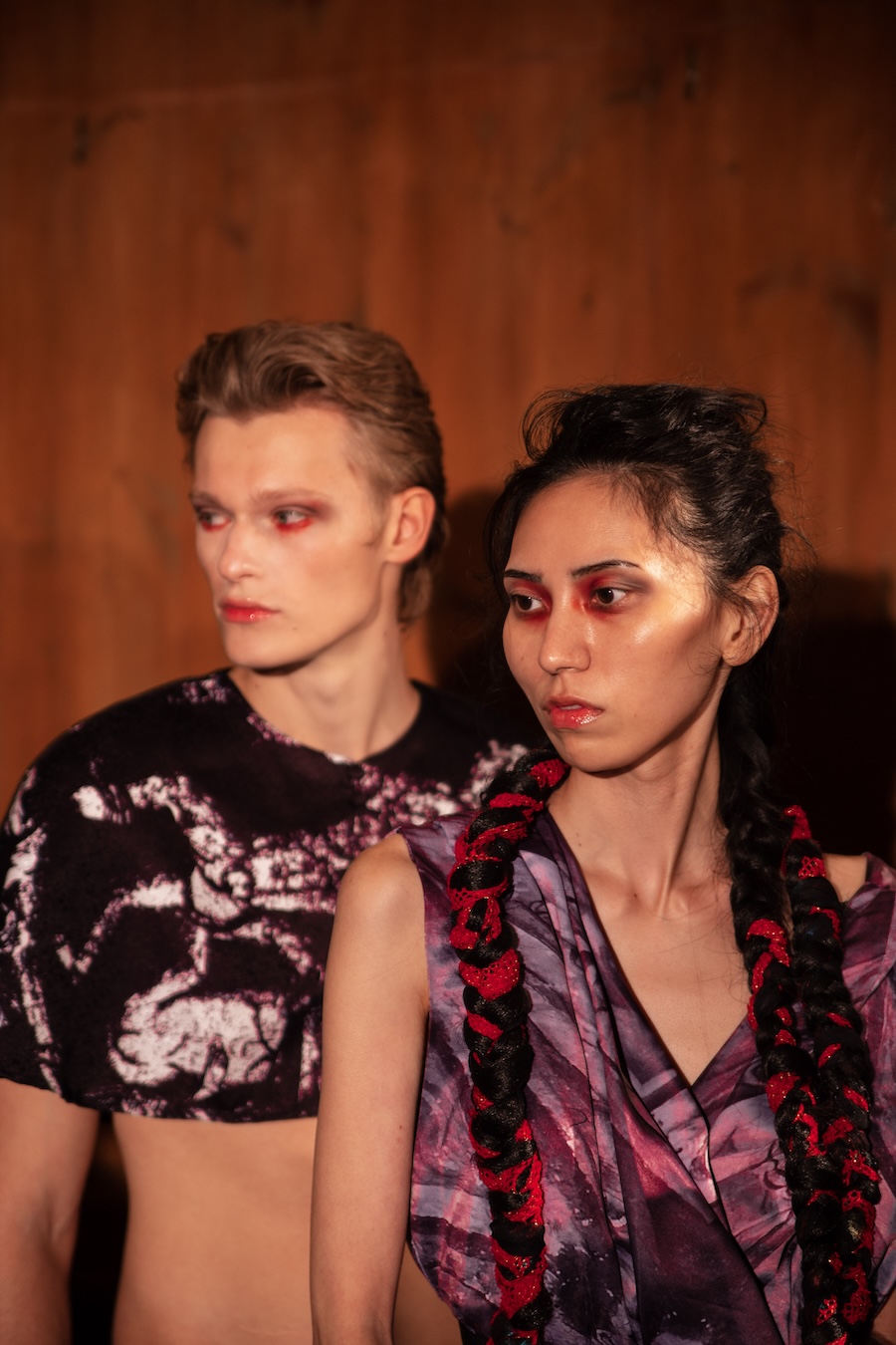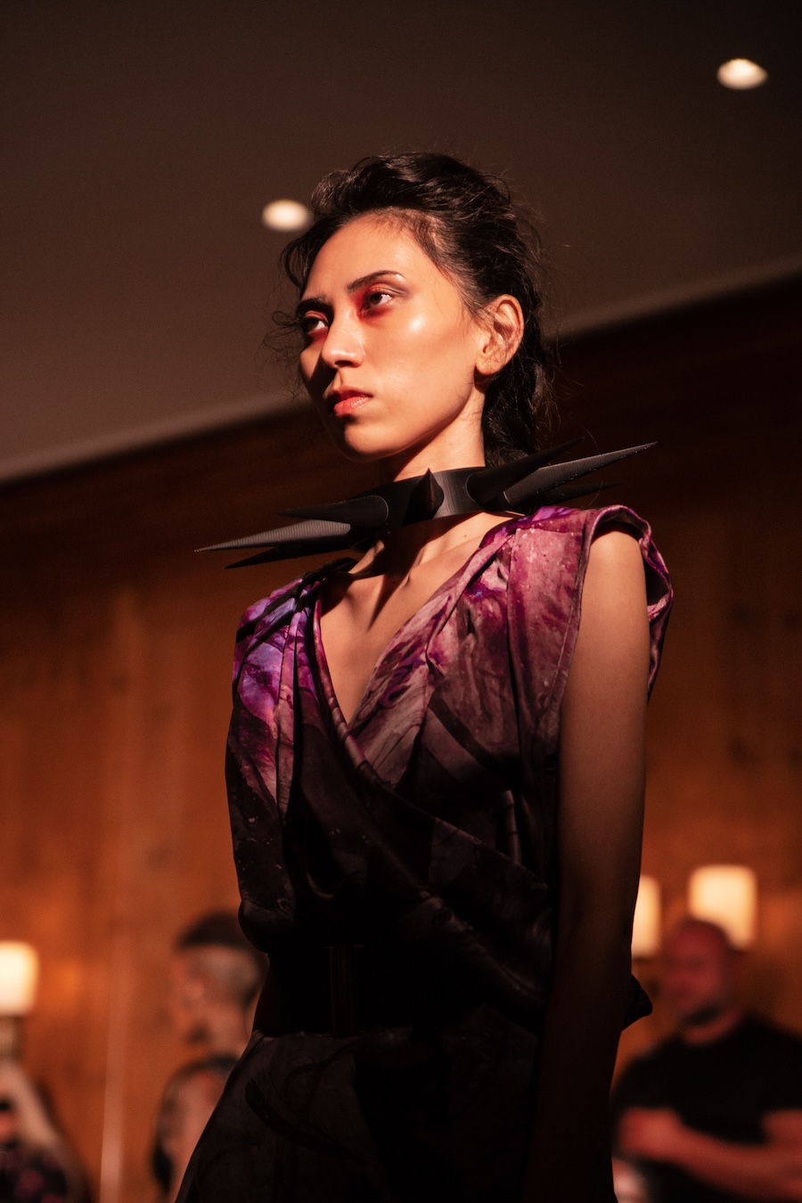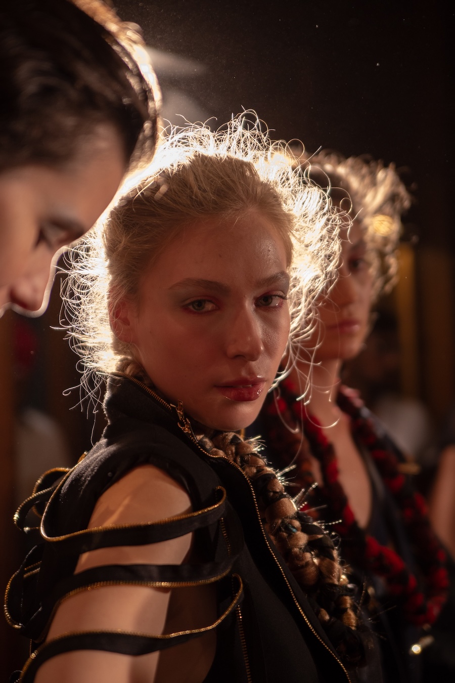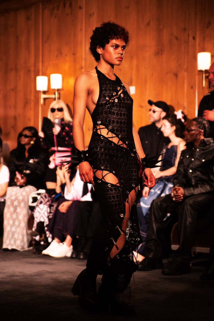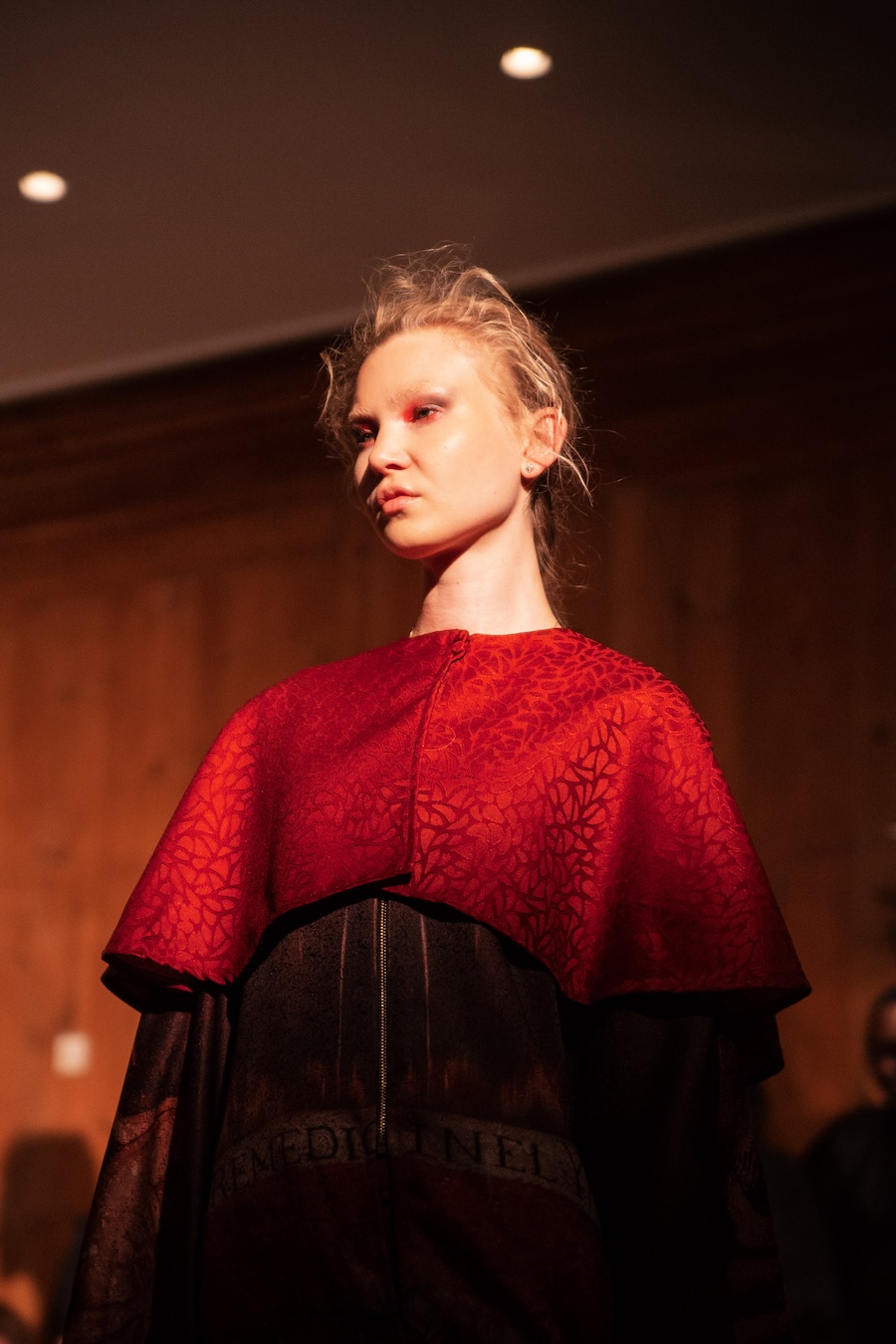 The clothes? Think power priestess who raided the sacristy and then hit Fabric at 3 a.m. Tailored silhouettes with a touch of the divine, upcycled denim that feels more runway than recycling bin, men’s trousers reincarnated as dresses, and zippers so extra they could headline their own accessories line. Resin, laser-cut acrylic, 3D-printed flourishes, it’s basically sacred iconography meets futuristic rave girl.