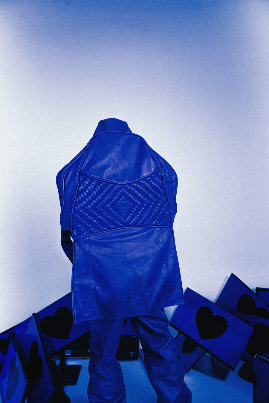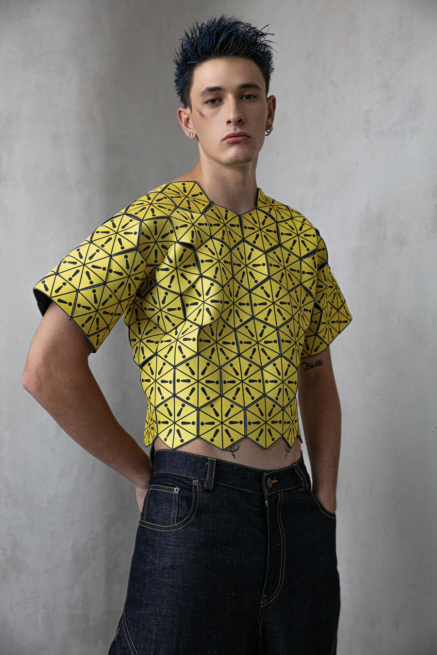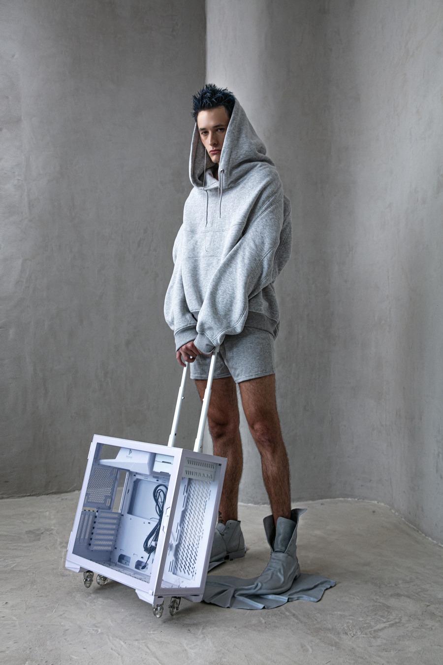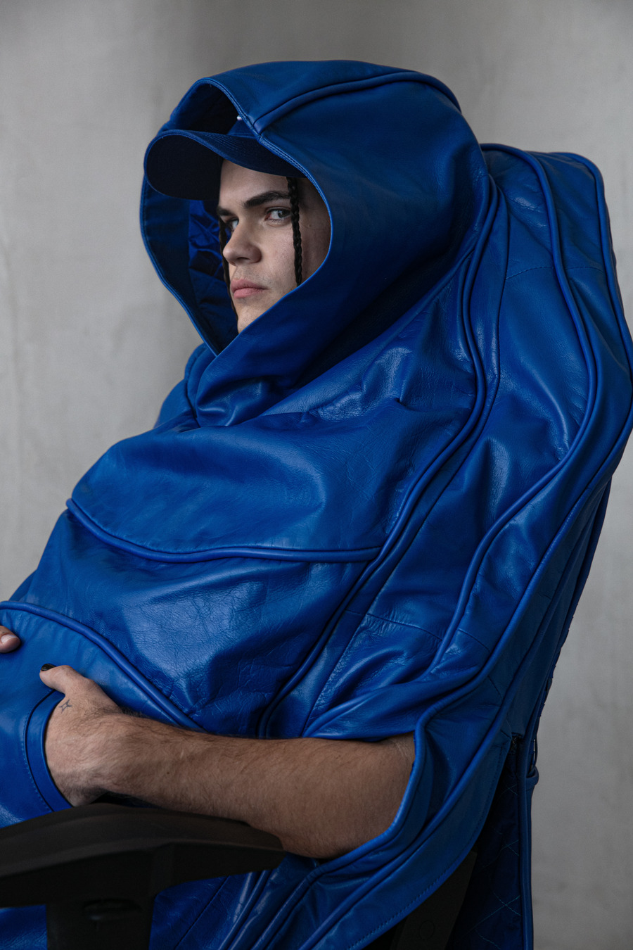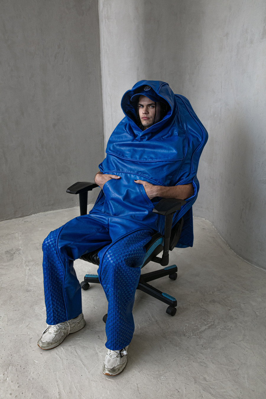 “I have integrated elements from the digital world into fashion, such as transforming gaming chairs and computer elements into clothing components. For example, a gaming chair is reimagined as part of an outfit, converting it into something one can wear. Yellow computer mouse pads and the reconceptualization of computer cases into fashionable suitcases are also part of this project. The result is a unique streetwear line that merges hoodies and leather, marrying the realms of art and fashion.”