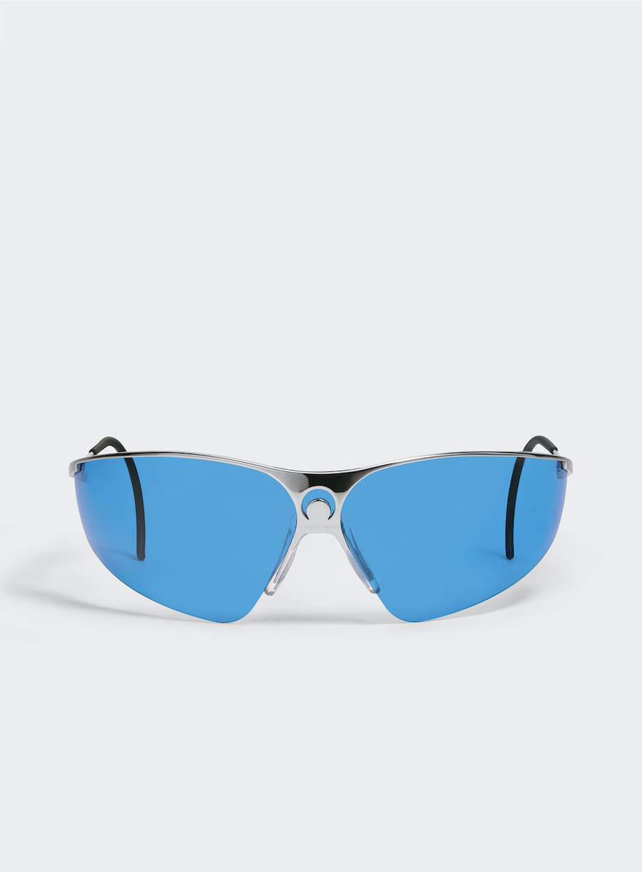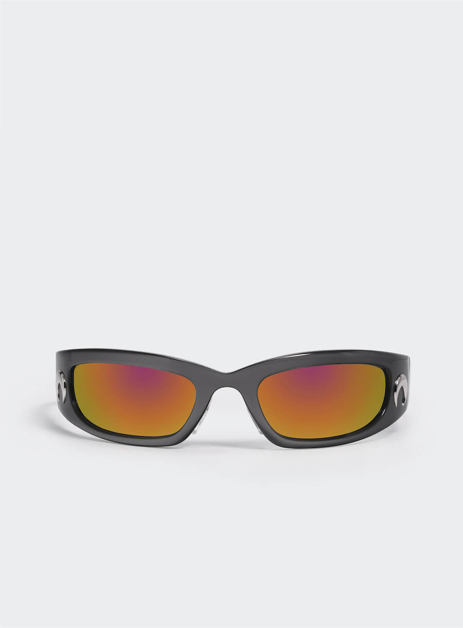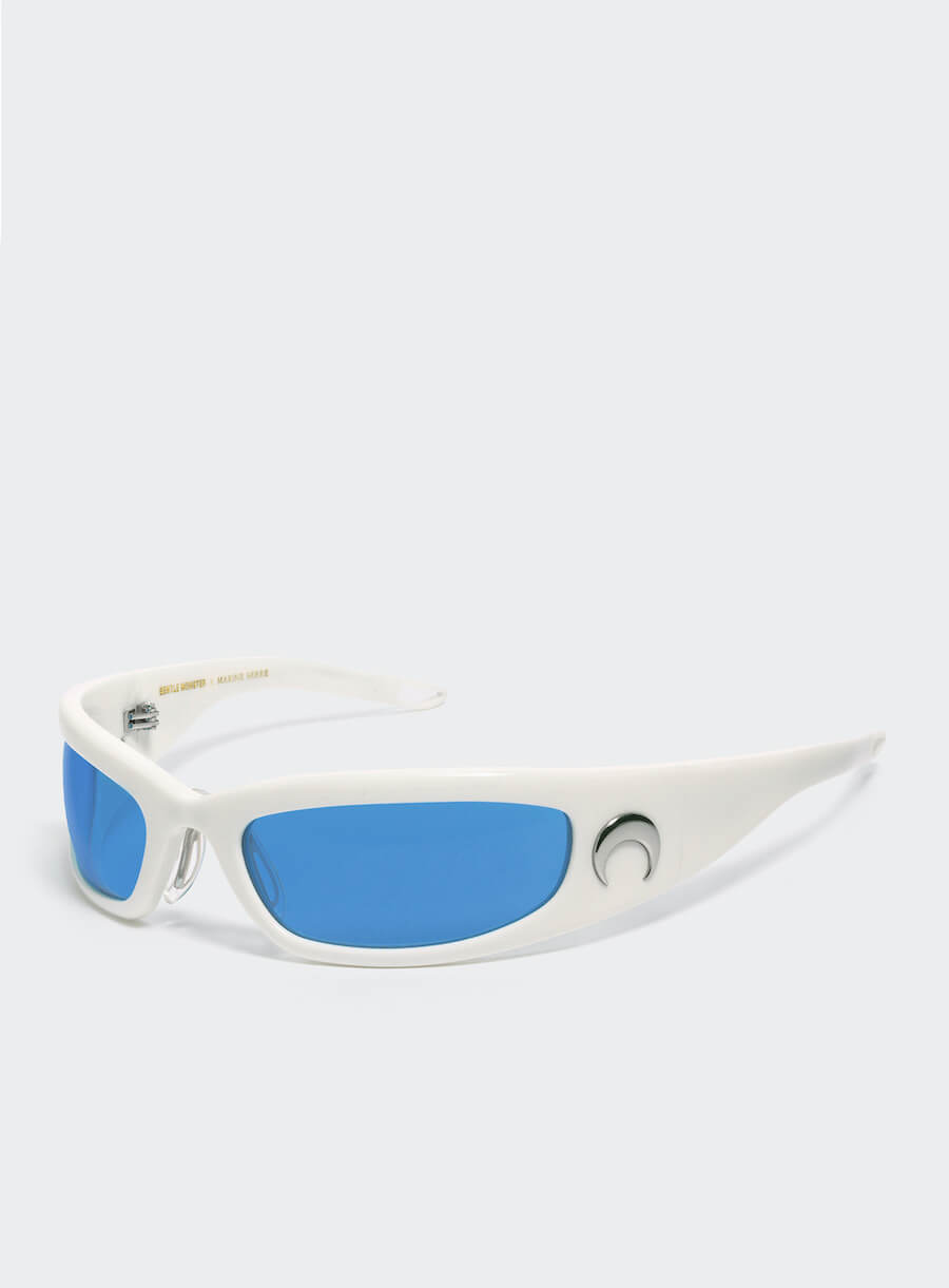 For this season Marine Serre has teamed up with forward-thinking eyewear brand Gentle Monster to produce two distinctly shaped sunglasses that revisit 2000s aesthetics. Based on a curvy acetate frame, the first style is a sleek design inspired by the thick frames used for extreme outdoor sports such as snowboarding. The second is a bold take on goggle style shades, mixing cyclist eyewear shapes with a glamorous vibe, structured around a thin metallic frame and featuring tinted aerodynamic lenses.