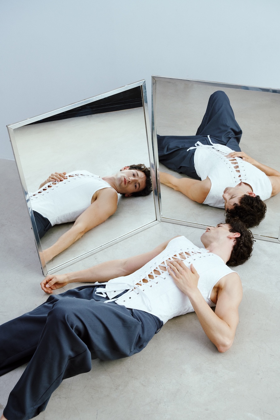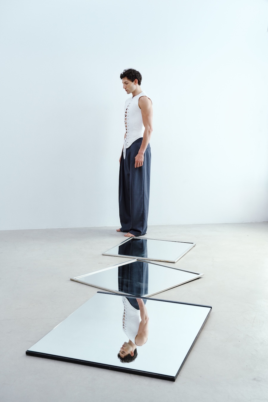 The body becomes an architecture in constant tension, engaging in a dialogue with mirrors, lines, and textures. This editorial explores the balance between rigidity and fluidity through fashion, where each pose is a geometric figure filled with intention.