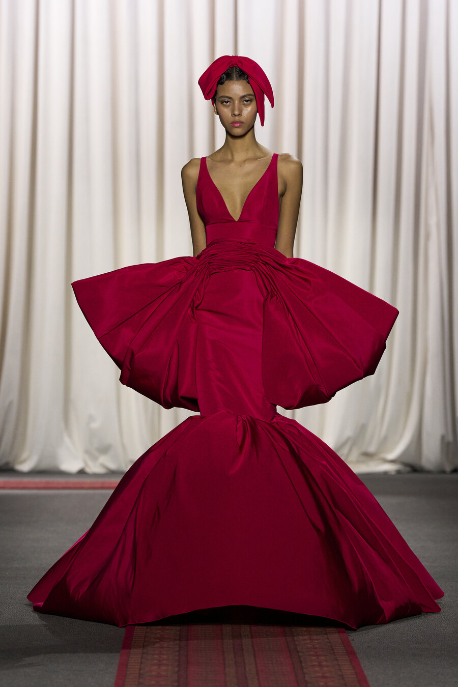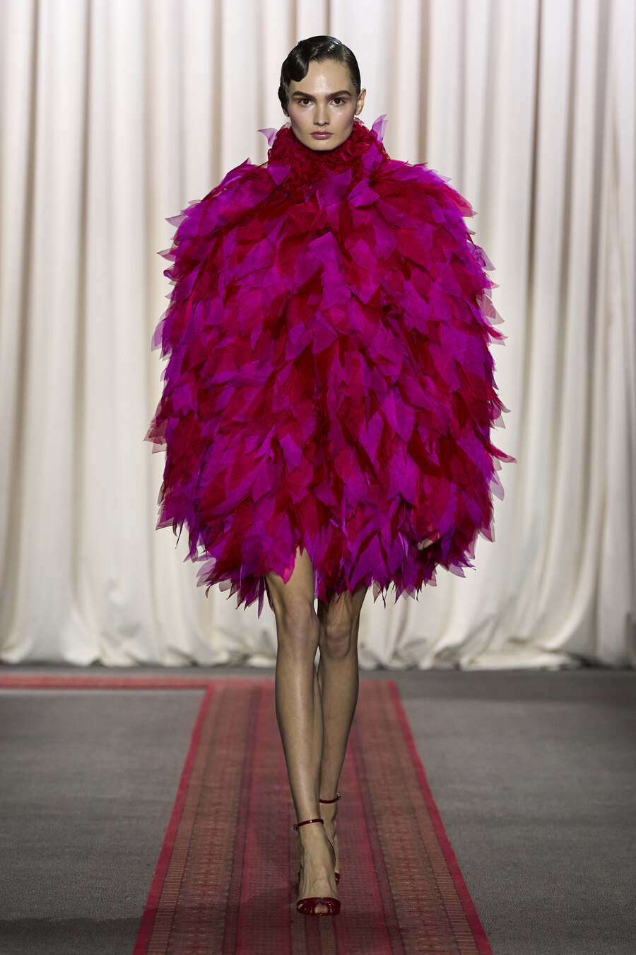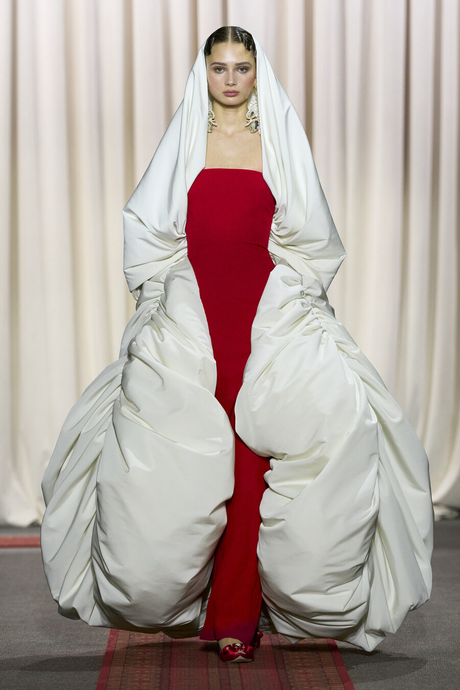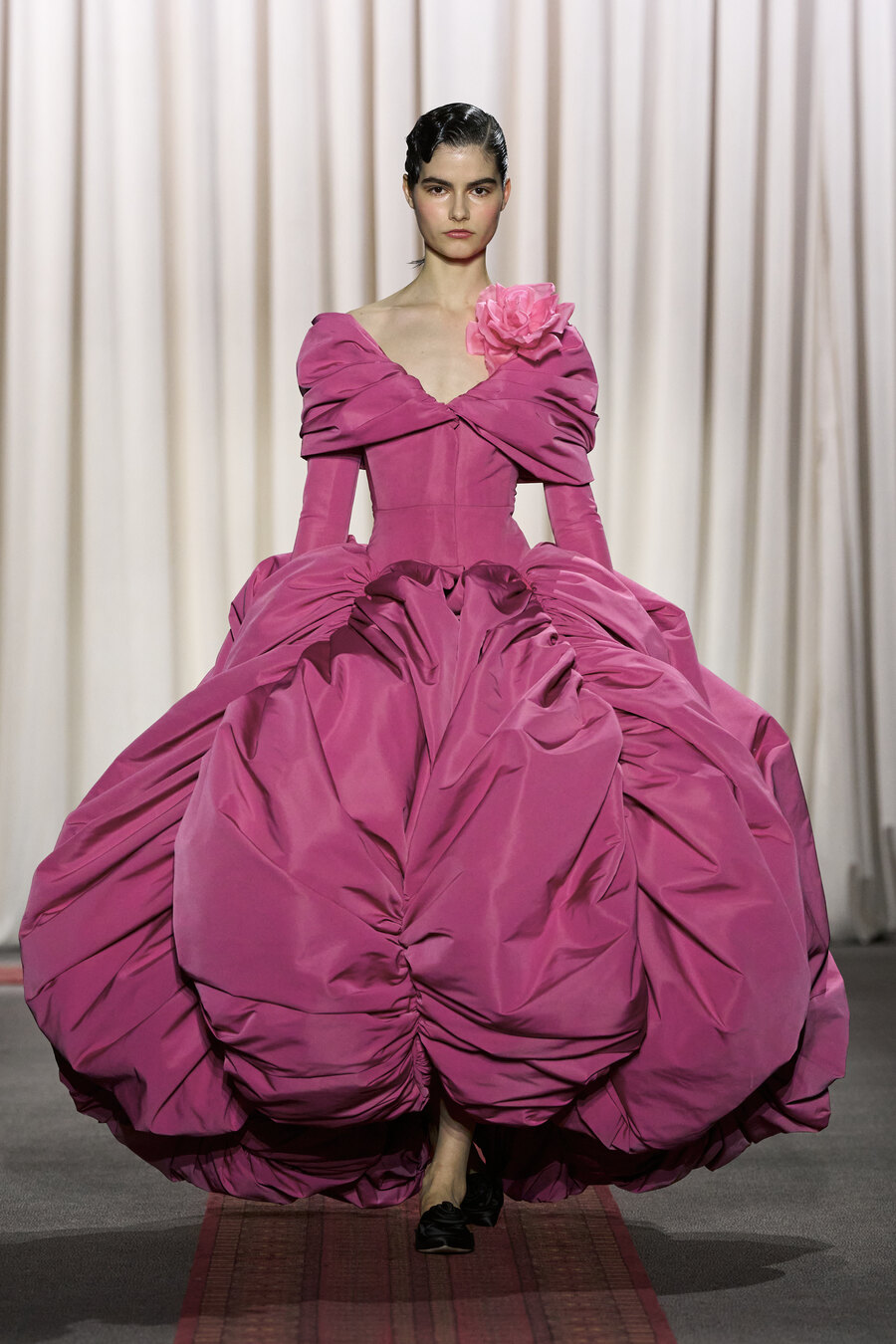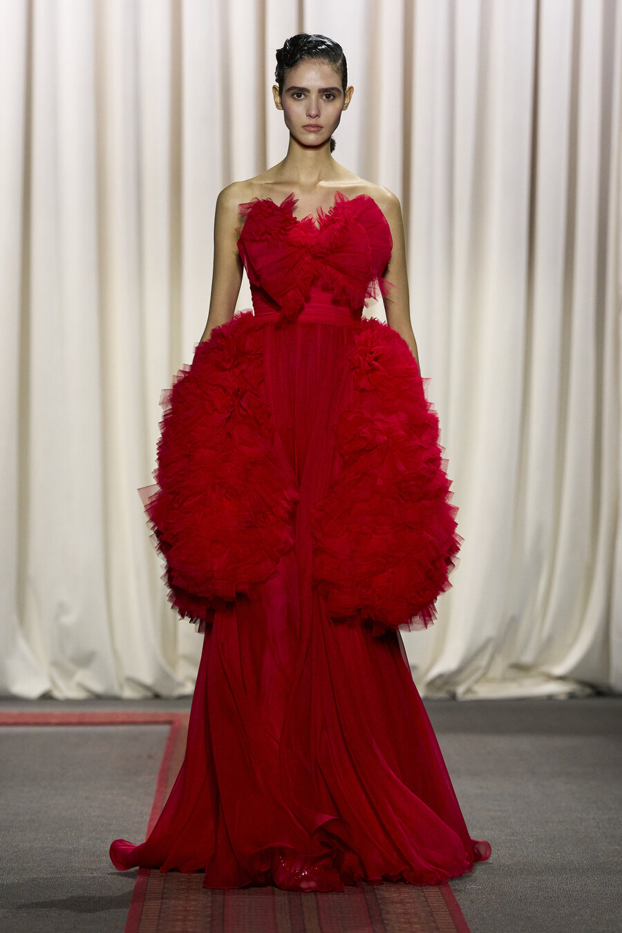 The collection also featured an array of gowns and coats sporting extravagant ruched skirts. These pieces resembled walking sculptures, reminiscent of ethereal cream puffs in bold hues of electric maroon, scarlet red, and soft, chalky pink.