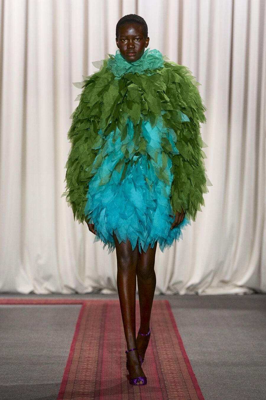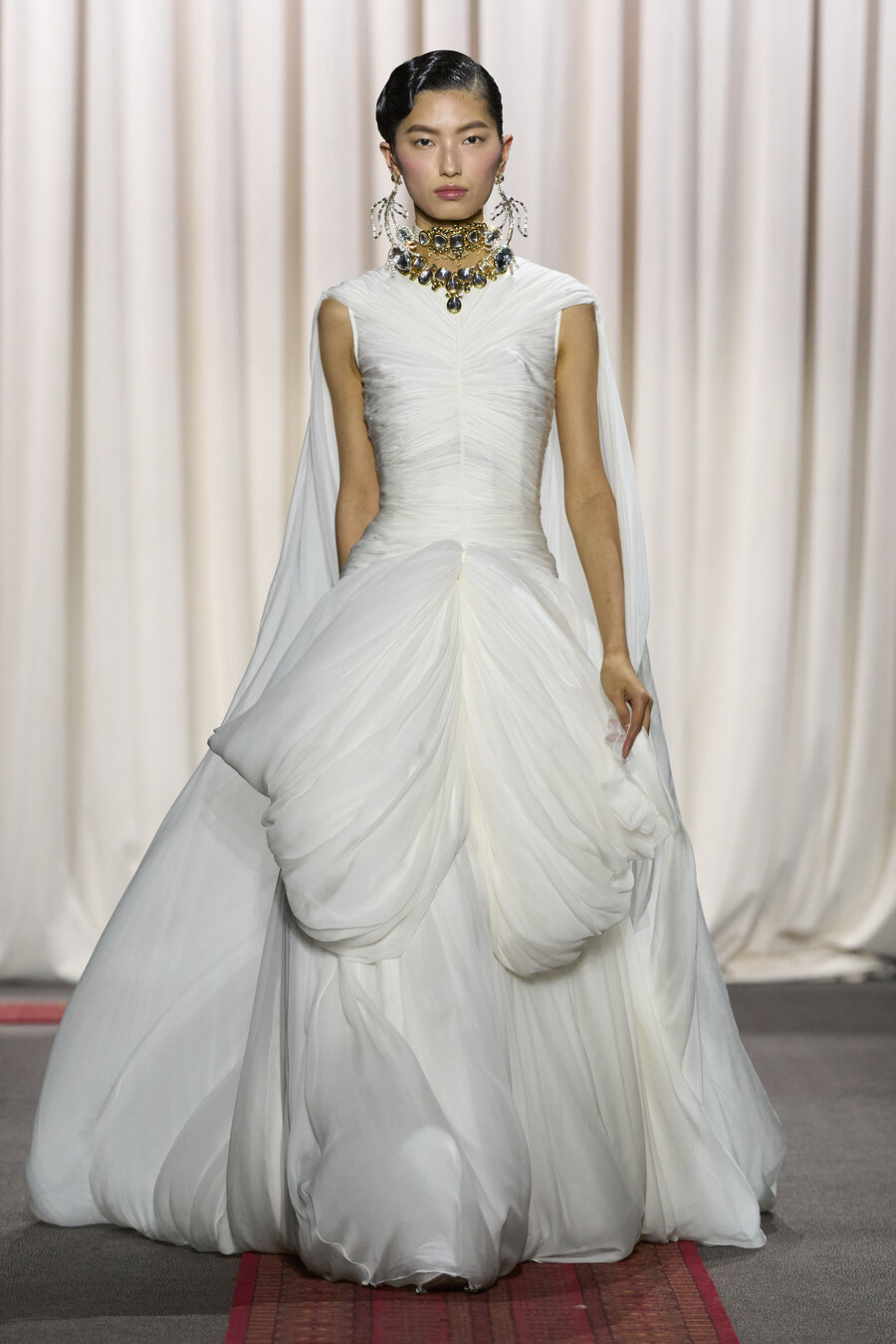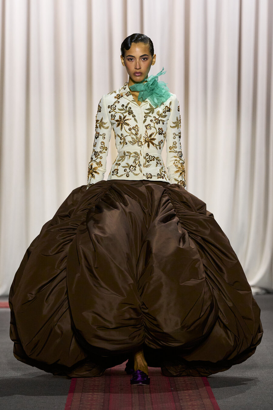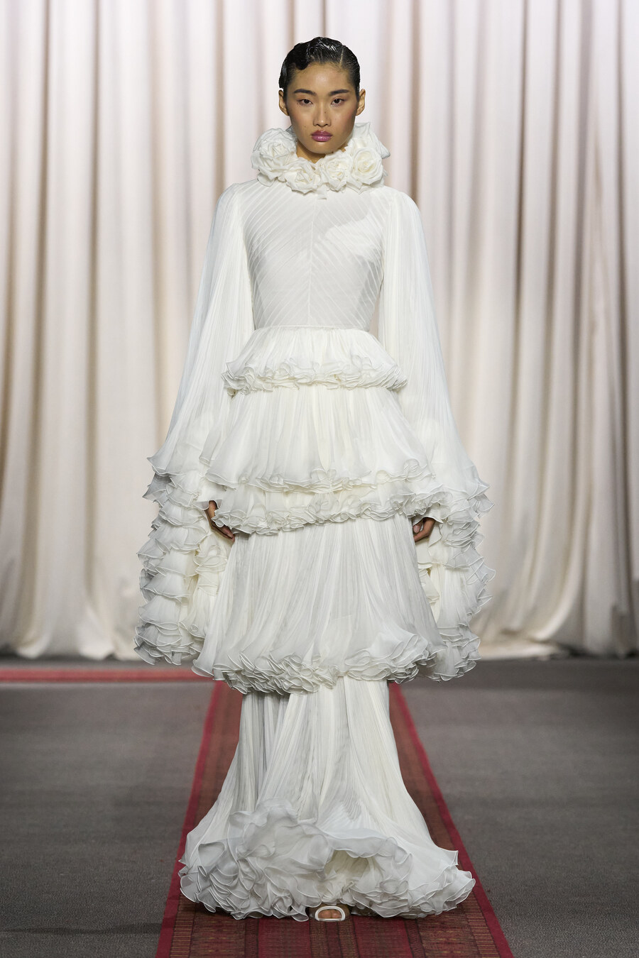The collection also featured an array of gowns and coats sporting extravagant ruched skirts. These pieces resembled walking sculptures, reminiscent of ethereal cream puffs in bold hues of electric maroon, scarlet red, and soft, chalky pink.