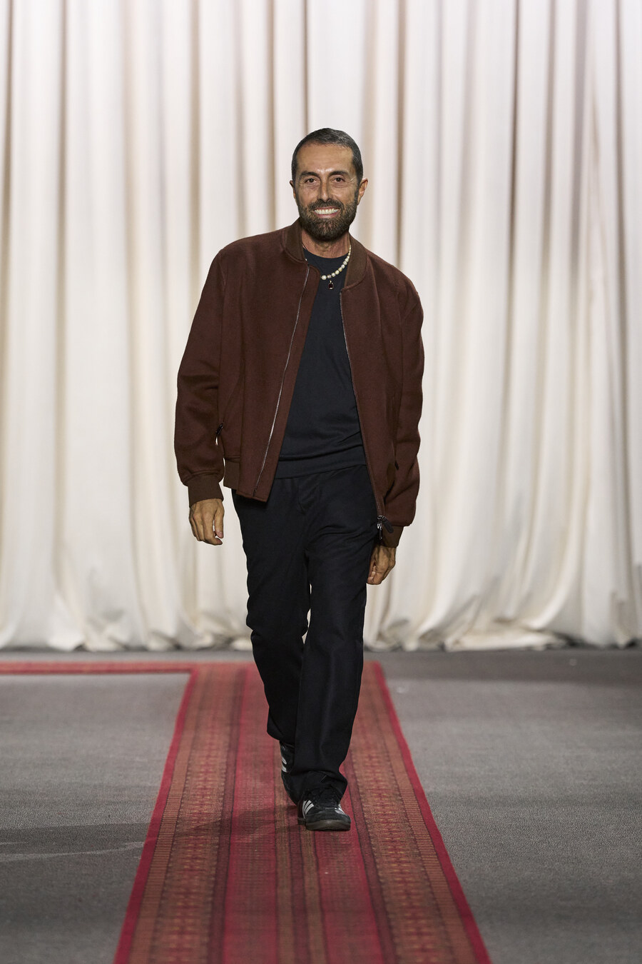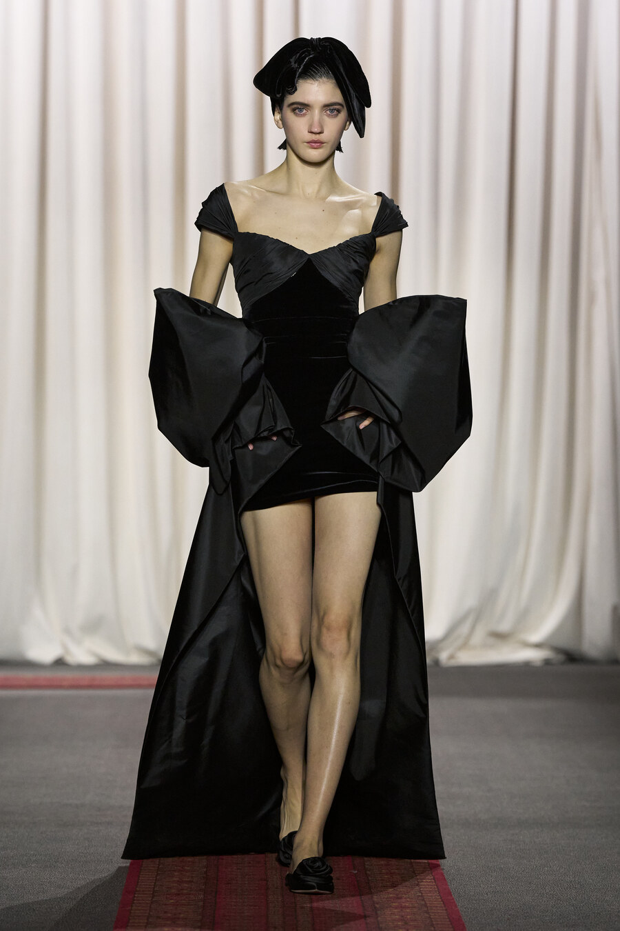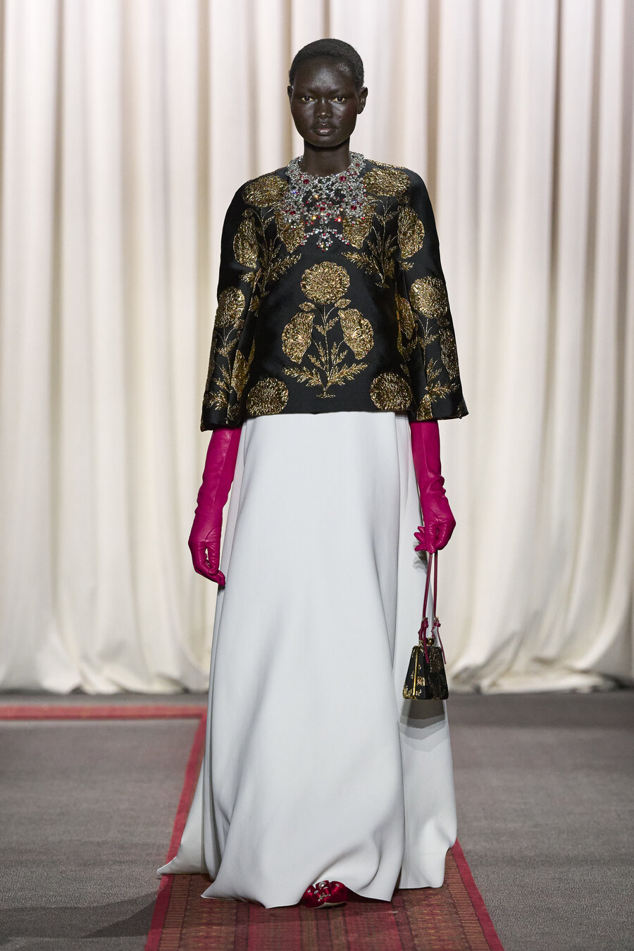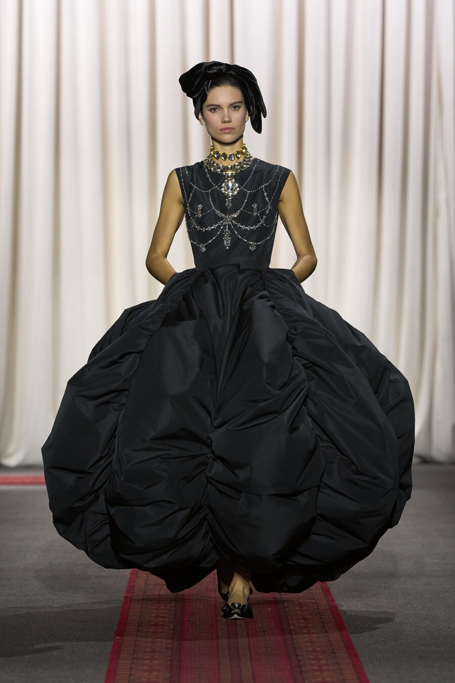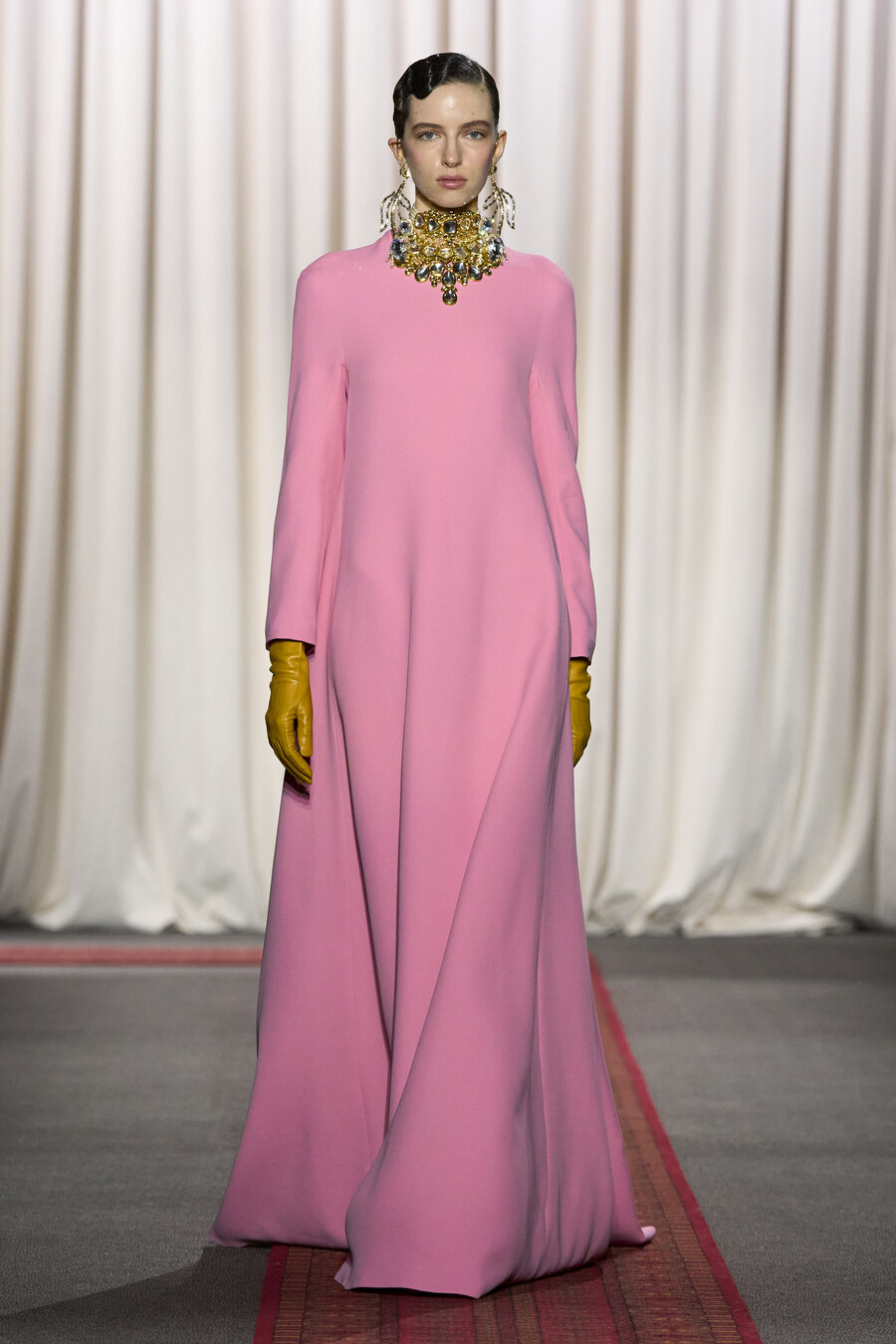 The collection also featured an array of gowns and coats sporting extravagant ruched skirts. These pieces resembled walking sculptures, reminiscent of ethereal cream puffs in bold hues of electric maroon, scarlet red, and soft, chalky pink.