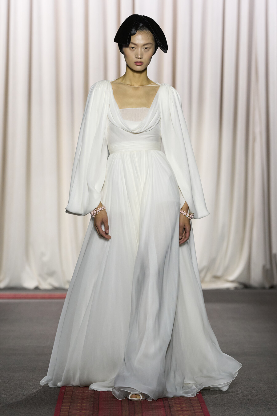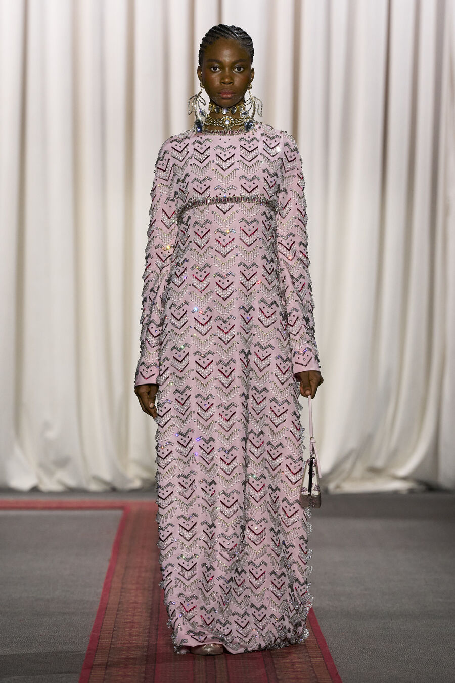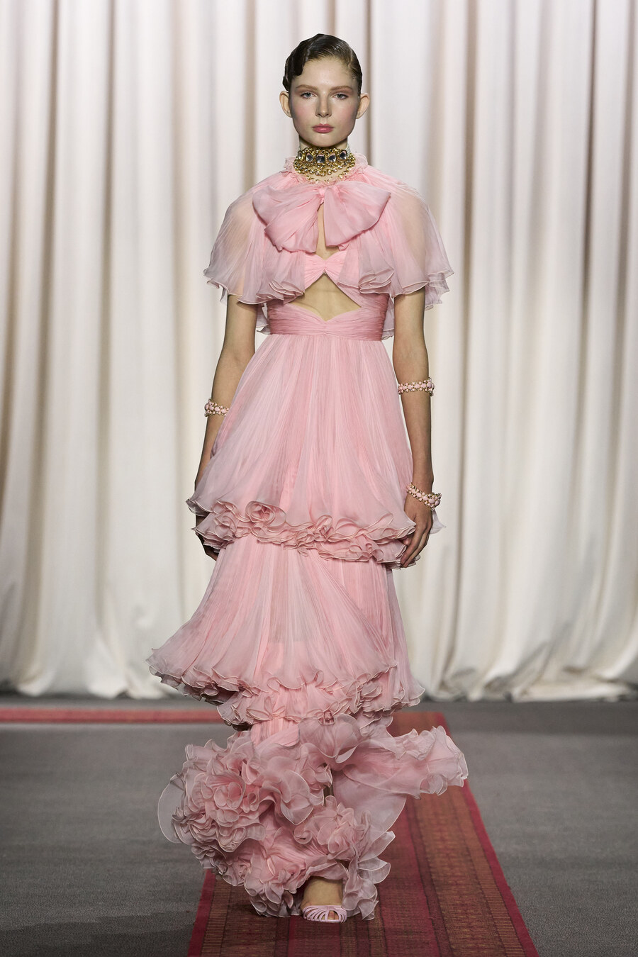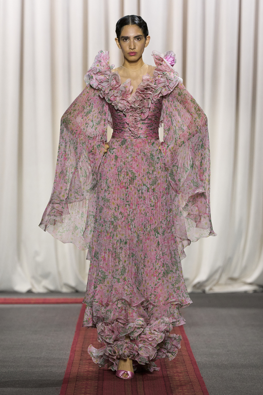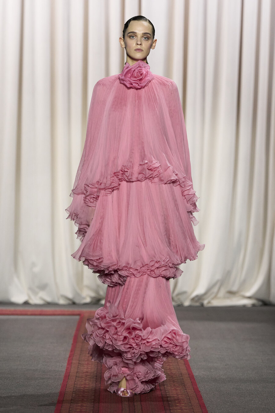 Giambattista Valli’s haute couture shows always have a certain magic about them, and the Spring-Summer 2025 edition was no exception. An iconic aspect of this designer’s presentations is the inevitable moment when one of his signature poofy tulle dresses sweeps gracefully by the front row, a delight for fashion aficionados and influencers alike. This season, the standout in the fantastical lineup was a dreamy pastel-pink confection, adorned with a plissé bodice, a belt crowned with hyperreal fabric roses, and a voluminous skirt that seemed to float effortlessly down the narrow runway.