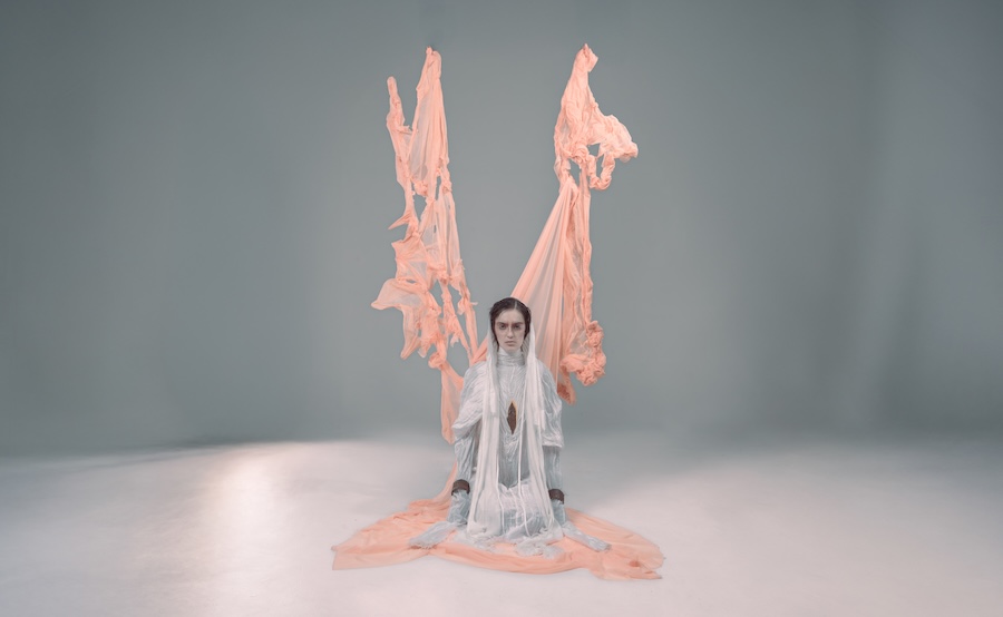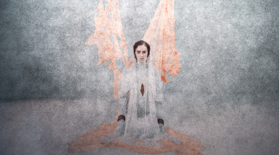 “The borders between worlds are dying, a creature emerges, the spectre of humanity adrift. Its existence unfolds in three movements, Genesis, Morphose, Morta, echoing perception, marginality and mental escapes. Her gestures are slow, her eyes sometimes absent, as if she were listening to another world, inaudible to us.”