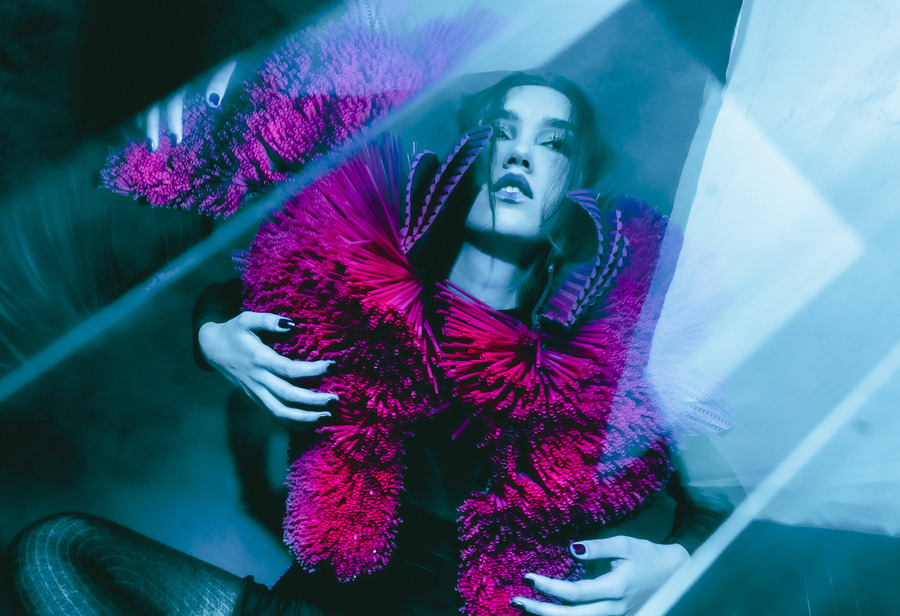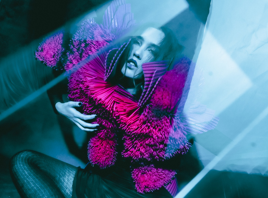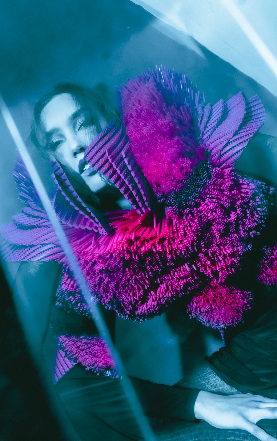 A KALTBLUT exclusive. The creative director and photographer is Nika Ilić. The model is Timotea Topić. Costume Designer, all fashion and styling by Nera Gržin. The designs of Nera Gržin delve into shaping garments using red hues, employing unconventional materials and eschewing traditional tailoring for innovative forms. It seeks to convey the rebellious essence of red through a fashion collection, highlighting textures and sculptural elements. The outcome merges theoretical insights with experimental techniques, yielding fresh forms and a distinct aesthetic.