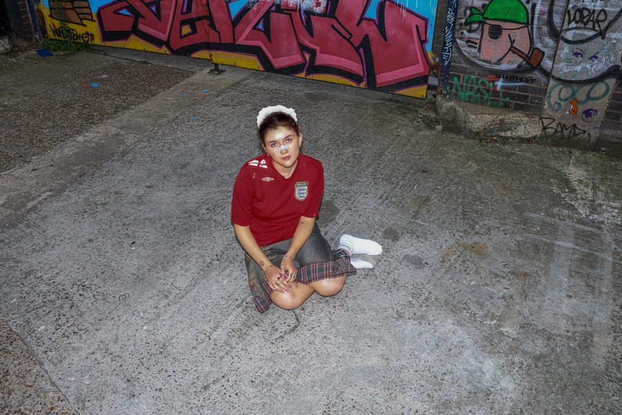 ‘Girls, So English’ is an outsider’s homage to British youth culture, viewed through an observer and consumer lens. Having lived in England for many years, this sense of distance from my heritage shapes my work as I explore themes of identity, belonging, and cultural context through photography. The series explores the duality and layers of identity, from echoing Vicky Pollard to romanticizing England’s cold summer sky, exploring football culture and reflecting the tension between pride and domestic violence tied to the sport. A tribute to Britain’s own Rankin, his work on nudes is woven in, with the subject mimicking poses from his photo book as a metaphor for stripped-down British identity.