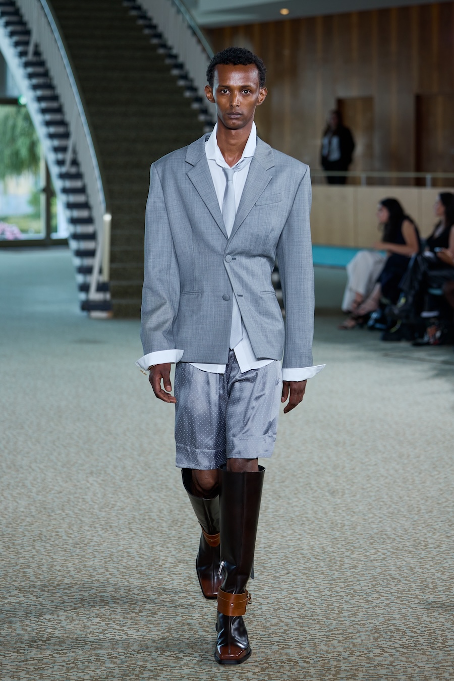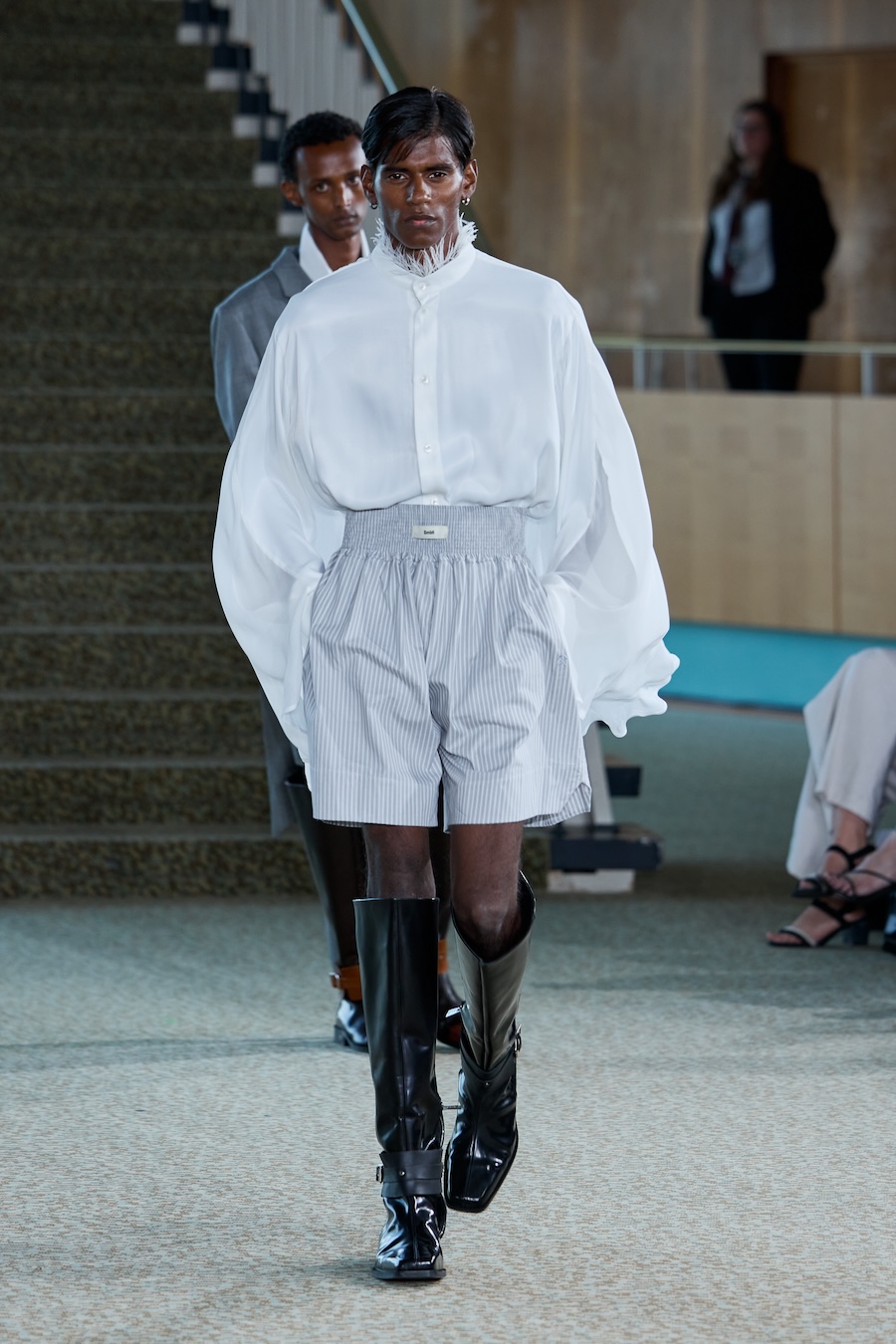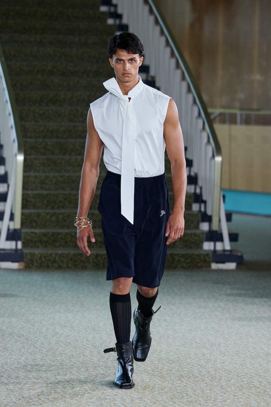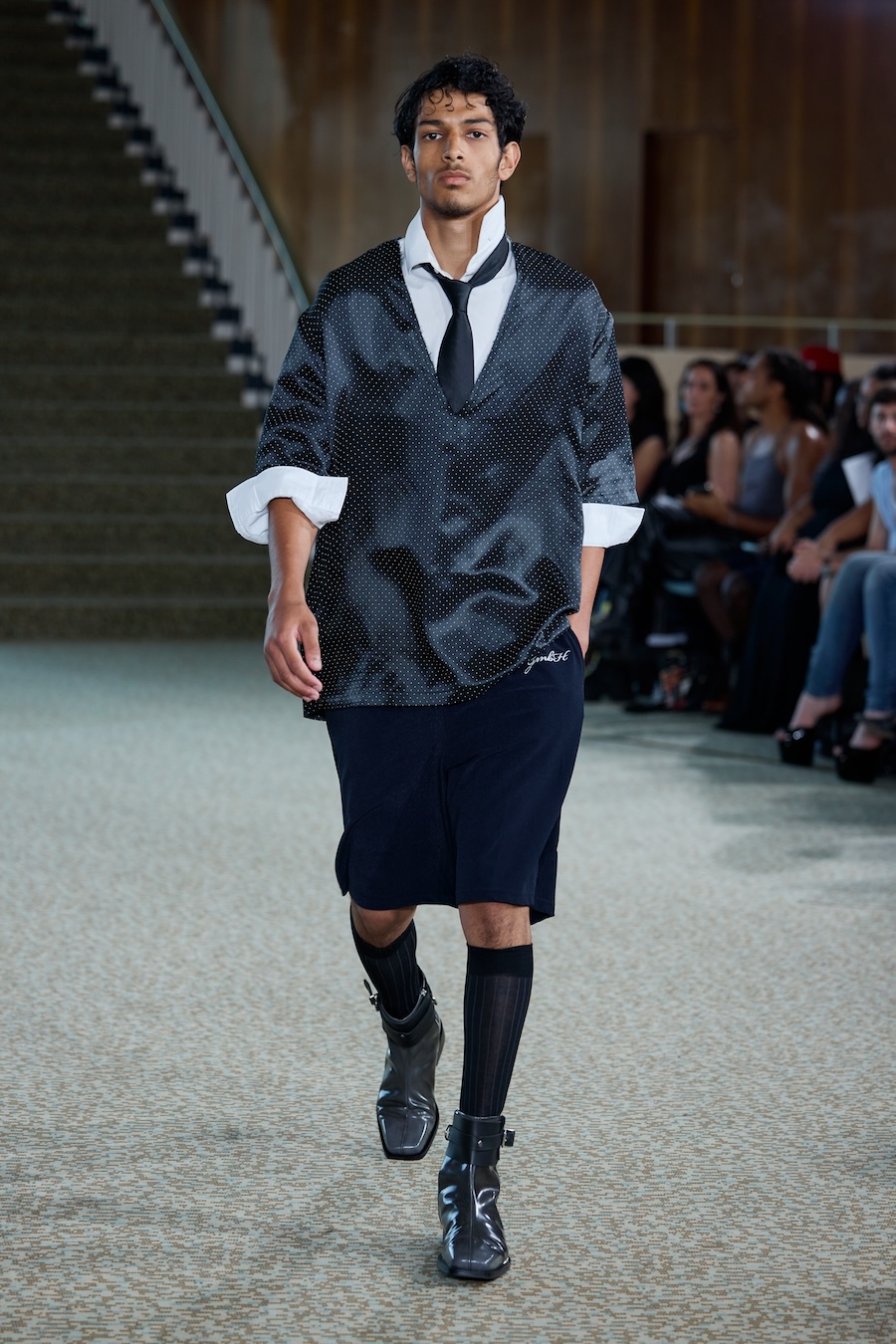 GmbH showcased a stunning array of designs, featuring delicate satin boxer shorts, tailored tops, and shirts that exemplified precision and elegance. Standout pieces included chic crop tops paired with refined trousers, all accentuated by oversized bows on coats and blazers. Many tops boasted intricate bow details and sash-like silhouettes, creating a visually striking aesthetic.