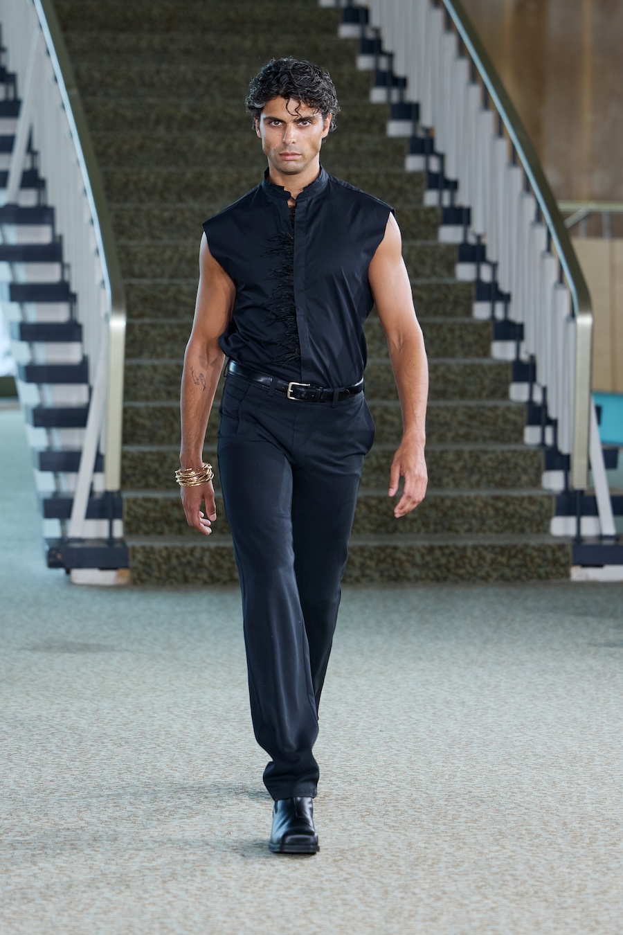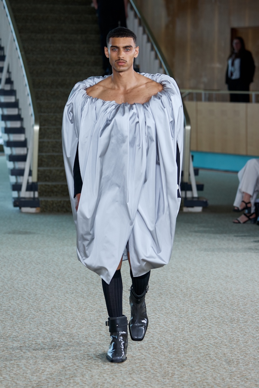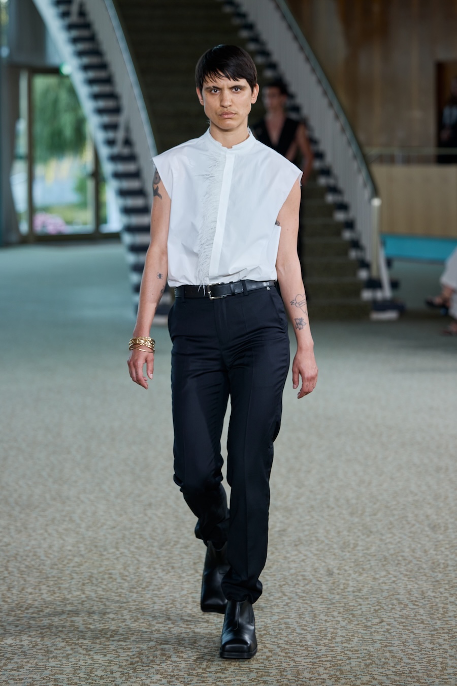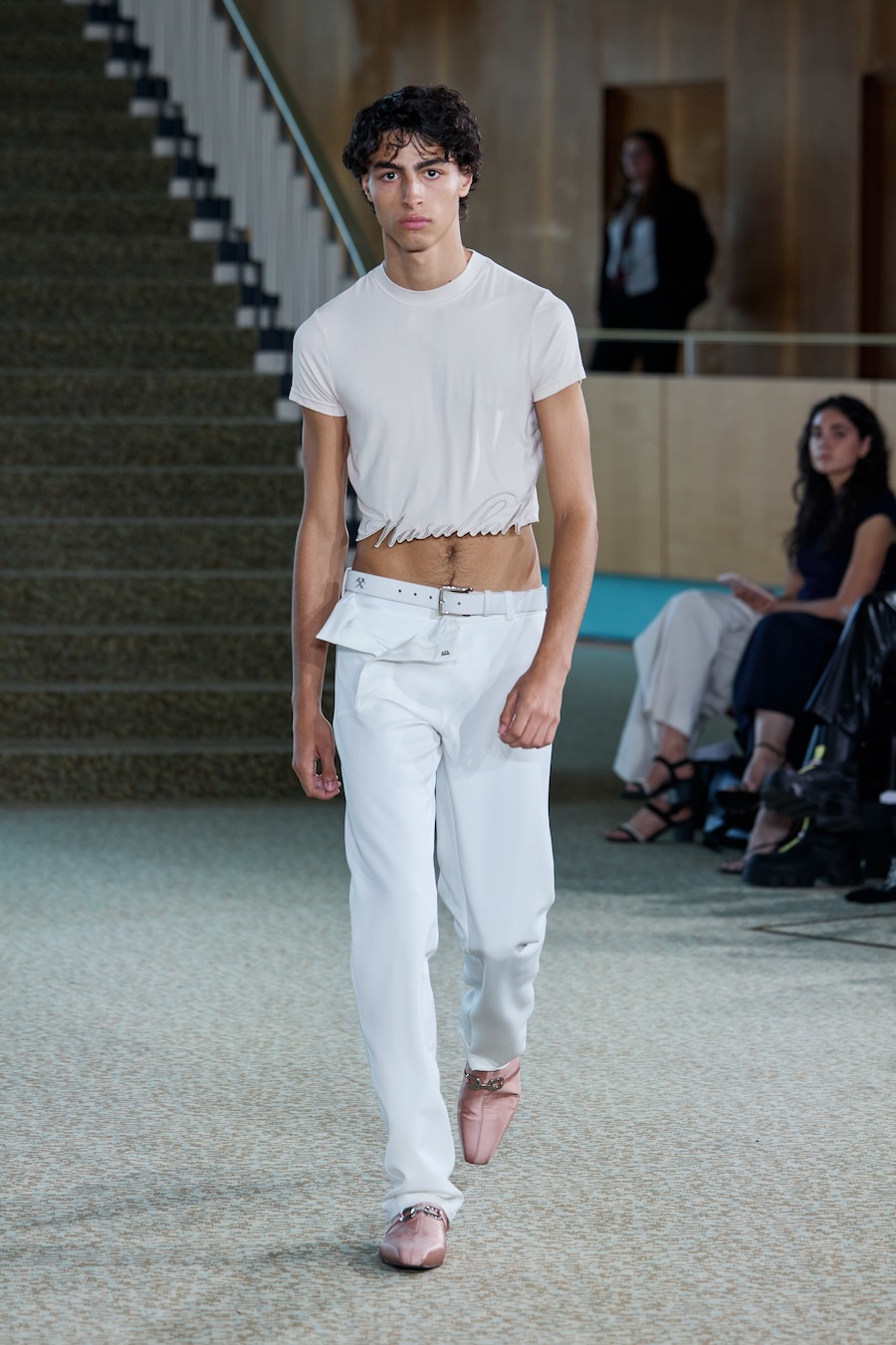 GmbH showcased a stunning array of designs, featuring delicate satin boxer shorts, tailored tops, and shirts that exemplified precision and elegance. Standout pieces included chic crop tops paired with refined trousers, all accentuated by oversized bows on coats and blazers. Many tops boasted intricate bow details and sash-like silhouettes, creating a visually striking aesthetic.