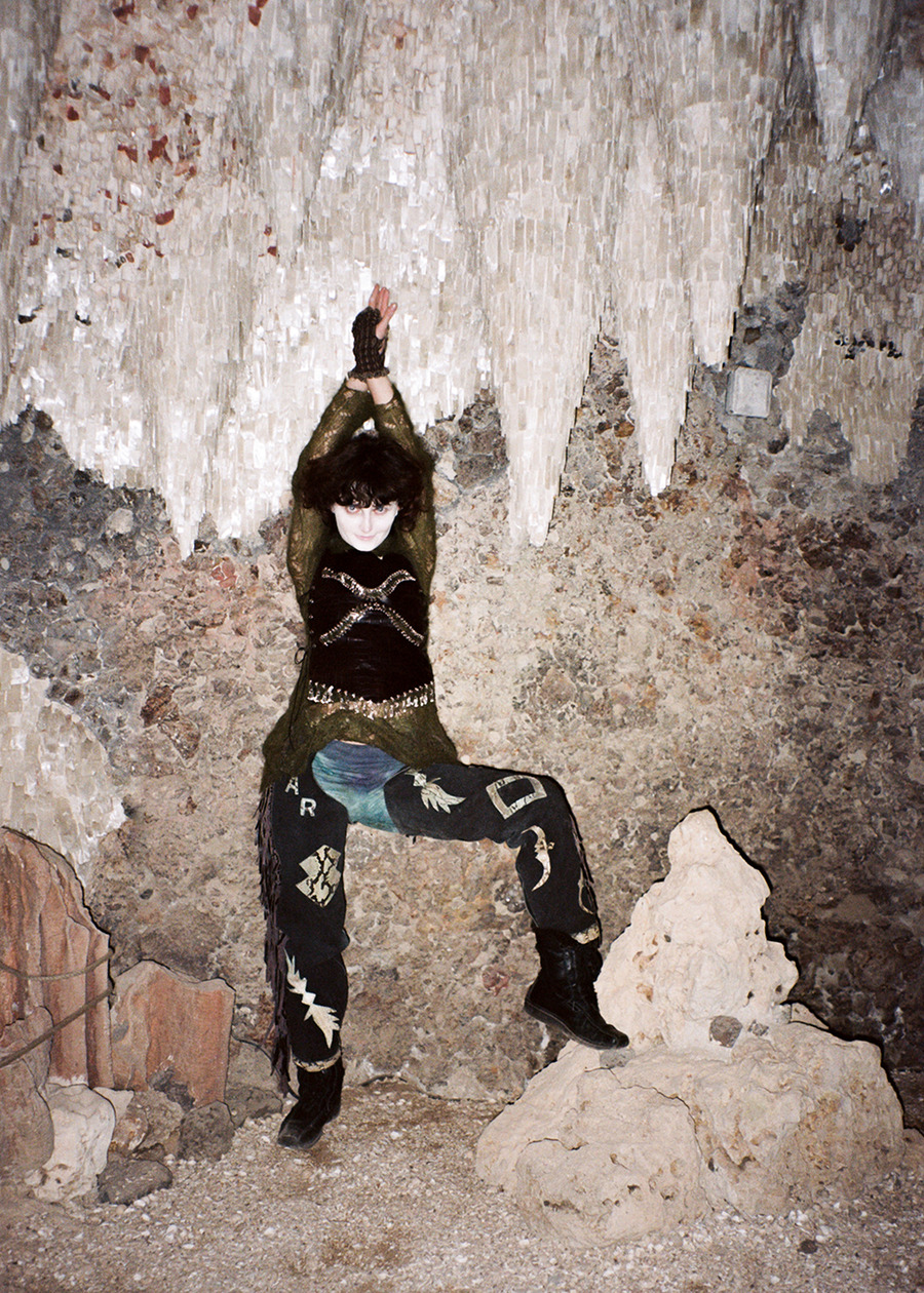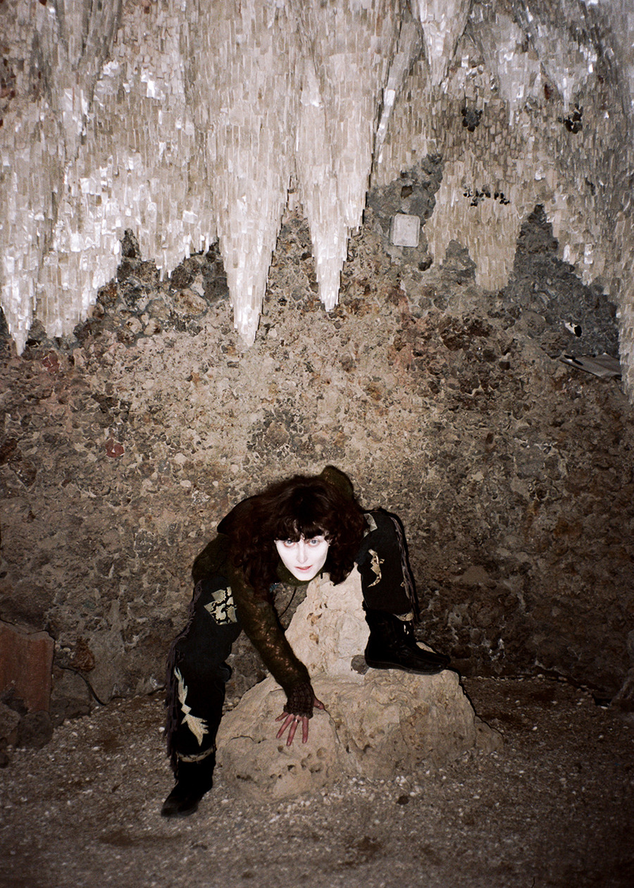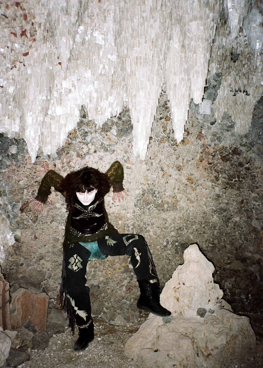 Although goblin mode was added to the Oxford dictionary in 2022, its aesthetic is in need of some refinement. In this editorial, moss colours combine with the protruding rock surfaces of Painshill Park in Surrey to imagine a 21st century goblin in the peace of their own domain.