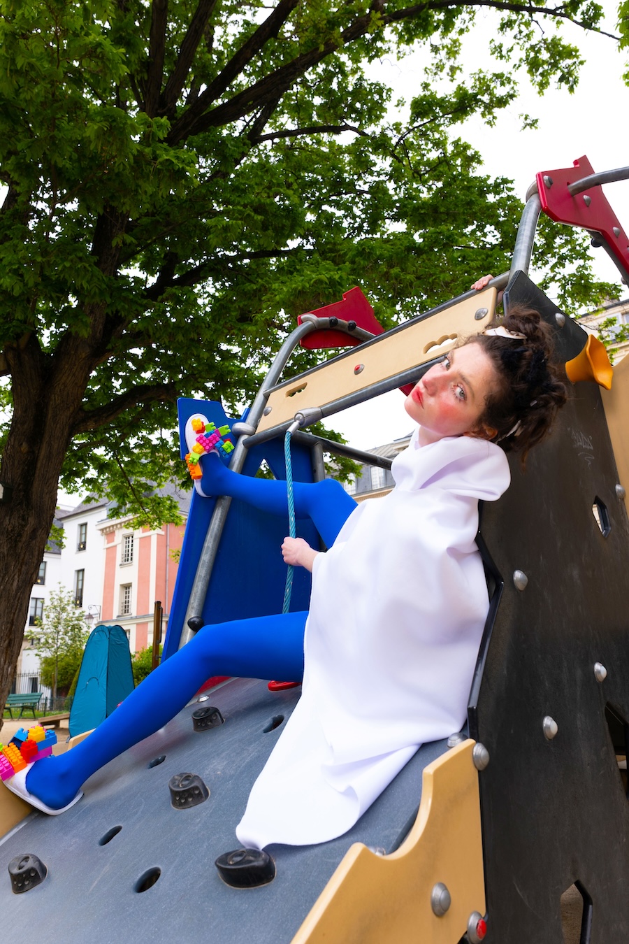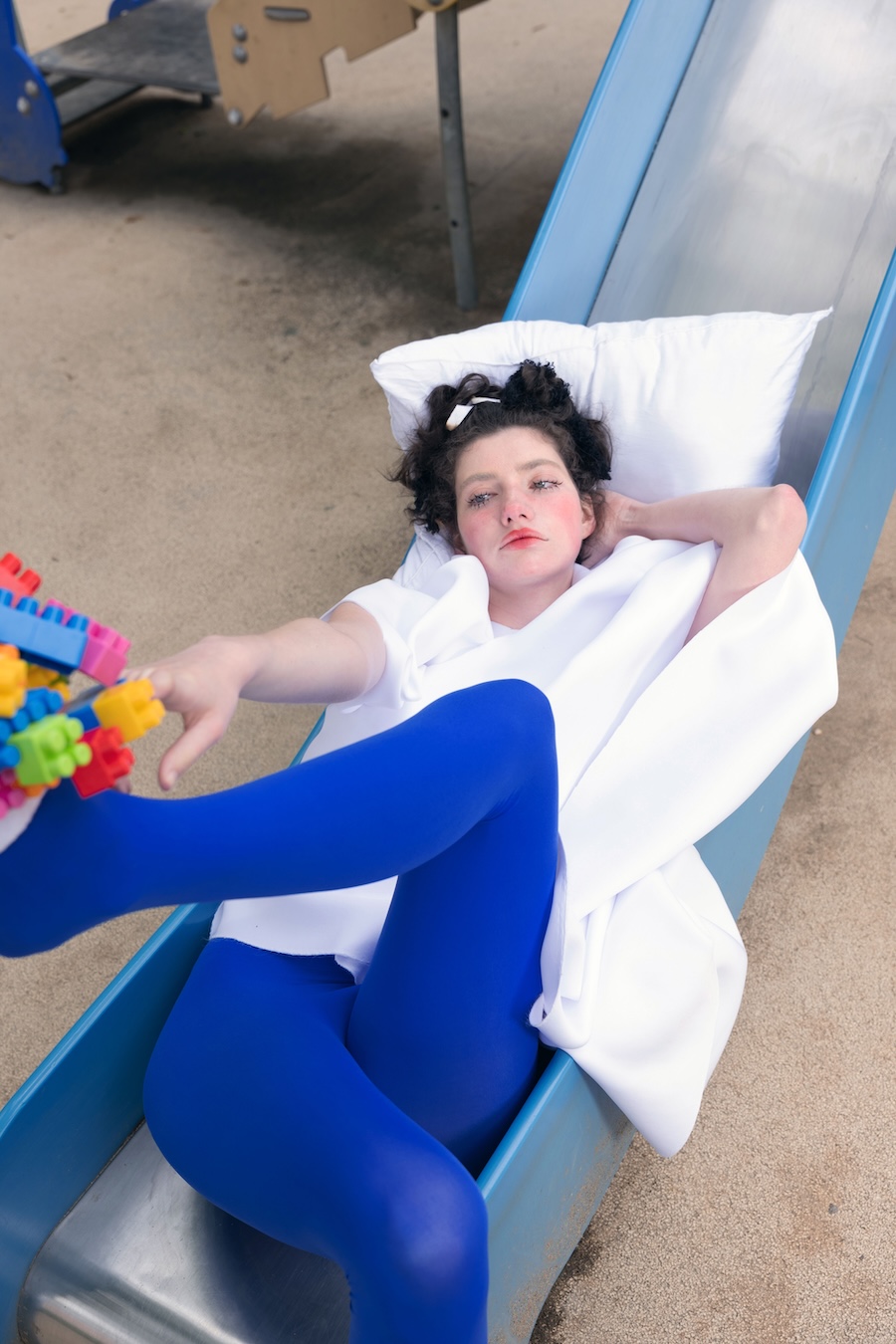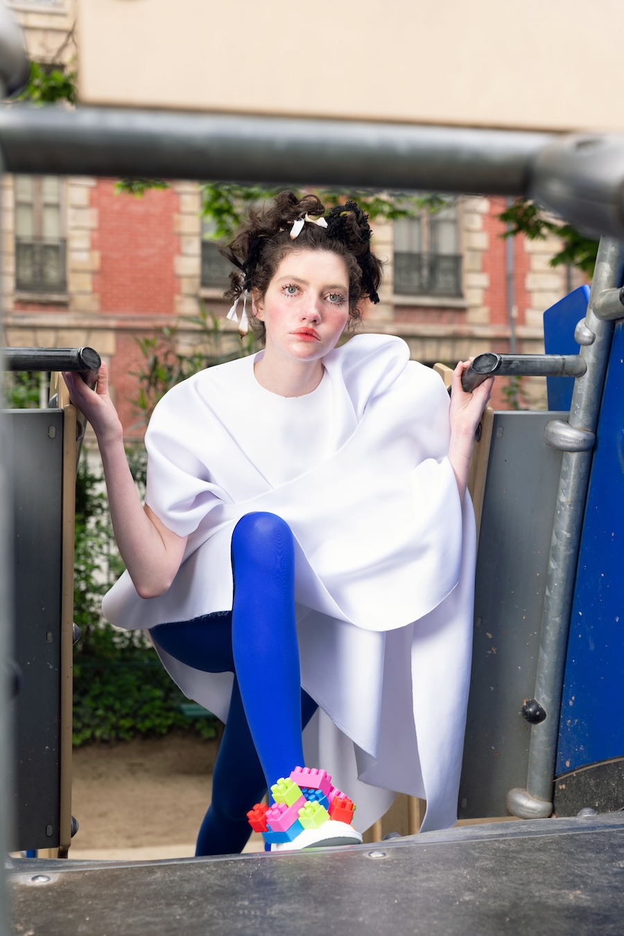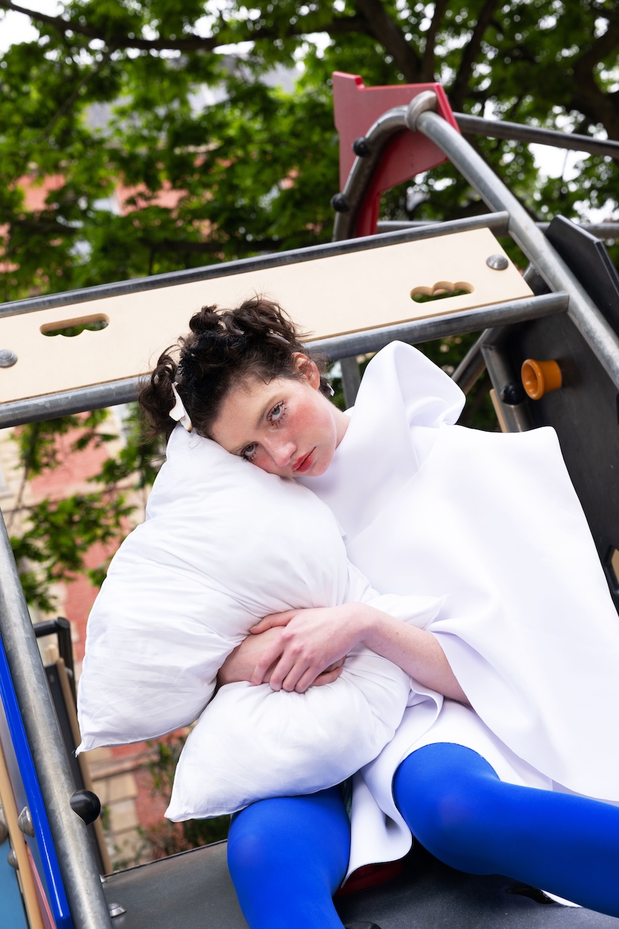 In this editorial, GOD, Are You Watching?, I translated the emotional conversations I’ve had with my childhood misfortunes into garments. Moments where the playground — a space meant for joy — felt more like a prison are reflected through asymmetric silhouettes and oversized volumes, echoing a childlike form haunted by unease. The second look explores my “good girl complex,” in which I appeared angelic on the outside while feeling empty within.