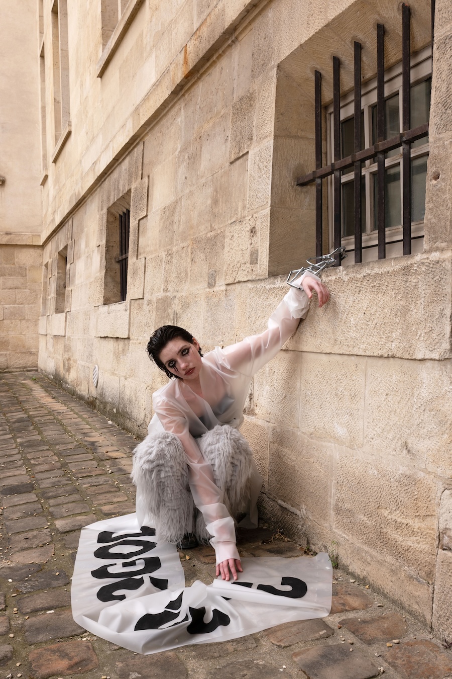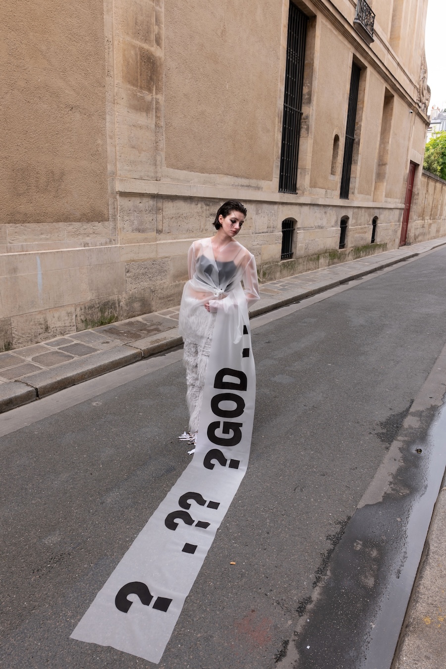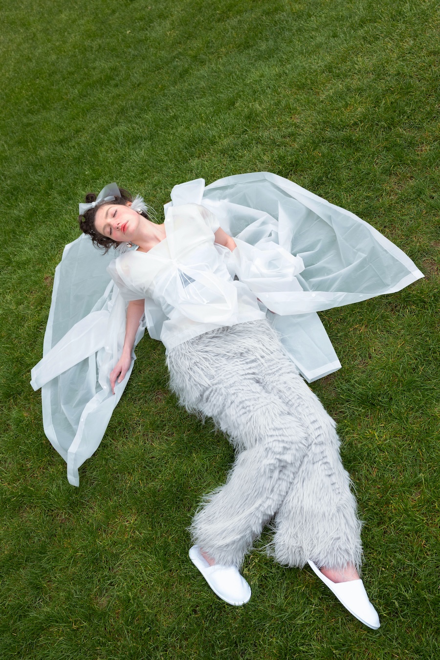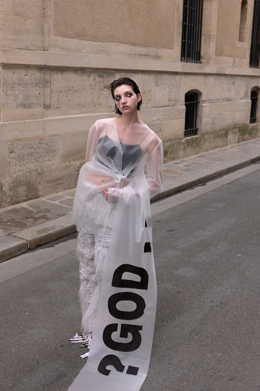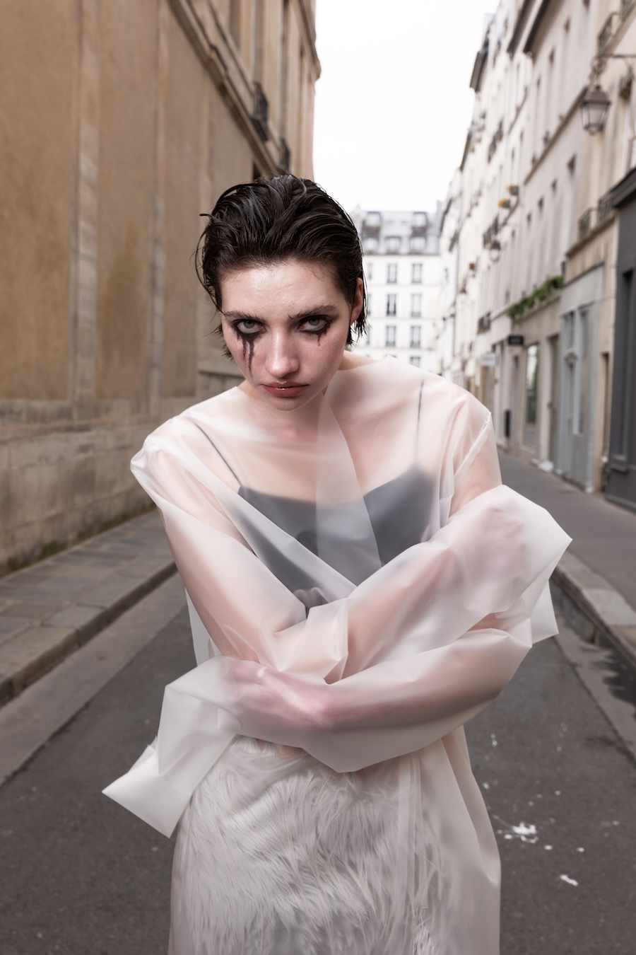 To express this, I connected three raincoats to create wings worn backwards, placing a hood at the front to visually represent the negative space — a symbol of emotional hollowness. The final look features a draped latex coat, where the subtle transparency reflects my tears.