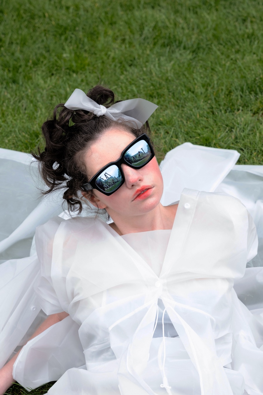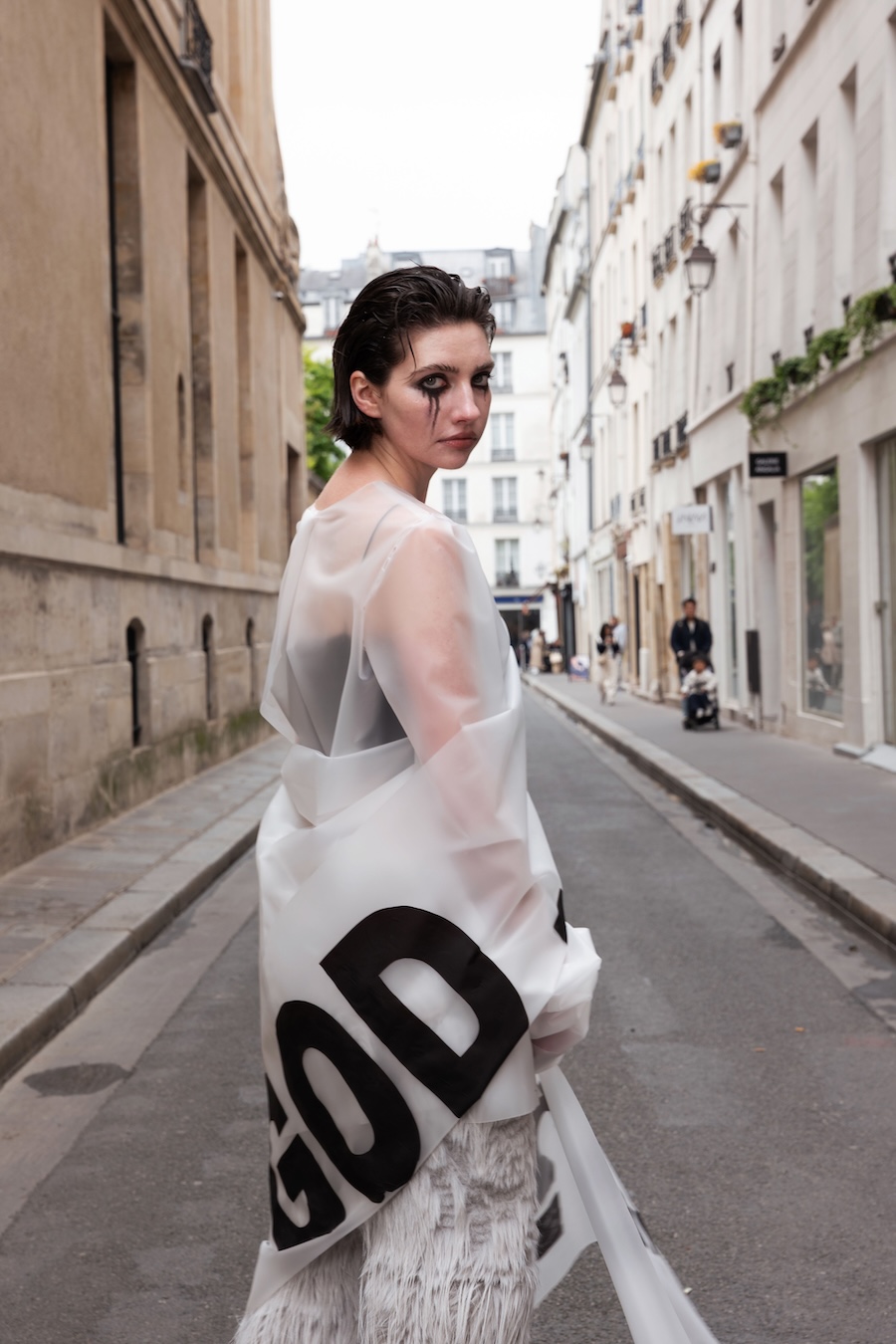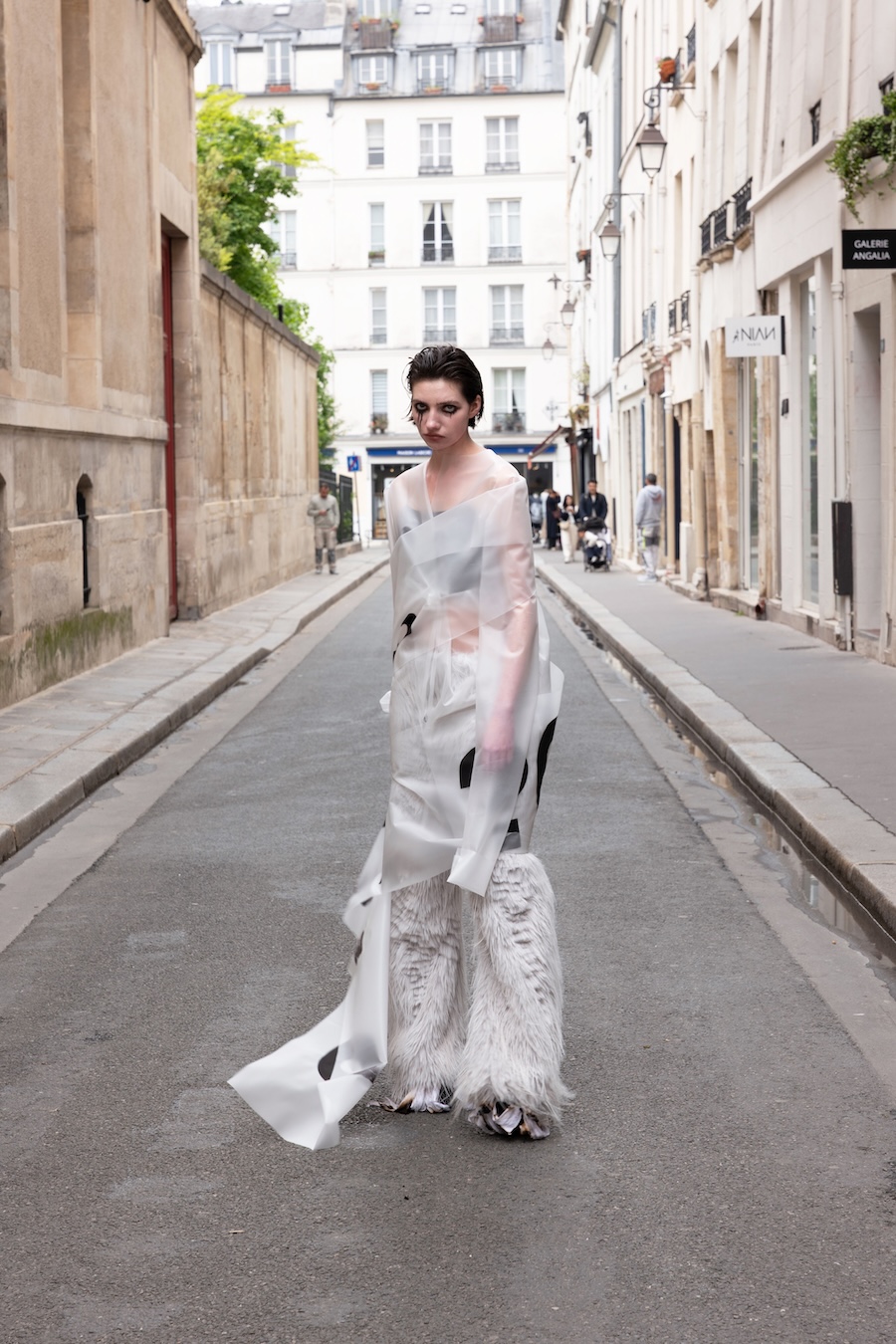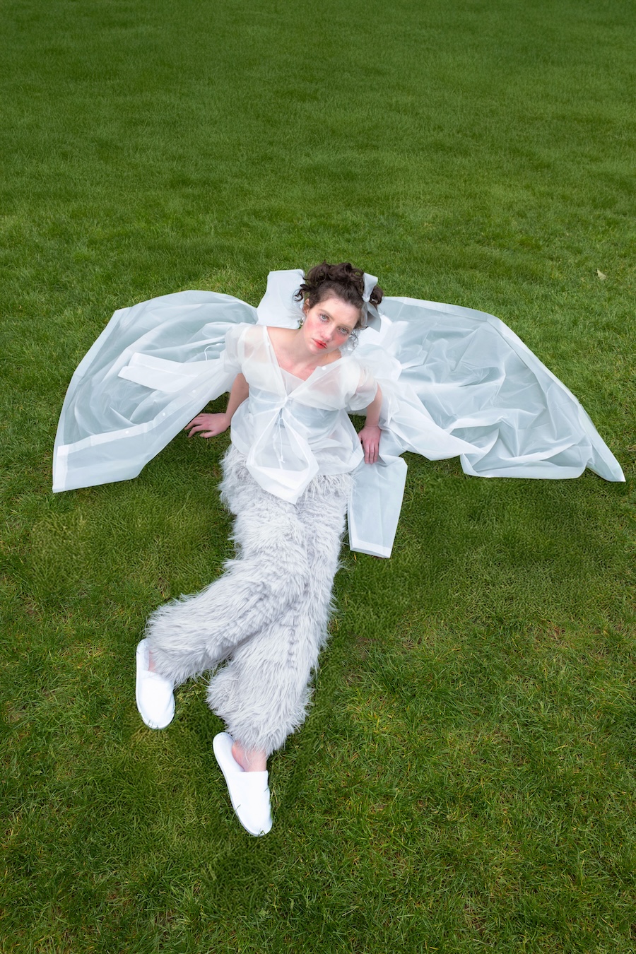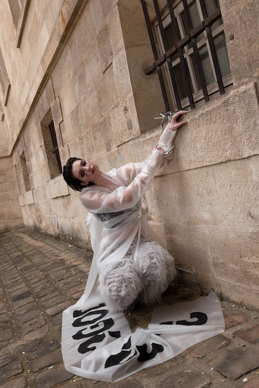 To express this, I connected three raincoats to create wings worn backwards, placing a hood at the front to visually represent the negative space — a symbol of emotional hollowness. The final look features a draped latex coat, where the subtle transparency reflects my tears.