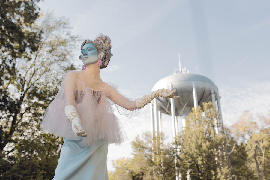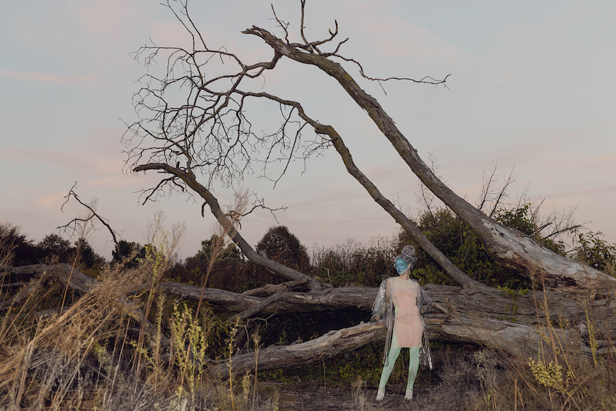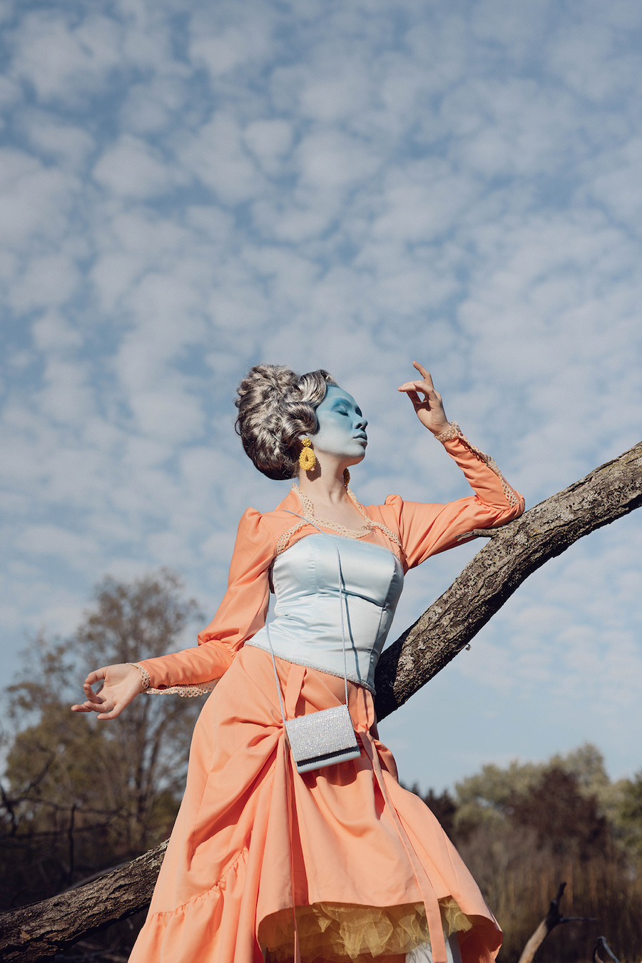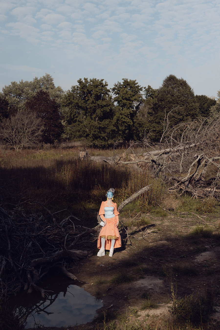 Going Up? was planned and executed in collaboration with a local, fully vaccinated team wearing masks during all preparations. “We did not want our need to create outweigh our responsibility to our community to limit the spread of Covid-19, so all safety precautions were taken in every step of planning.” The location for the shoot was chosen for its proximity and atmosphere, which until recent years was a manicured golf course. The restoration of the landscape is bringing about long-term substantial improvements to water and air quality in the nearby city where the team resides. “I walked here a lot in 2020 and 2021,” Leigh Ann said,“seeing nature reclaim a previously manipulated landscape was really restorative. I wanted this shoot to be as much about sometimes-wanting-to-get-out-of-here as it is a celebration of those people putting in the work to make this world a better place. Without the efforts of those empathetic people Earth would be void of humanity.”
