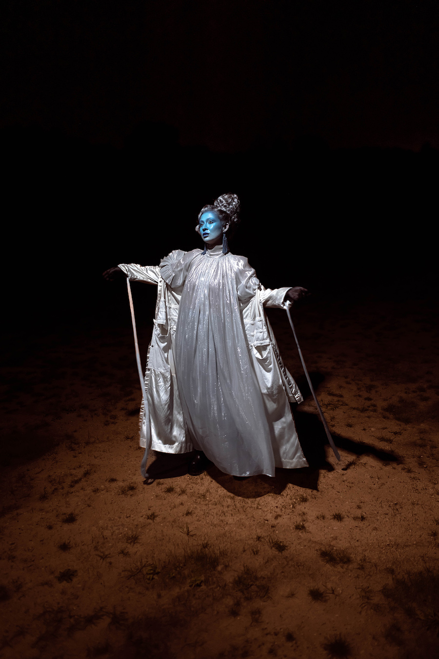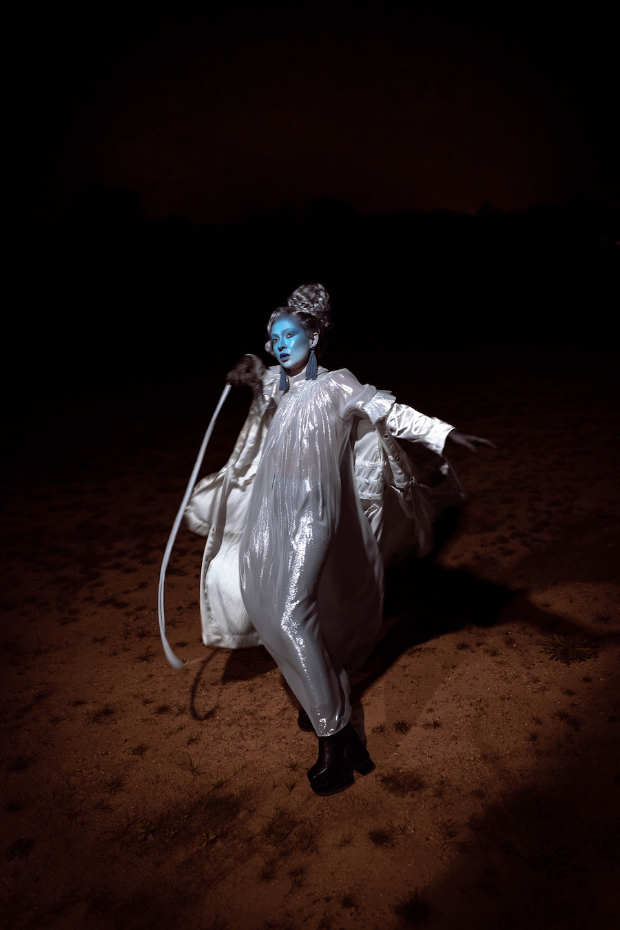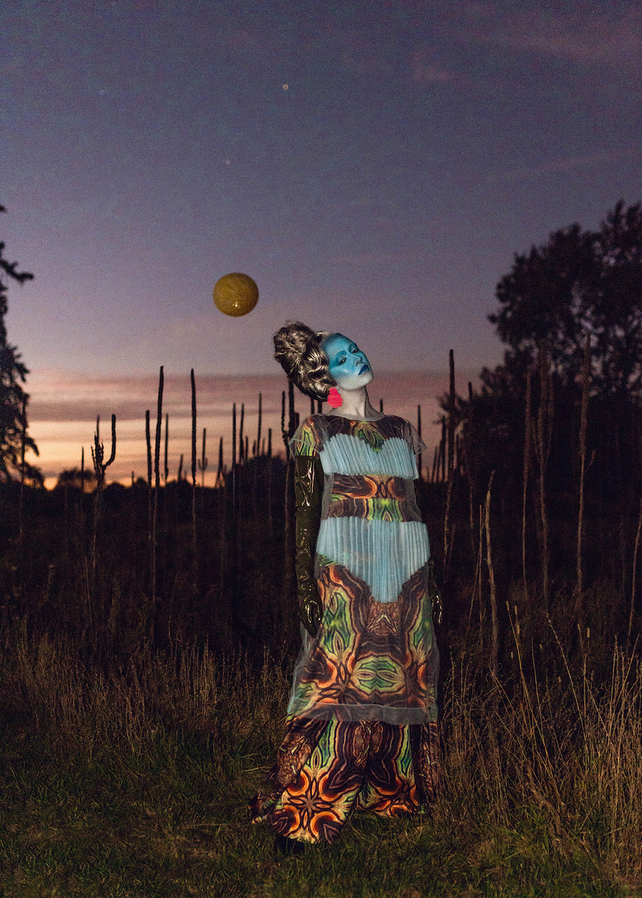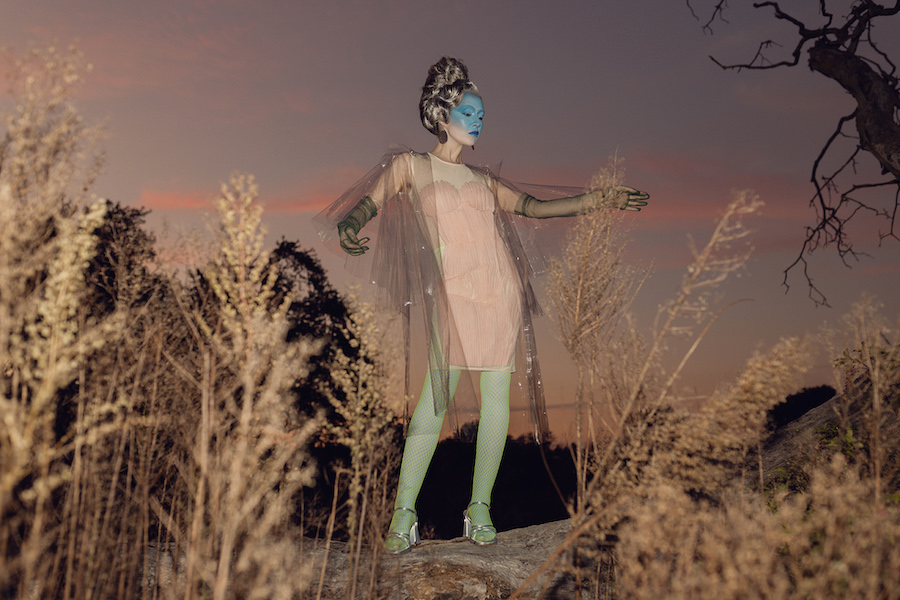 “I will be the first to acknowledge that the alien concept is a bit played out,” she confesses, “But it’s a theme I couldn’t get away from when living through the sci-fi-like experiences of the past two years; and then two months before shooting this editorial the US Department of Defense released an official report on the existence of Unidentified Flying Objects(UFOs), and I can’t think of one time I heard anyone talk about it. There were too many other pressing matters to discuss. How wild is that?” The same month the UFO story broke The White House reported plans to combat rising gun violence, and amid vaccine hesitancy, indicated that the nation will miss its July 4 partial vaccination goal just as the Delta variant began to present a serious challenge in controlling the COVID-19 pandemic in the US and worldwide. “There were moments where all I could think is ‘just get me out of here,’ but really the thing I wanted most was to reconnect with my creative community and focus my energy on something constructive.”