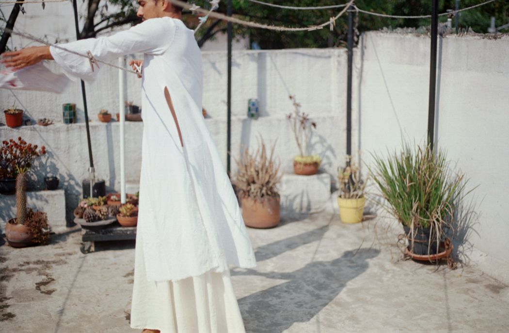 A KALTBLUT exclusive. Photography by Genevieve Medow Jenkins. Model is Carlos Altamirano in Mexico City. Styling by Gabriella Zamora using Golondrina Collection. “Growing up in Big Sur, California, my photography is heavily influenced by the natural atmosphere and the things that inhabit that space. My relationship to capturing moments began with a 35mm camera I purchased in a nook of Neuköln in Berlin 6 years ago. I have worked in analog ever since, whether it be fashion, lifestyle, art or tour photography. In this series, I wanted to capture a slice of the beauty of Mexico City with work of a local designer and model. The goal is to always convey authenticity in all of my work and Mexico City is so vibrant and alive, as are the artists there. Clothes made of organic cotton sewn by one woman in the Yucatan feel nostalgic even in a bustling city that is now bustling with tourism and change. I love capturing this liminal space and time and the people who exist within it.” says Genevieve Medow Jenkins.