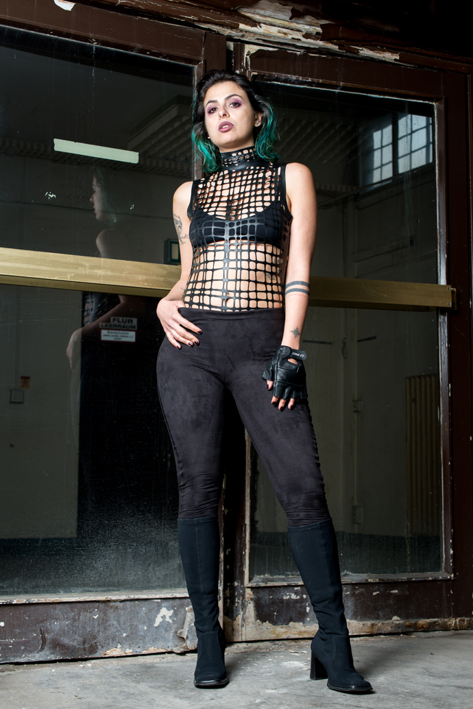 A KALTBLUT exclusive.Photography by Jeremy Knowles. Styling by Tødd Hödson. Model siModel Ginevra Venutolo. Fashion by Perlensäue, ASOS, Agustin Noguera just to name a few. Grunge type of fashion is currently taking over, with brands such as ‘THRASHER’ known for skaters it’s filling youth culture in cities worldwide. But in Berlin this is the ‘normal’ for the Berliners or the people living here. All black everything is probably the most used hashtag in Berlin as the streets are full of looks mainly dominated by the colour black. Not just in the evening just as much in the day, people still manage get creative with it and stand out from the crowd. Clothing used is a mixture of Berlin based designers including vintage and motorbike accessories to complete the perfect ‘Berlin Grunge Trend’. This editorial was to give influence to others who think the colour black is a ‘safe’ option, but it’s nothing of the sort. If you are inspired by these looks then be sure to head over to the designer concept store, Level Eight in Mitte where all times are available including Jade Helene designs. Also HUMANA vintage stores or online at ASOS Deutschland.