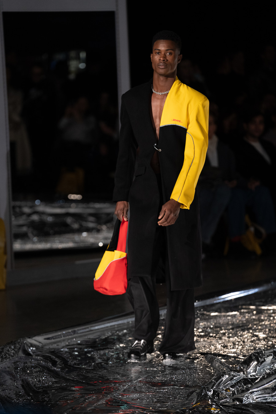 The collection owes its name to the concept of Circular Fashion, a cause close to Haderlump’s heart. “The name represents our approach to repurposing and the careful management of resources,” stated Haderlump’s Creative Director Johann Ehrhardt. But there is more to this collection than sustainable fashion. “It was also about merging our design language with the identity of DHL credibly and engagingly,” Ehrhardt continued, indicating the brand’s significant development. “Haderlump usually focuses on black, so DHL’s iconic red and yellow workwear posed a particularly exciting challenge. The combination of DHL’s colours, their materials, and our distinctive cuts and shapes has given birth to ‘Circularis’—a truly unique and new creation aimed at circular transformation through sustainable repurposing.”