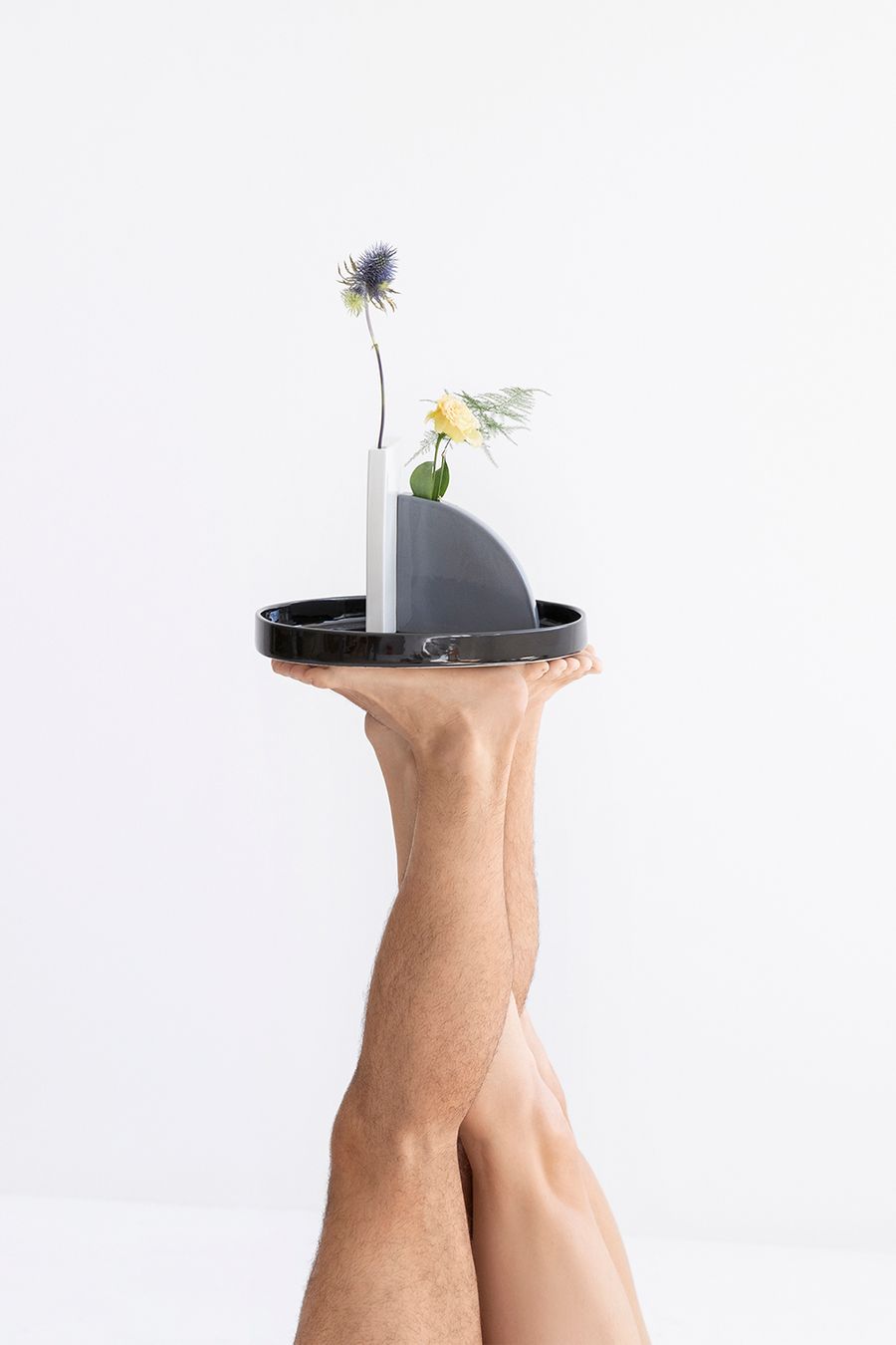 Curves of flat colour give shape to fully functional pockets on voluminous totes and smart wallets, reminiscent of physical extensions to painted artworks. Innovative ceramic flower holders with geometric silhouettes, cherish the Japanese philosophy of Ikebana. They highlight the flora’s natural beauty, embracing minimal aesthetic and functionality. A series of limited-edition rugs and throws stand as contemporary textile collages, combining opulent fabrics with modest ones, completing the brand’s leading line of products.